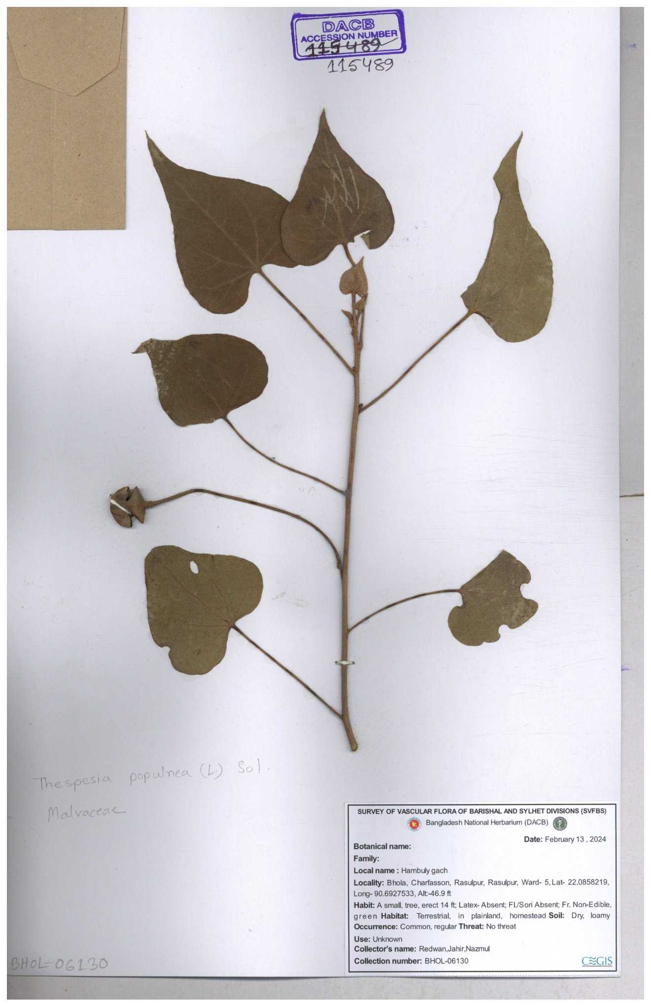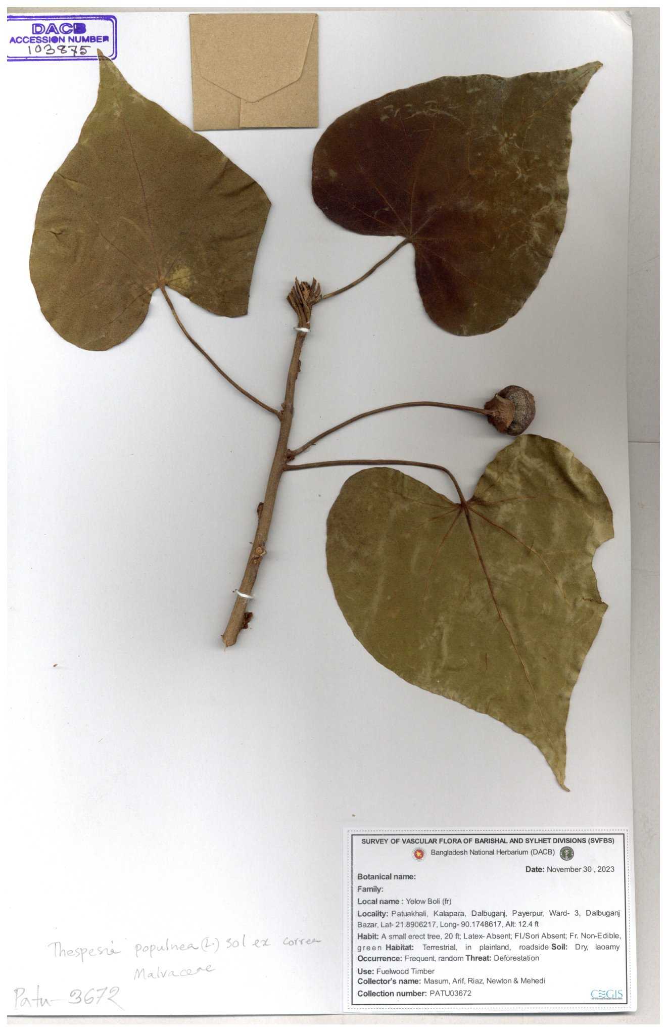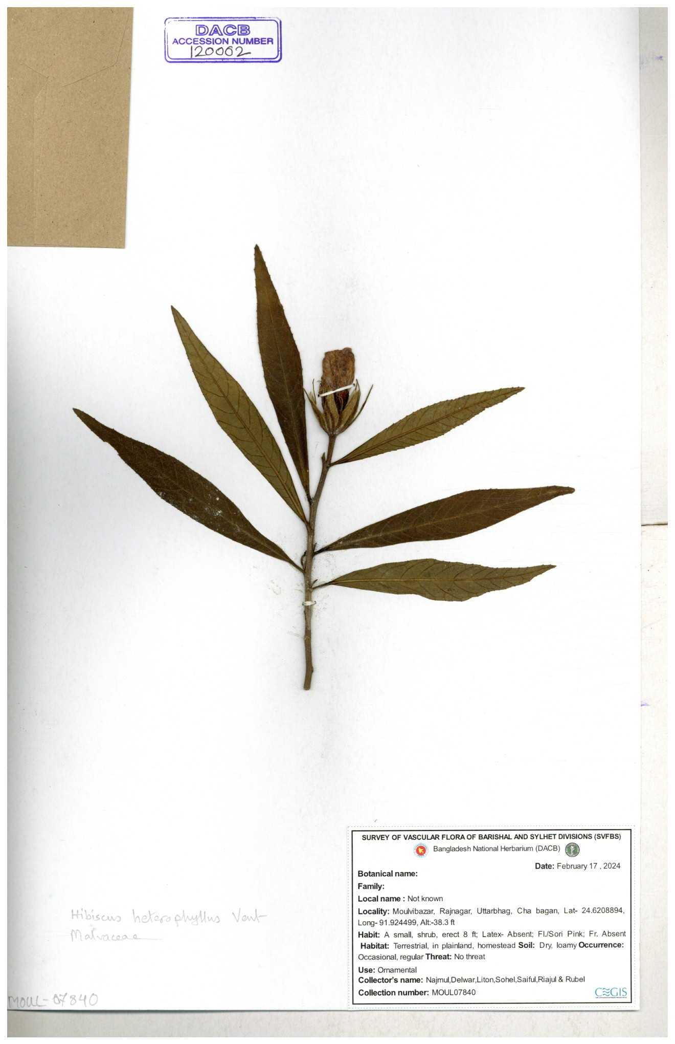 | 62042 | Malvaceae | Hibiscus tilliaceus L. | Bolla | Niyamul Kabir & Mehedi Hasan | NK-7477 15-02-2018 |