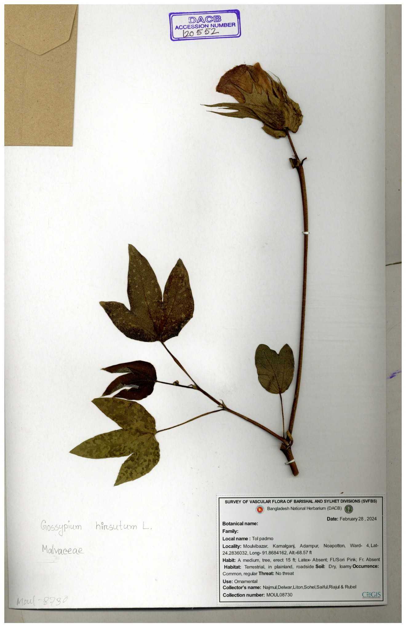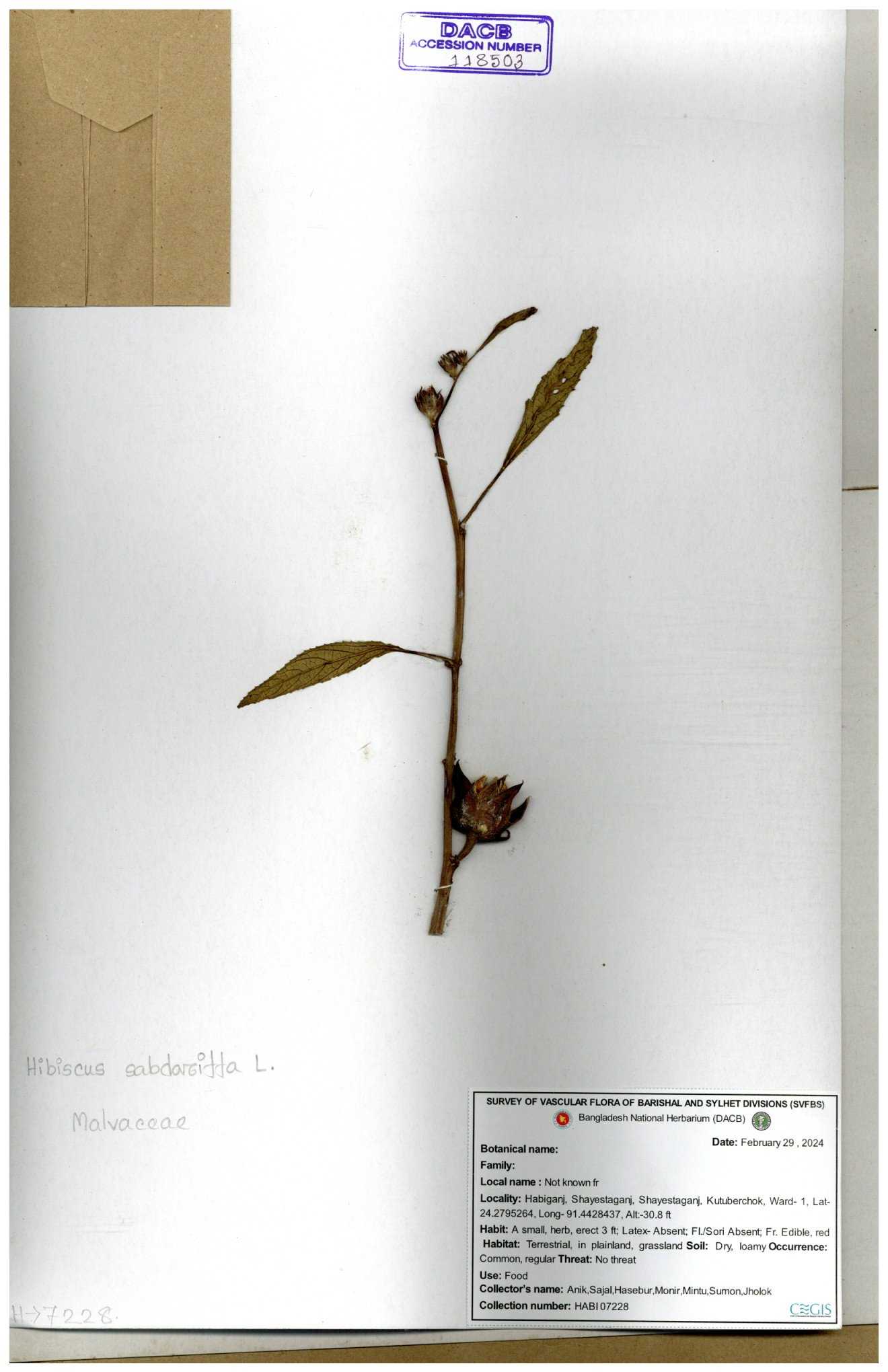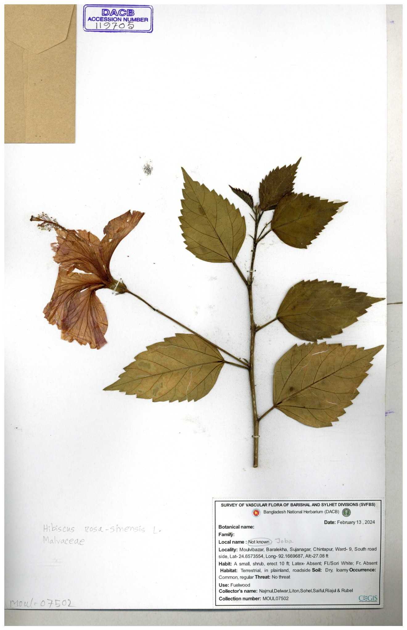| 62042 | Malvaceae | Hibiscus tilliaceus L. | Bolla | Niyamul Kabir & Mehedi Hasan | NK-7477 15-02-2018 |