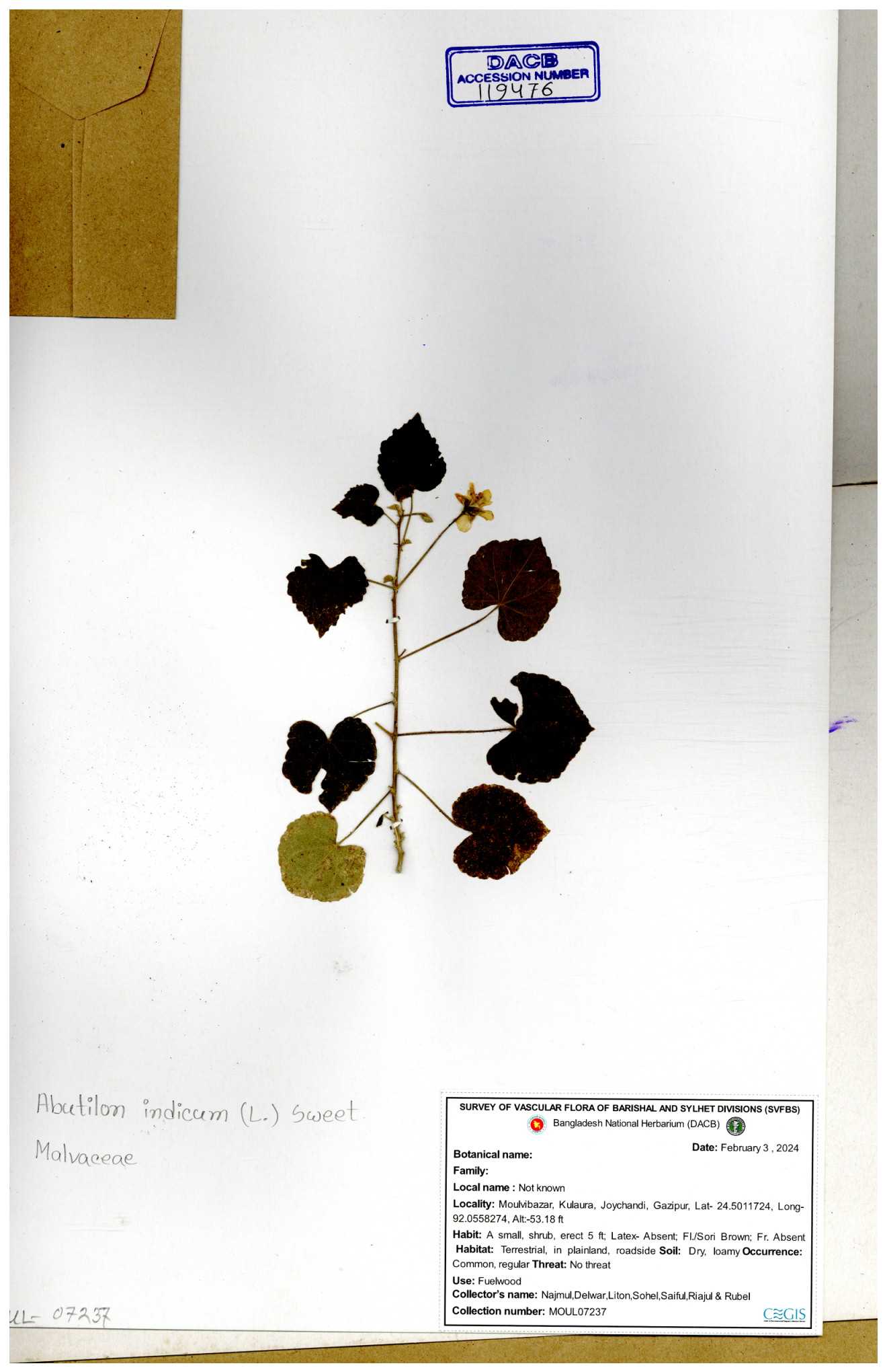 | 39940 | Malvaceae | Abutilon theophrasti Medik. | Harun & Rahman | SH- 531 18-07-2001 |