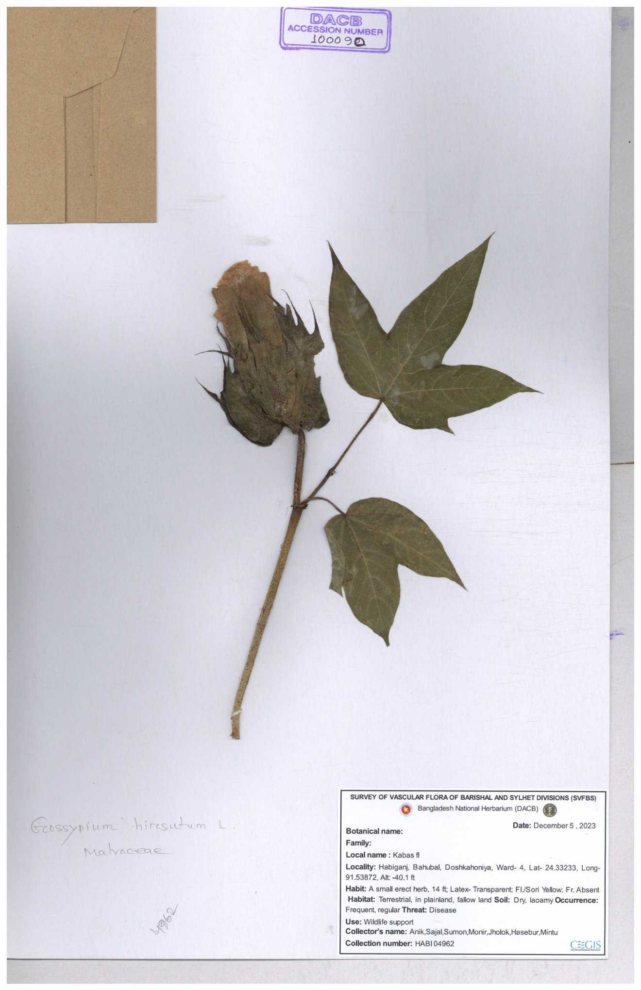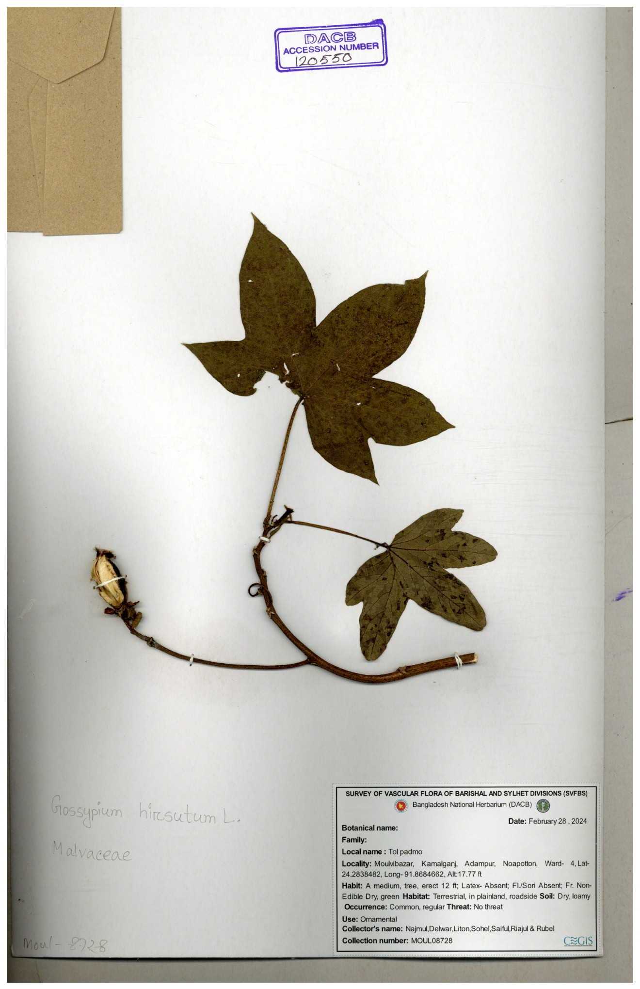 | 55196 | Malvaceae | Abelmoschus moschatus Medik. | Ban-Dherosh | Md. Moniruzzaman, Al-Amin & Kawsar | MAK- 7700 20-02-2018 |