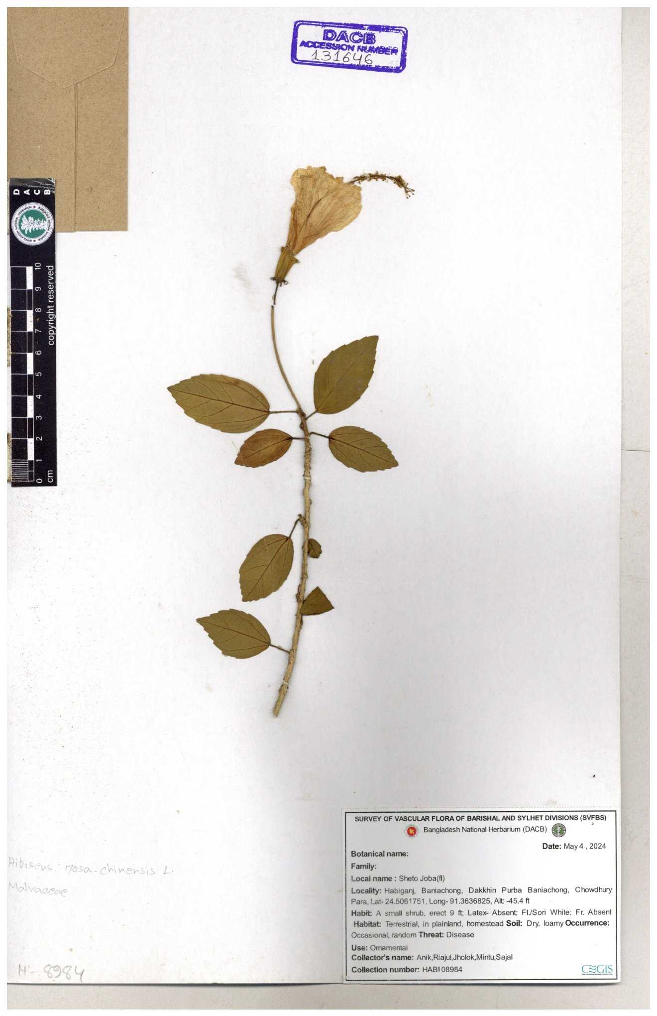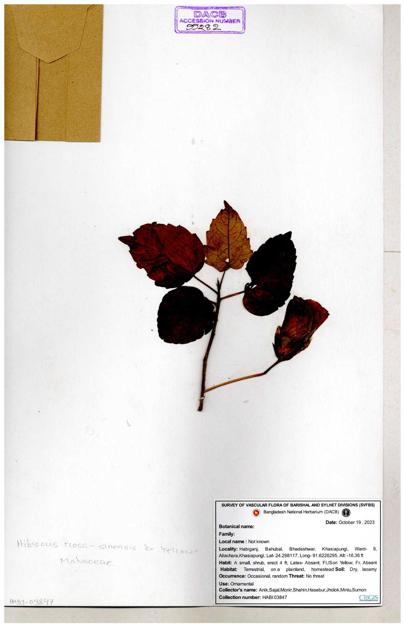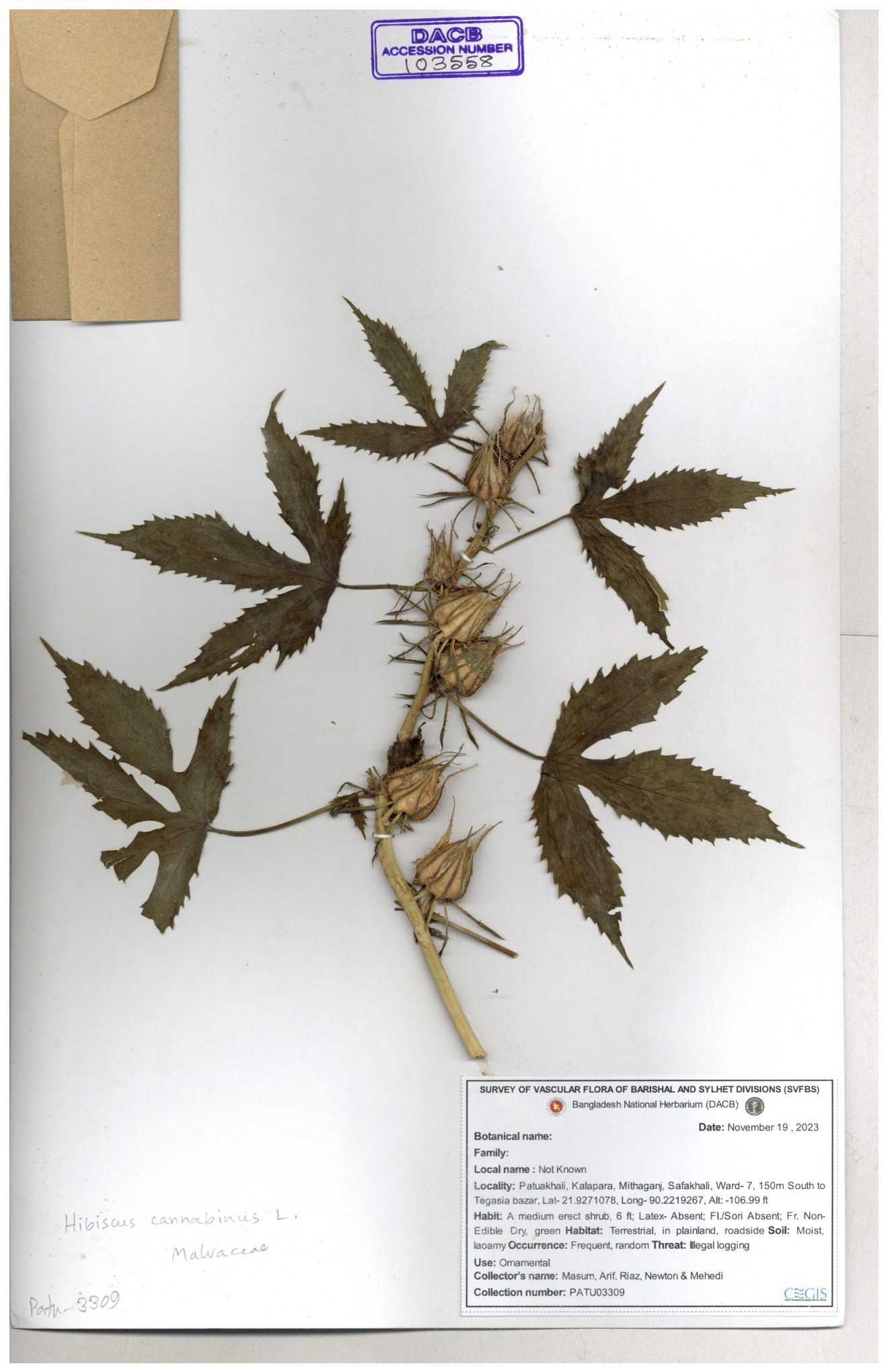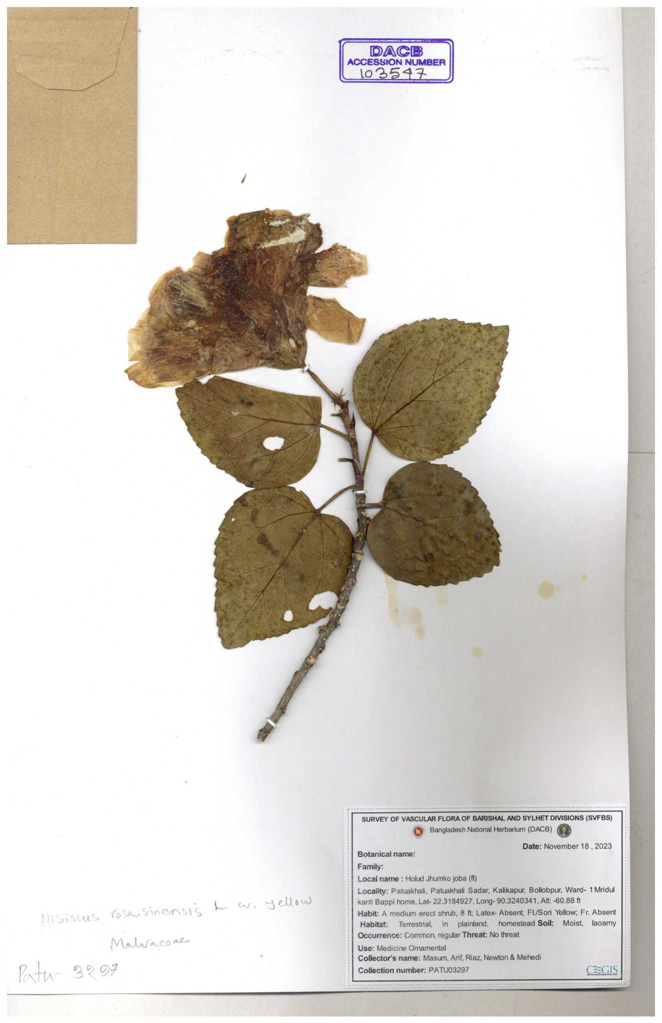 | 73313 | Malvaceae | Abelmoschus moschatus Medik. | Kalokosturi | MS Islam, MKR Rahman & MR Miah | IH-4135 13-02-2017 |