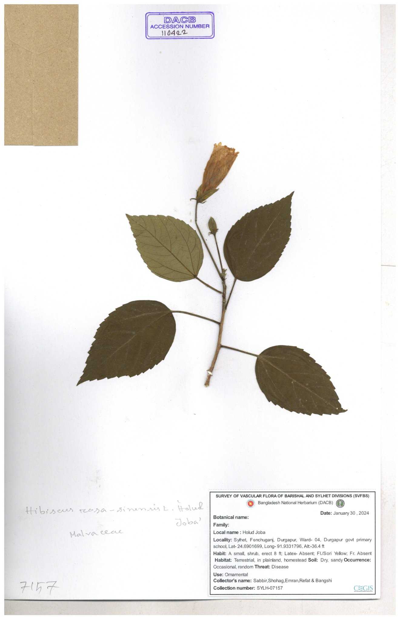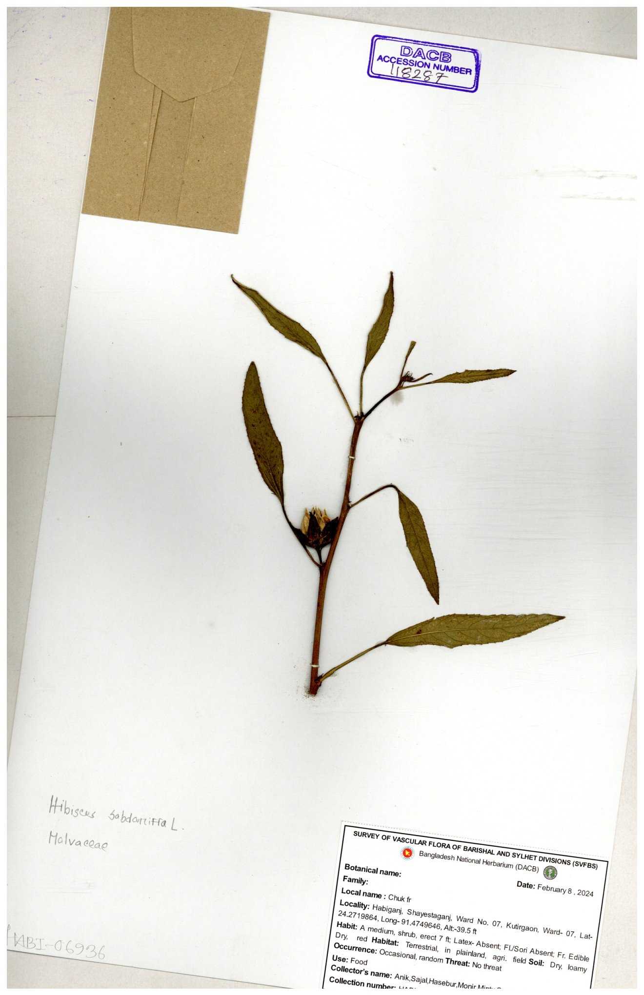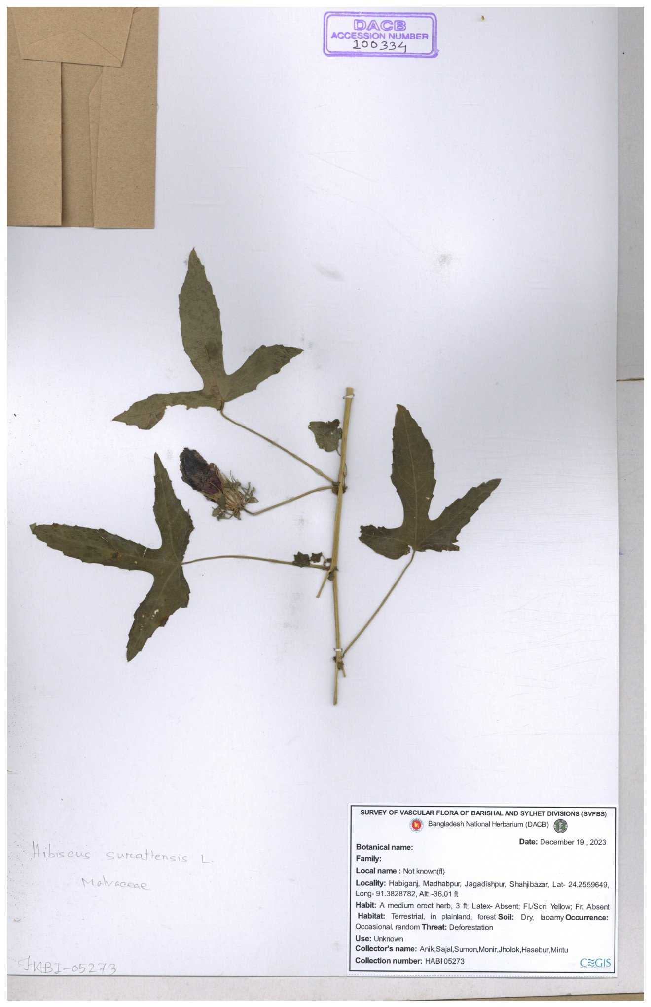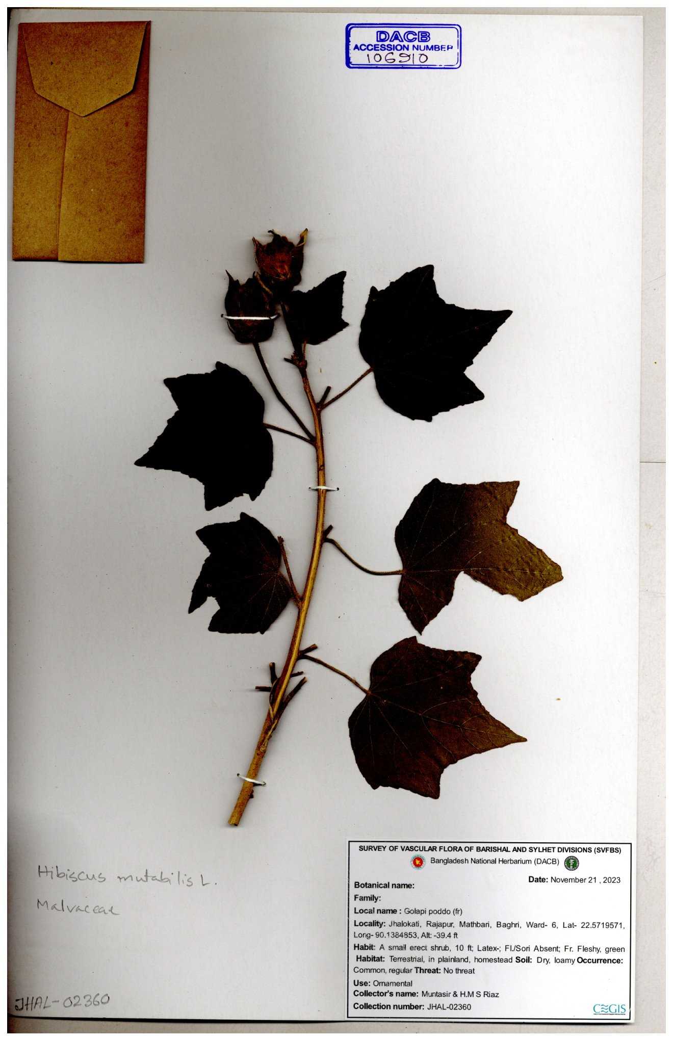| 73313 | Malvaceae | Abelmoschus moschatus Medik. | Kalokosturi | MS Islam, MKR Rahman & MR Miah | IH-4135 13-02-2017 |