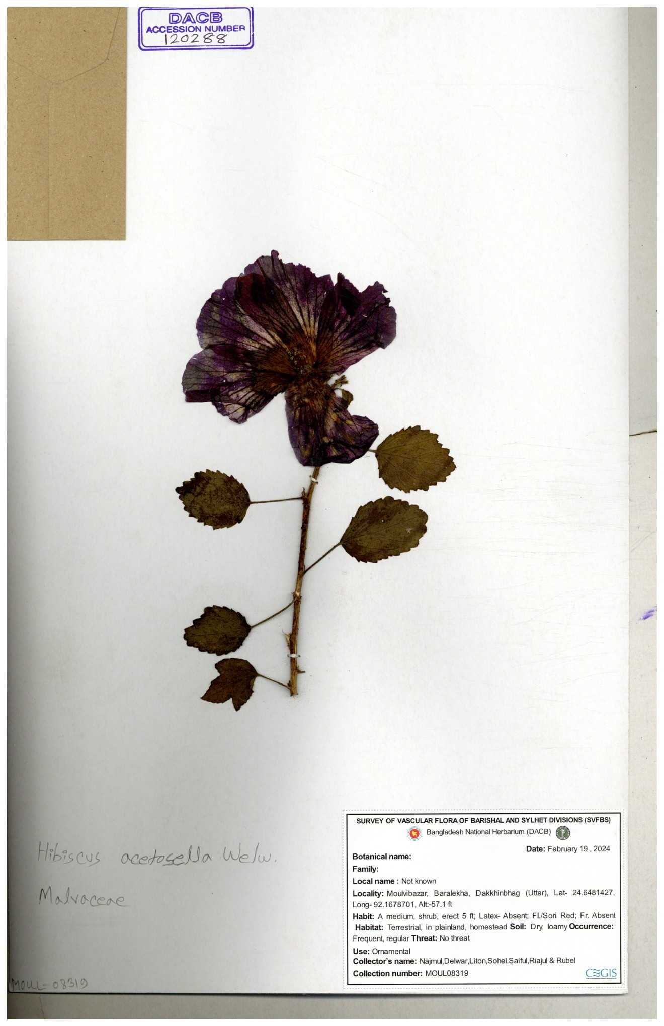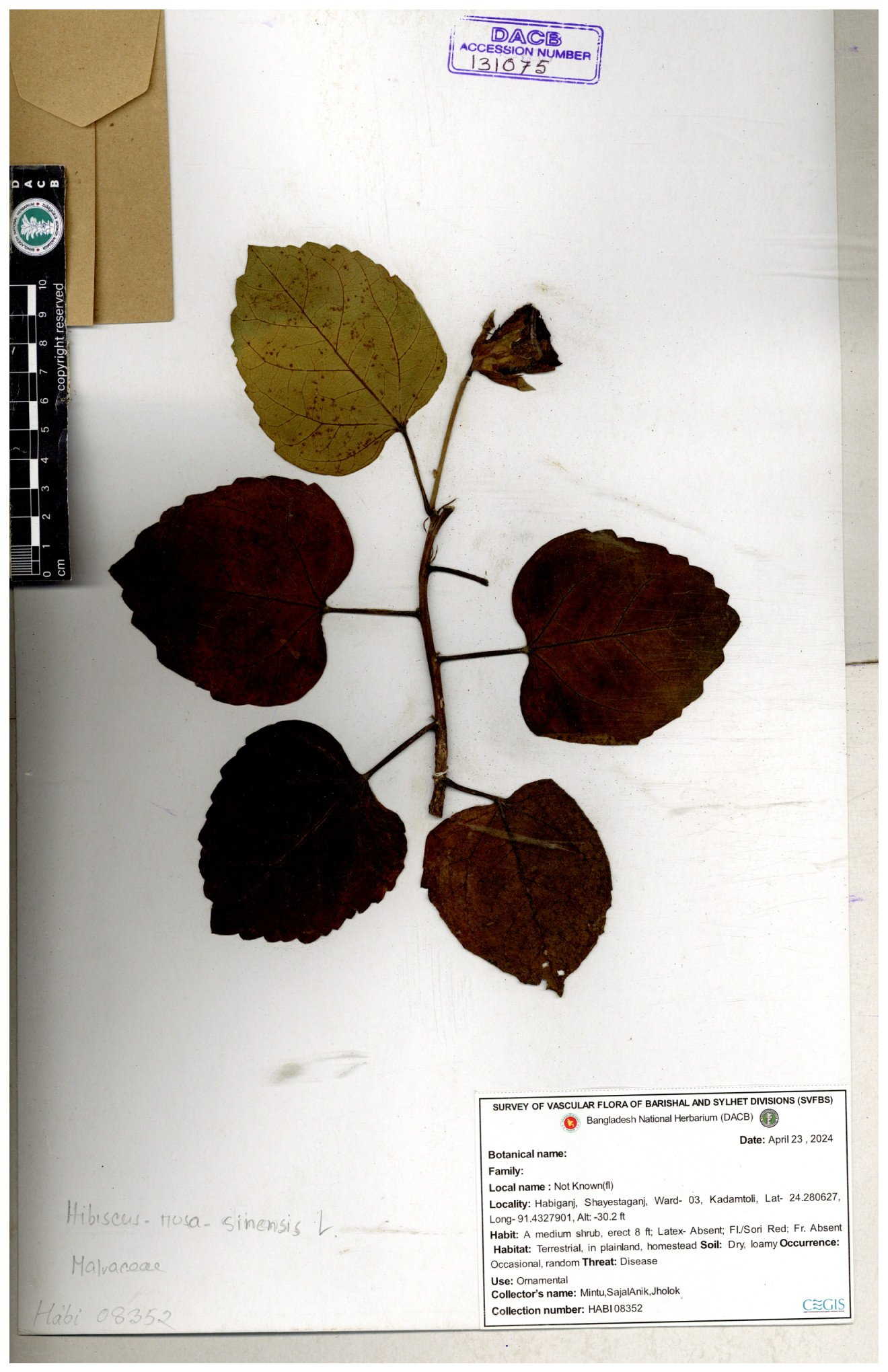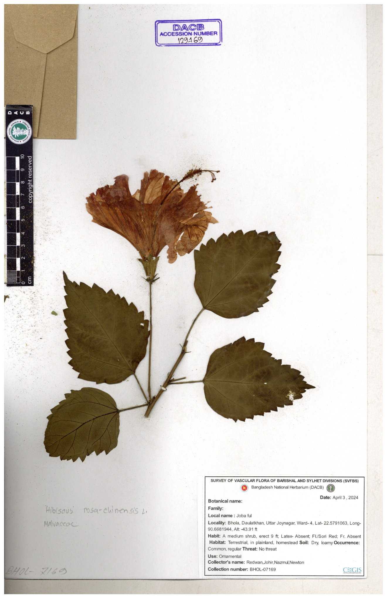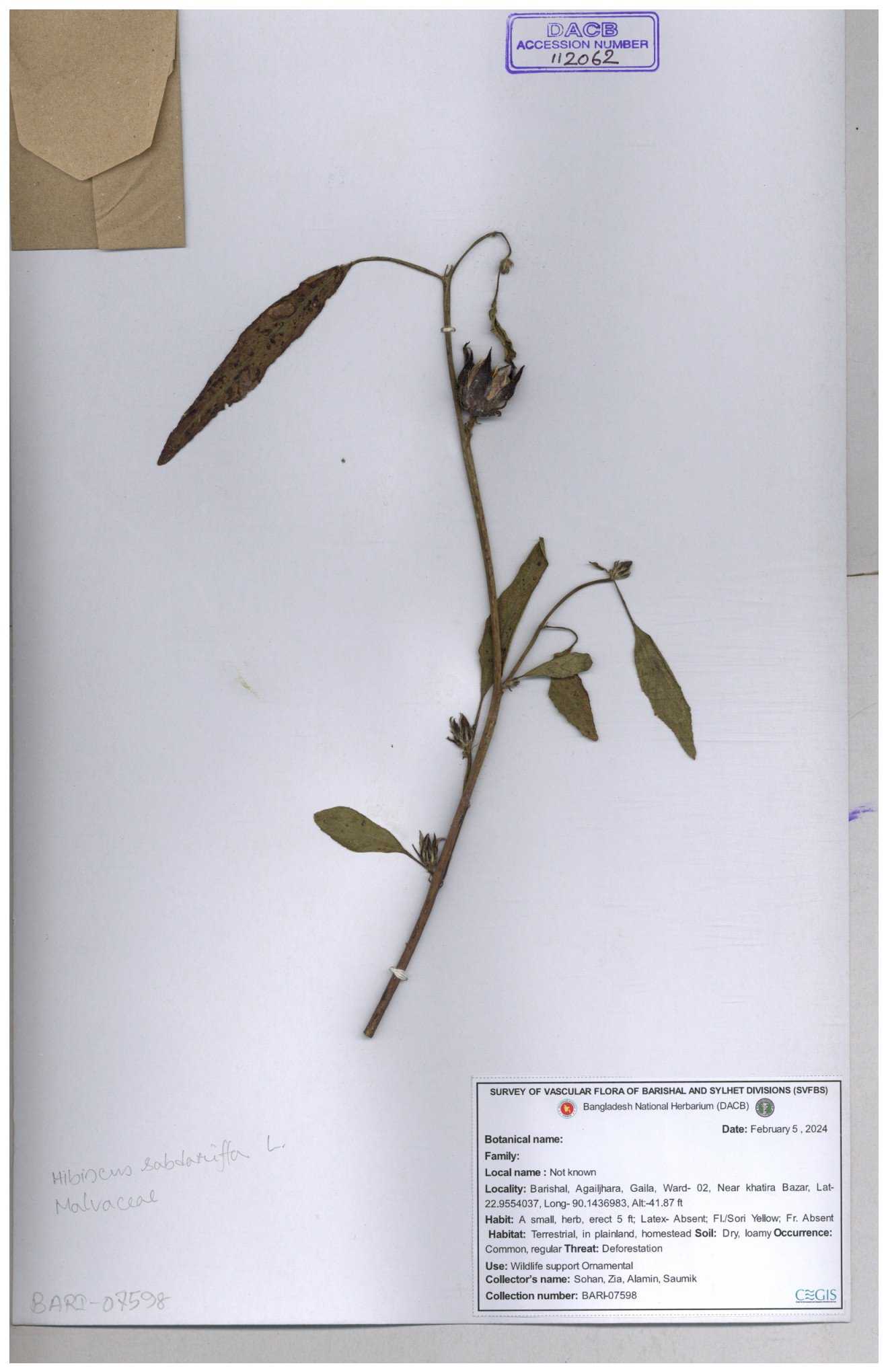 | 73313 | Malvaceae | Abelmoschus moschatus Medik. | Kalokosturi | MS Islam, MKR Rahman & MR Miah | IH-4135 13-02-2017 |