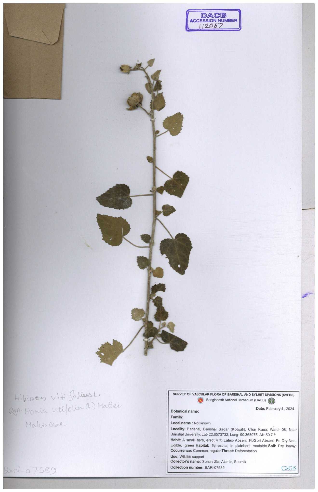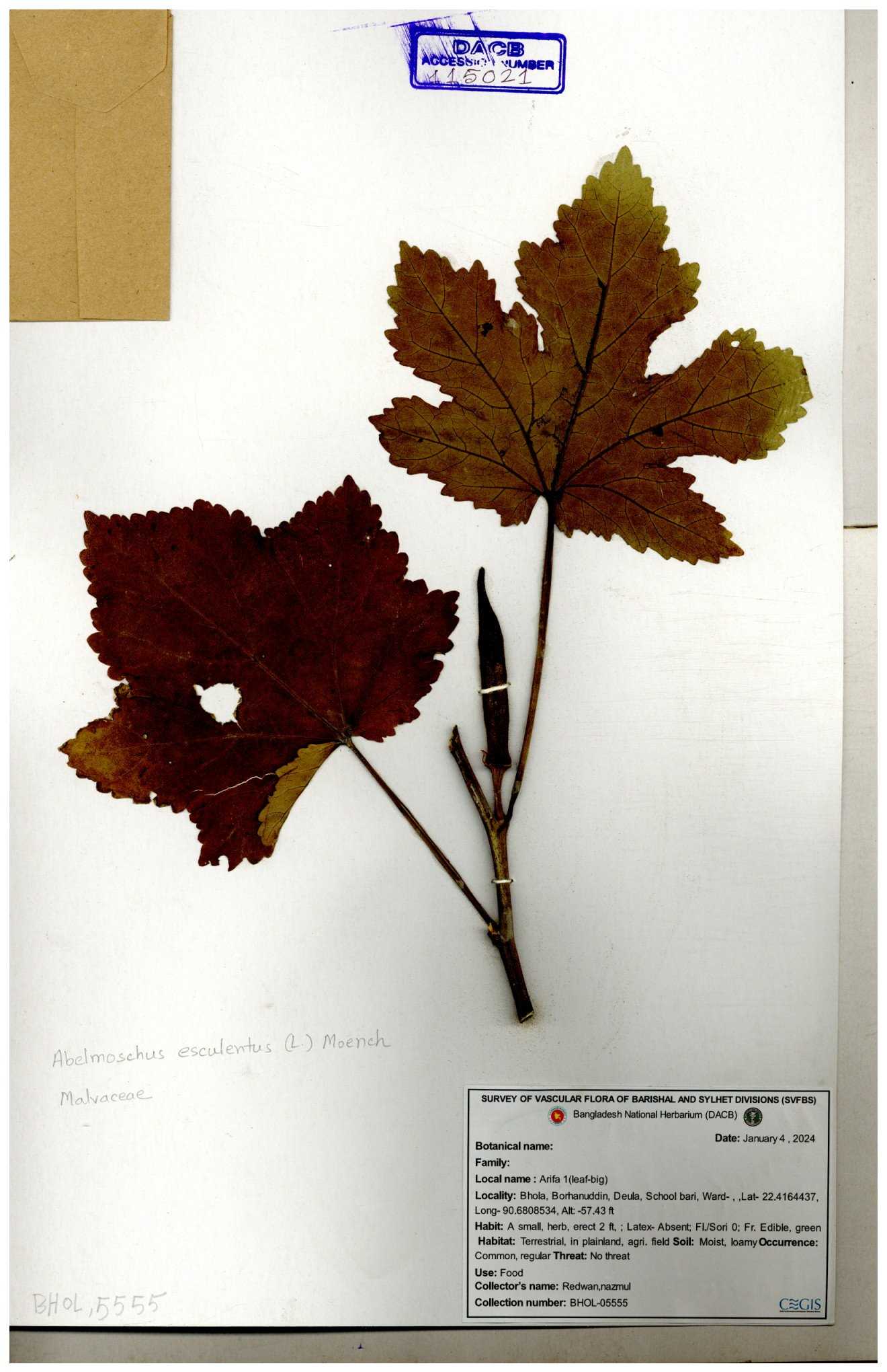 | 55198 | Malvaceae | Abelmoschus moschatus Medik. | Ban-Dheros | Md. Moniruzzaman, Al-Amin & Kawsar | MAK- 7528 07-02-2018 |