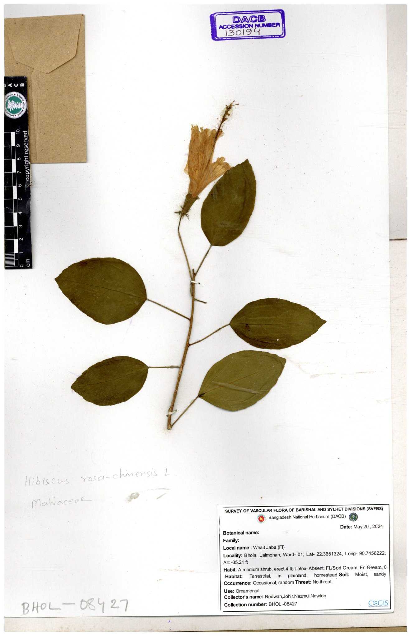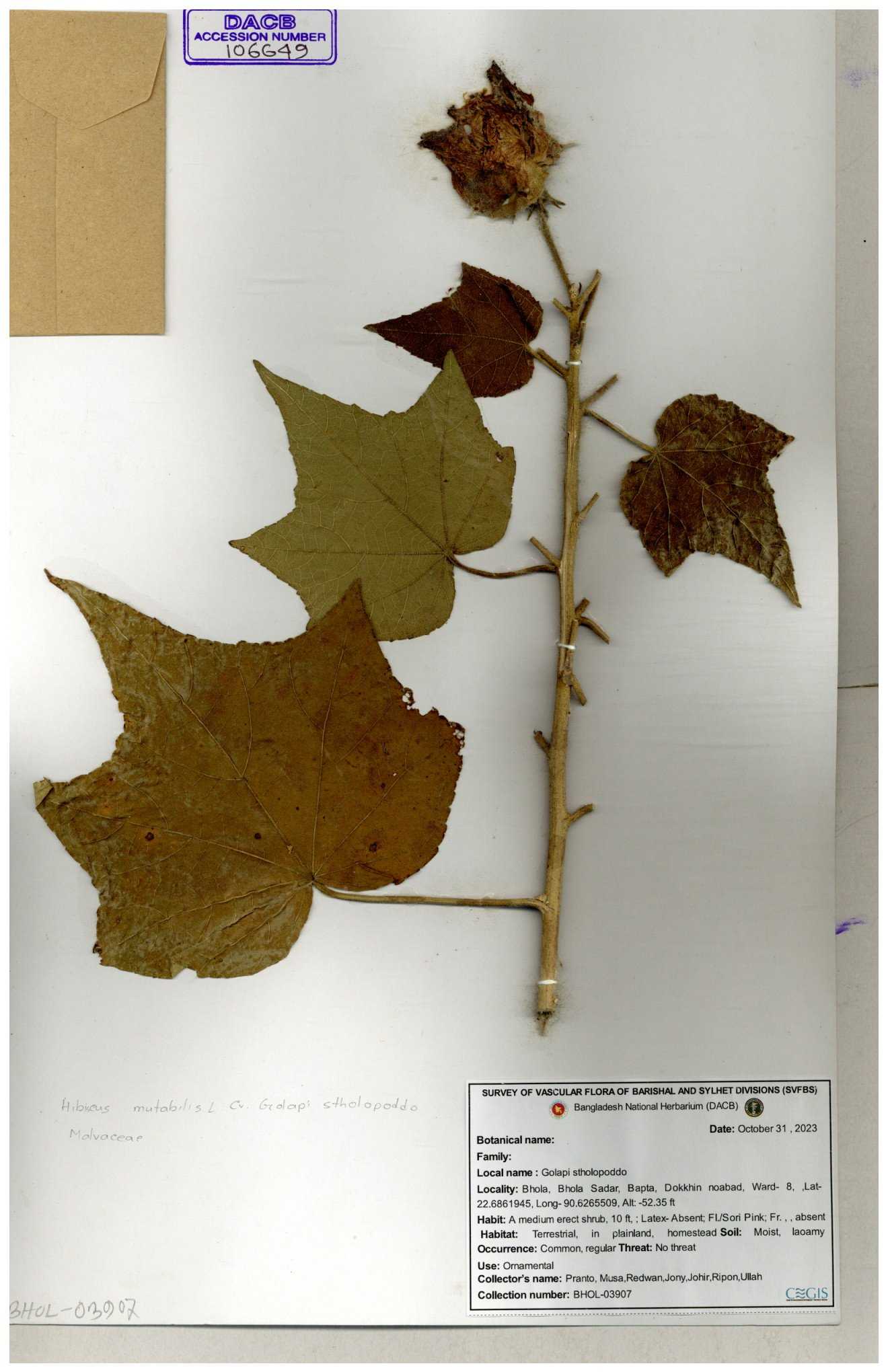 | 52726 | Malvaceae | Abelmoschus moschatus Medik. | Ban-Dherosh | Md. Moniruzzaman, Al-Amin & Kawsar | MAK-5725 19-09-2017 |