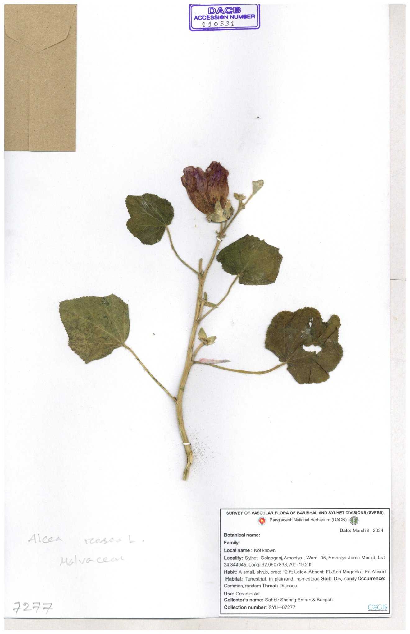 | 77658 | Malvaceae | Abelmoschus moschatus Medik. | Ban-Dherosh | Md. Moniruzzaman, Al-Amin & Kawsar | MAK- 5810 25-09-2017 |