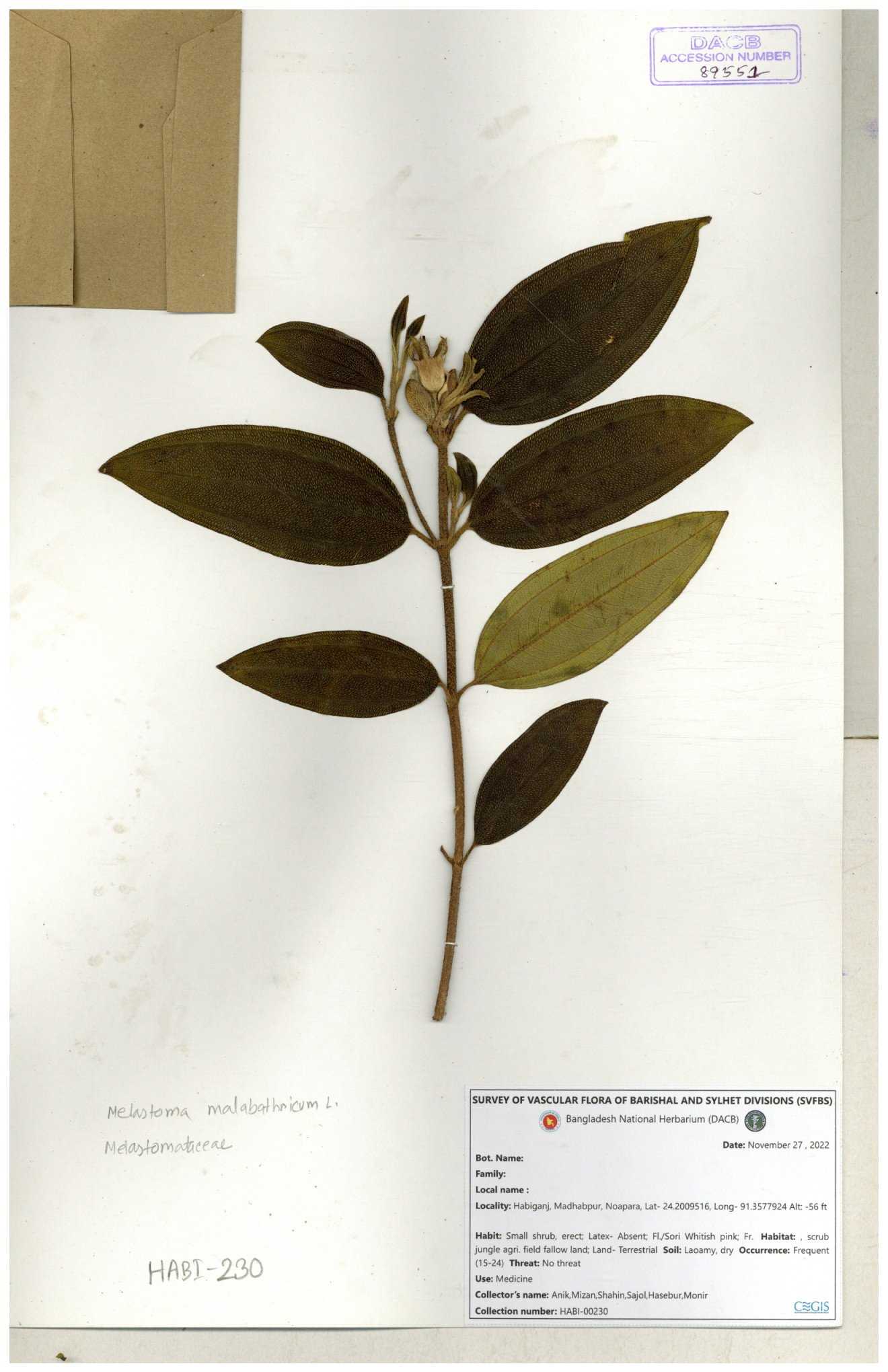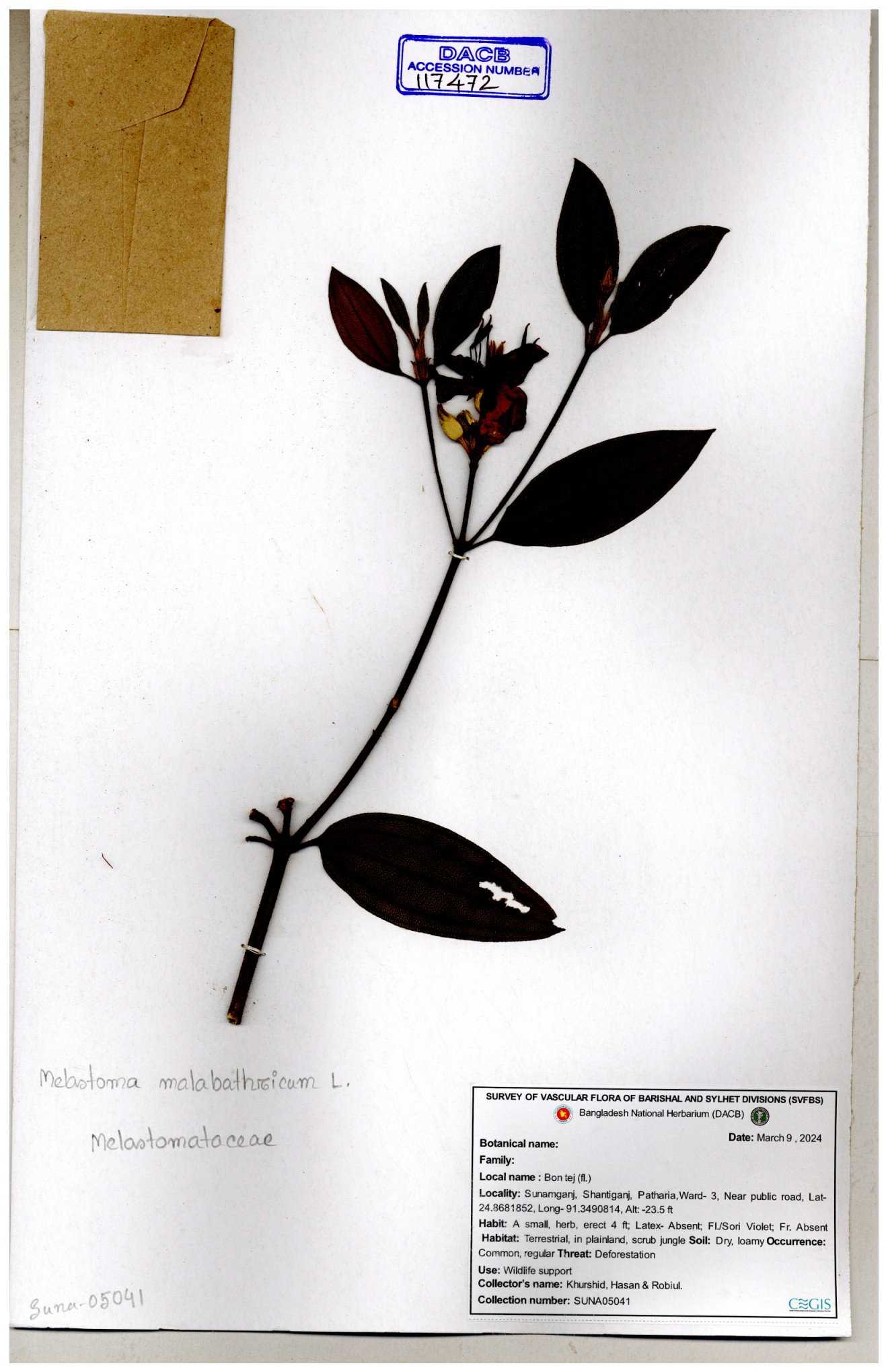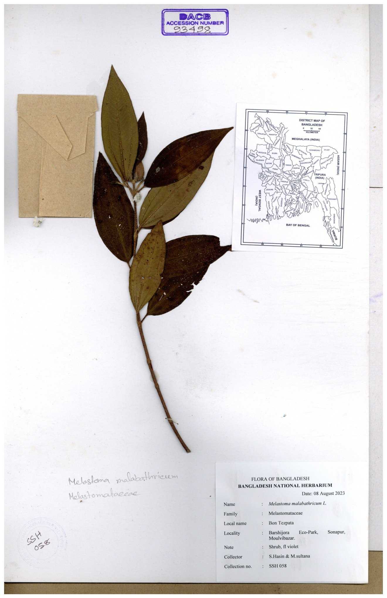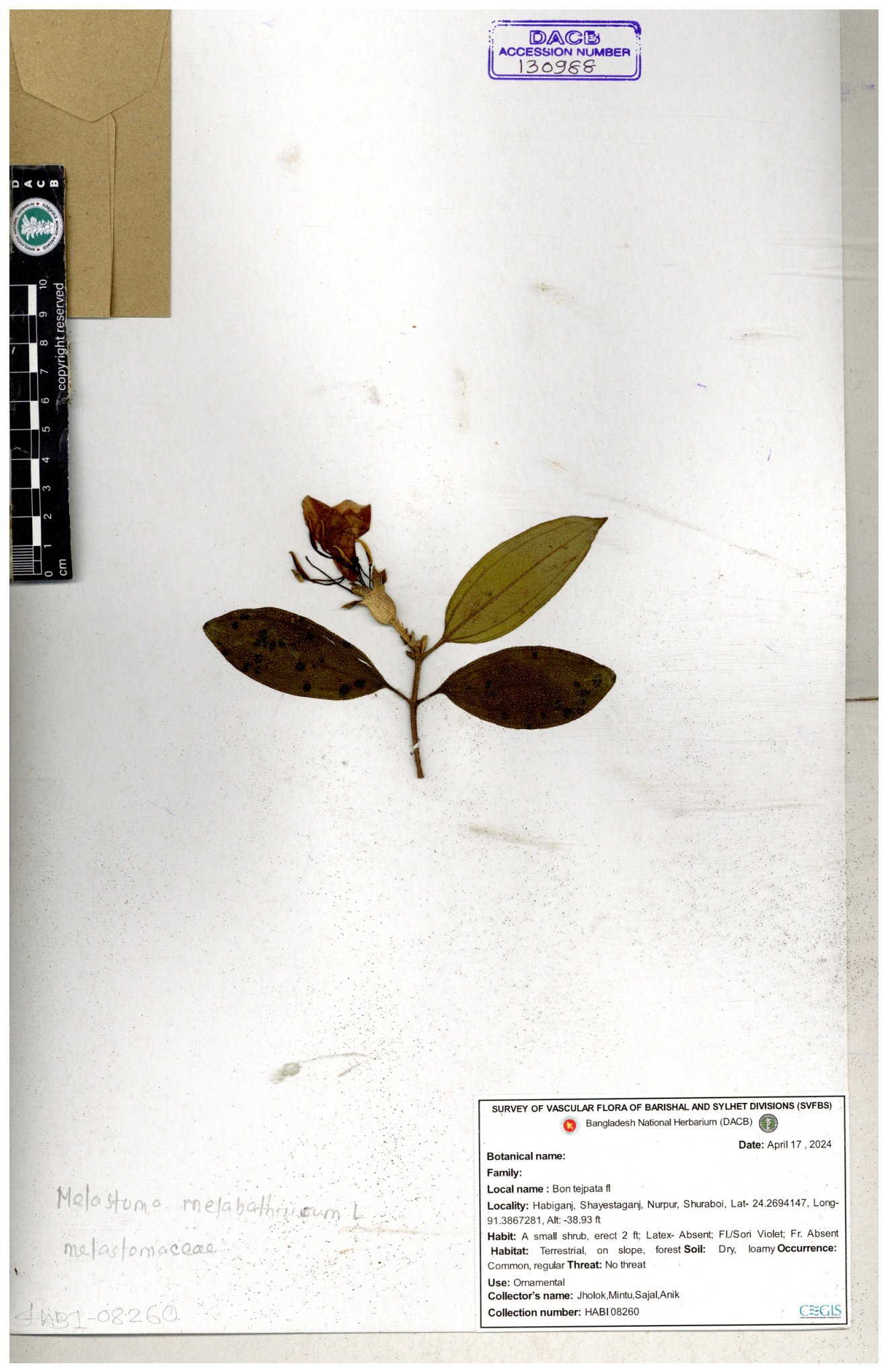 | 66860 | Melastomataceae | Melastoma melabathricum | Bon tej pata | Joyanta, Mominur, Kamrul & Suborno | JCR-5097 18-04-2017 |