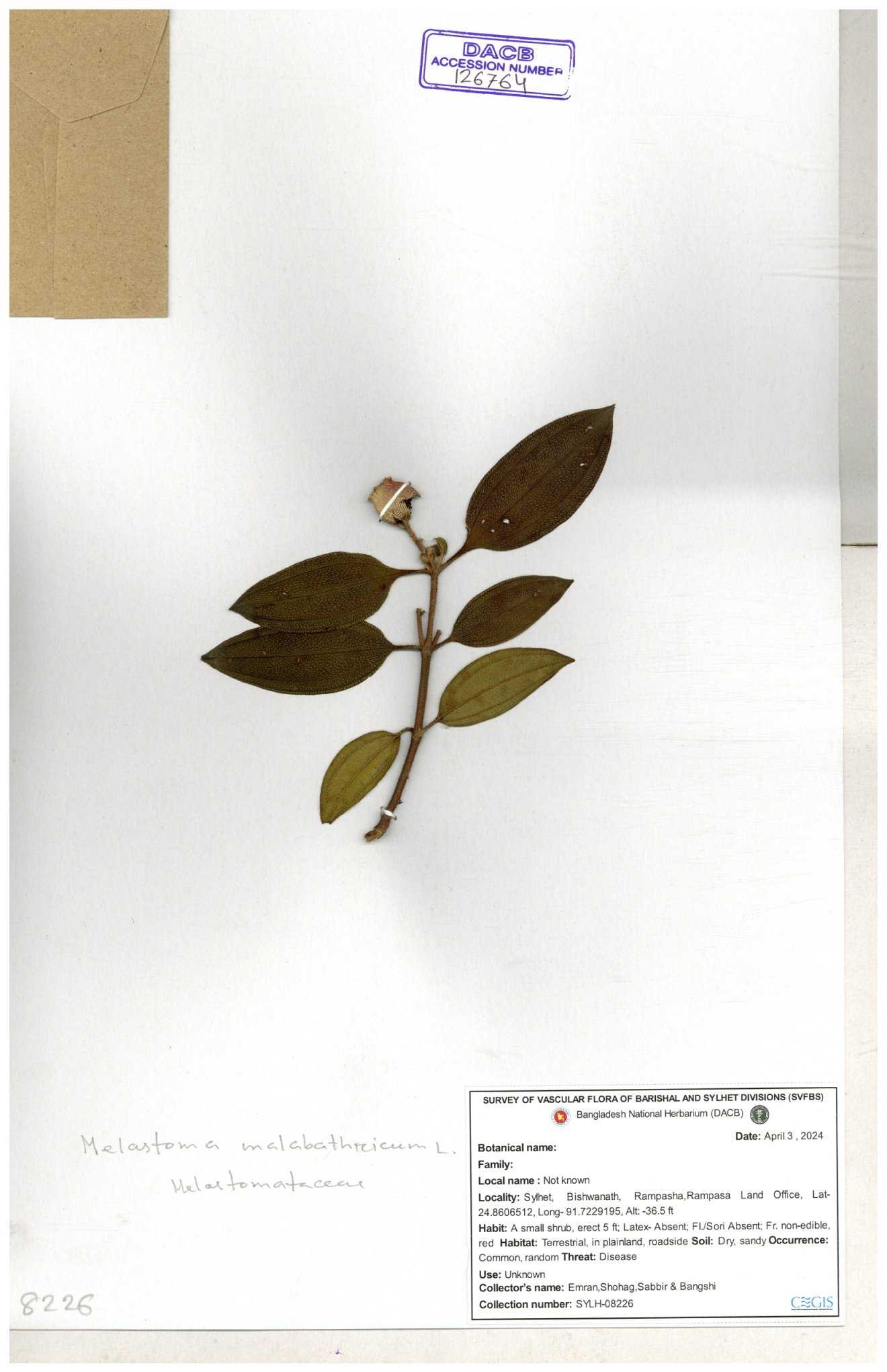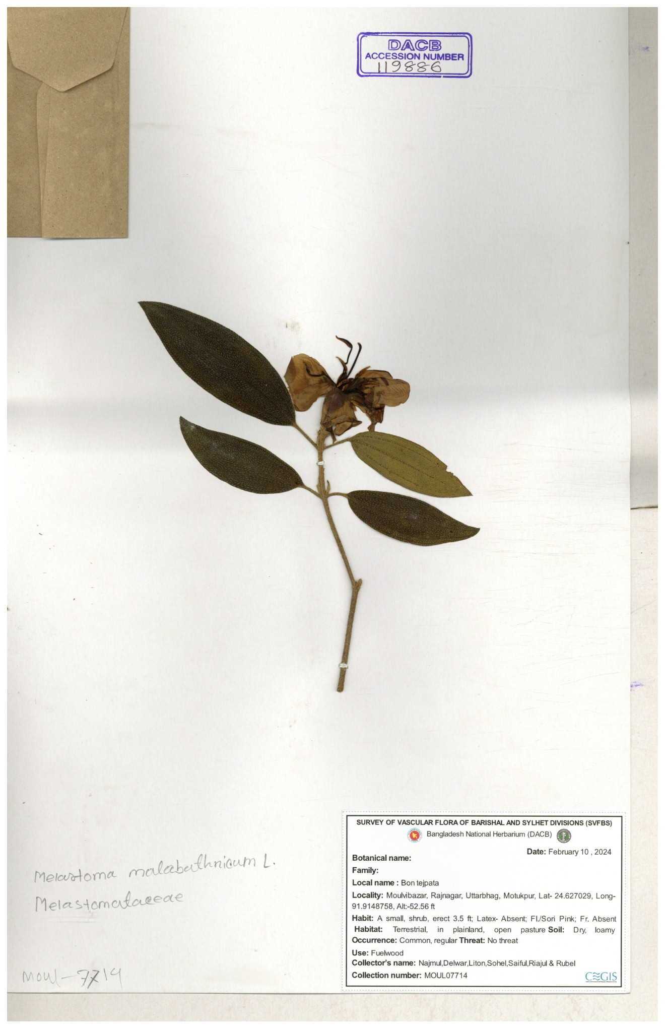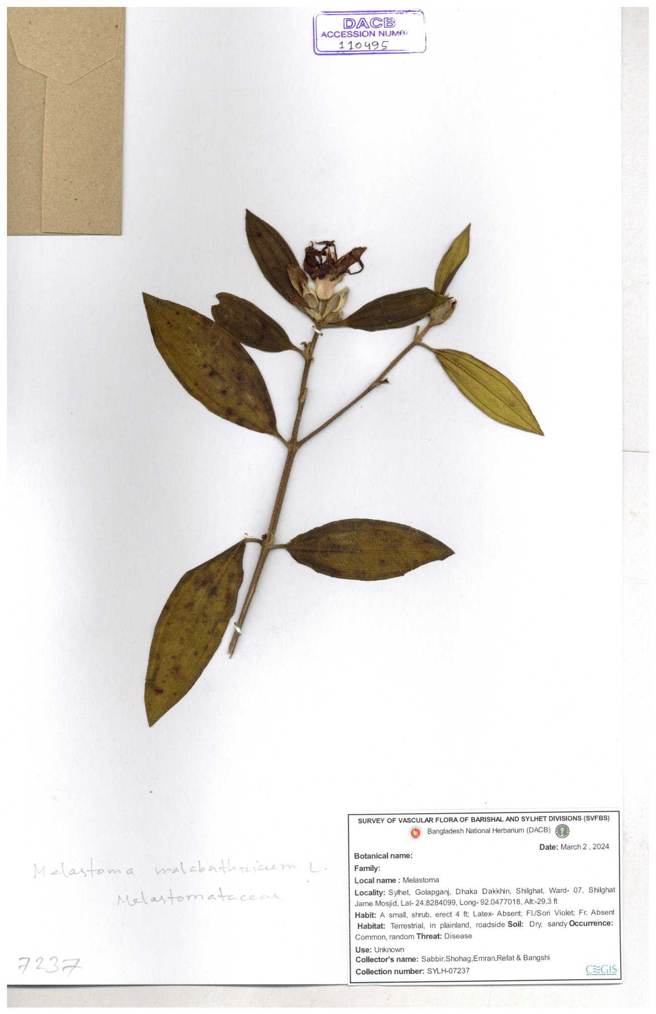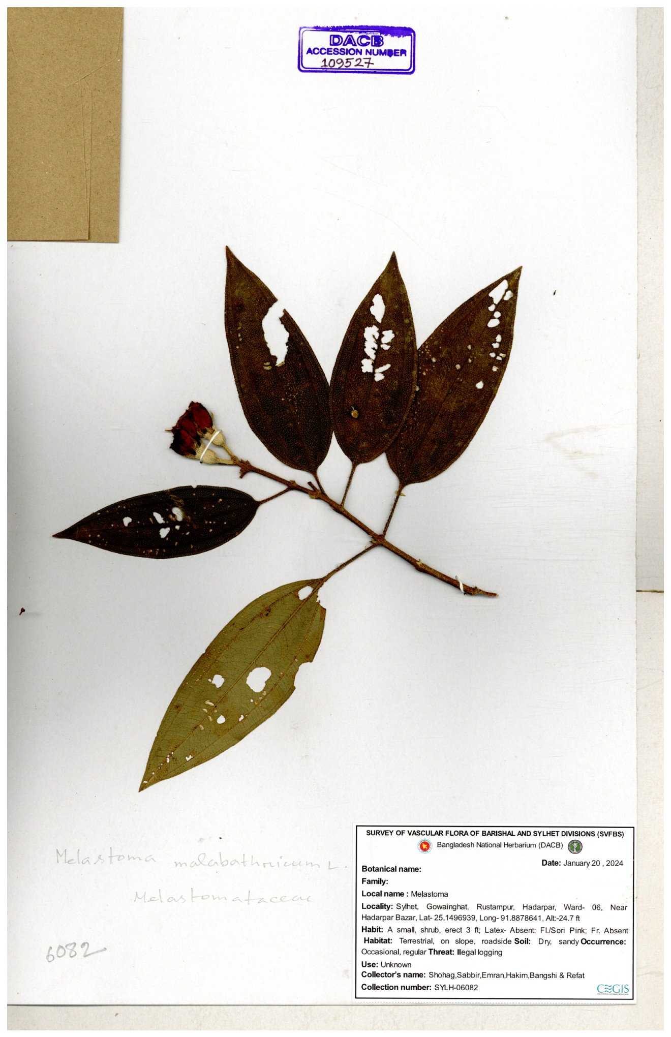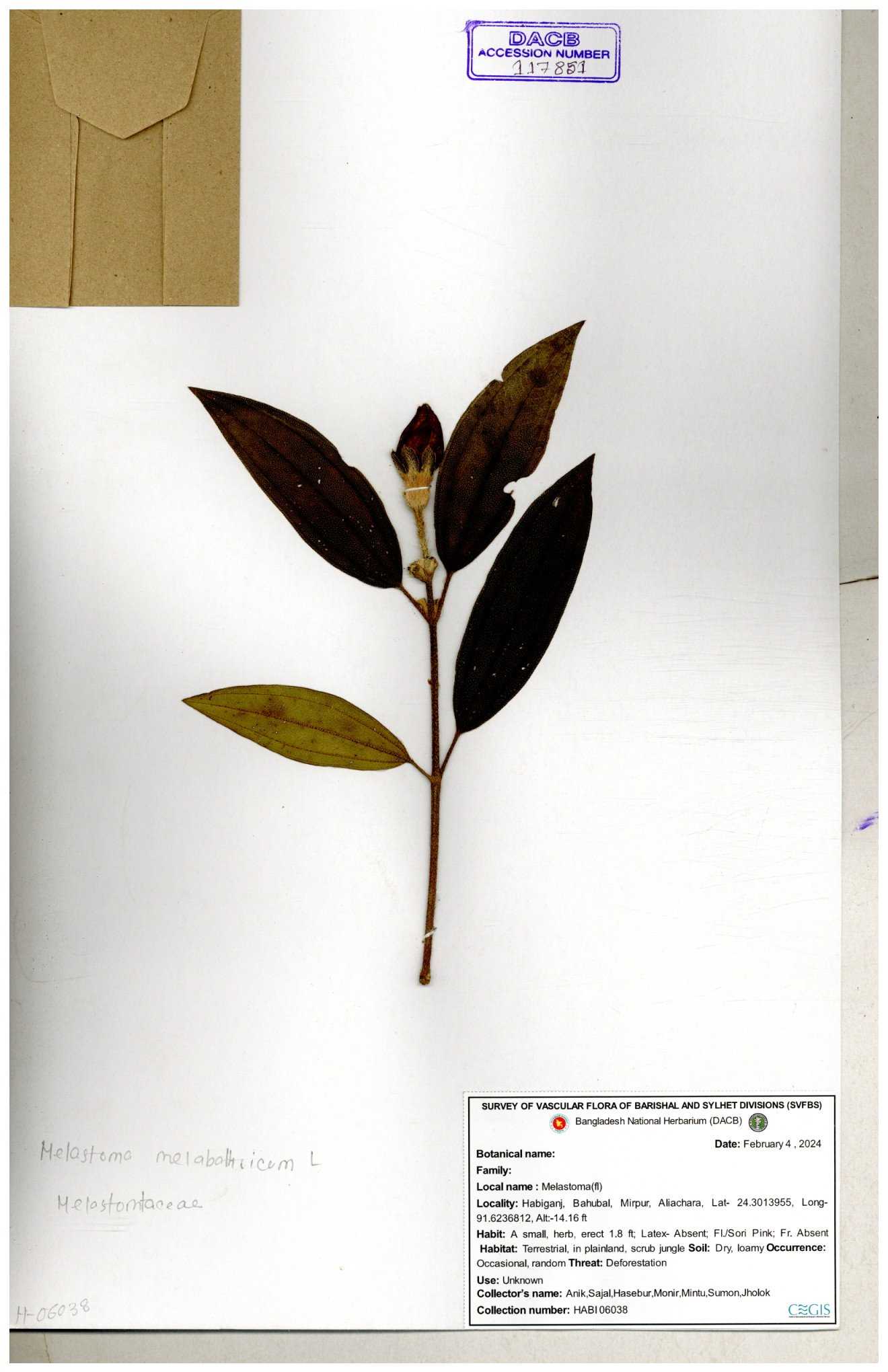 | 66860 | Melastomataceae | Melastoma melabathricum | Bon tej pata | Joyanta, Mominur, Kamrul & Suborno | JCR-5097 18-04-2017 |