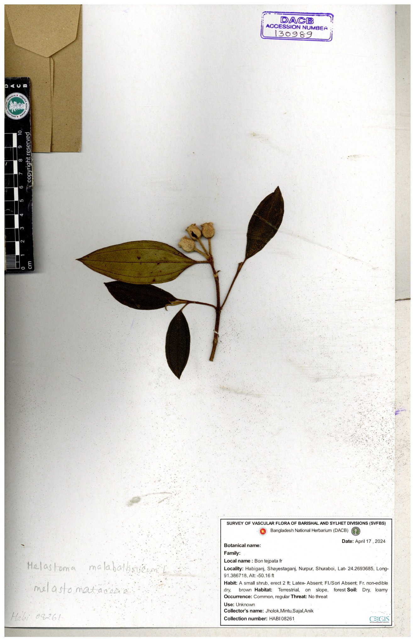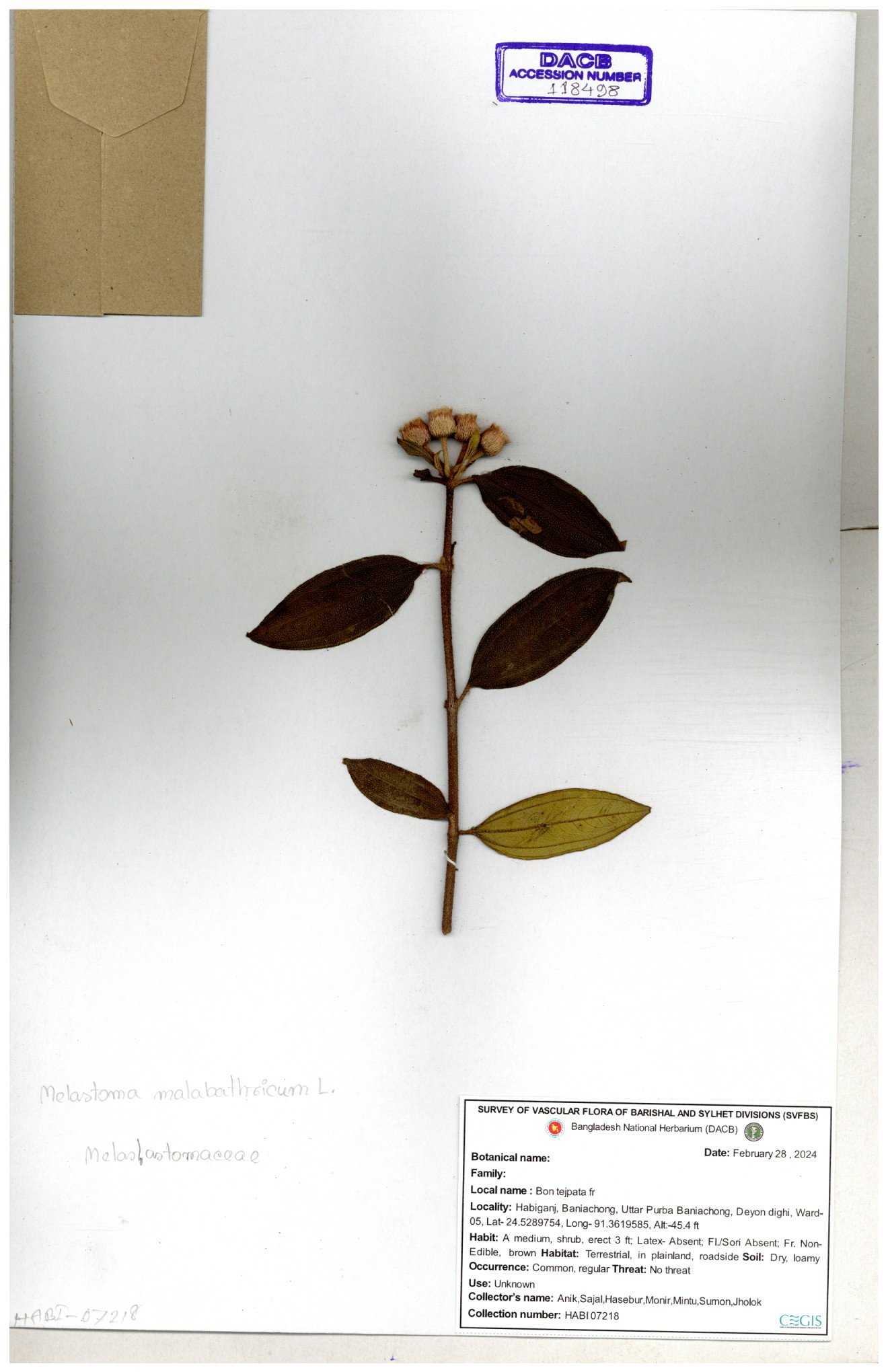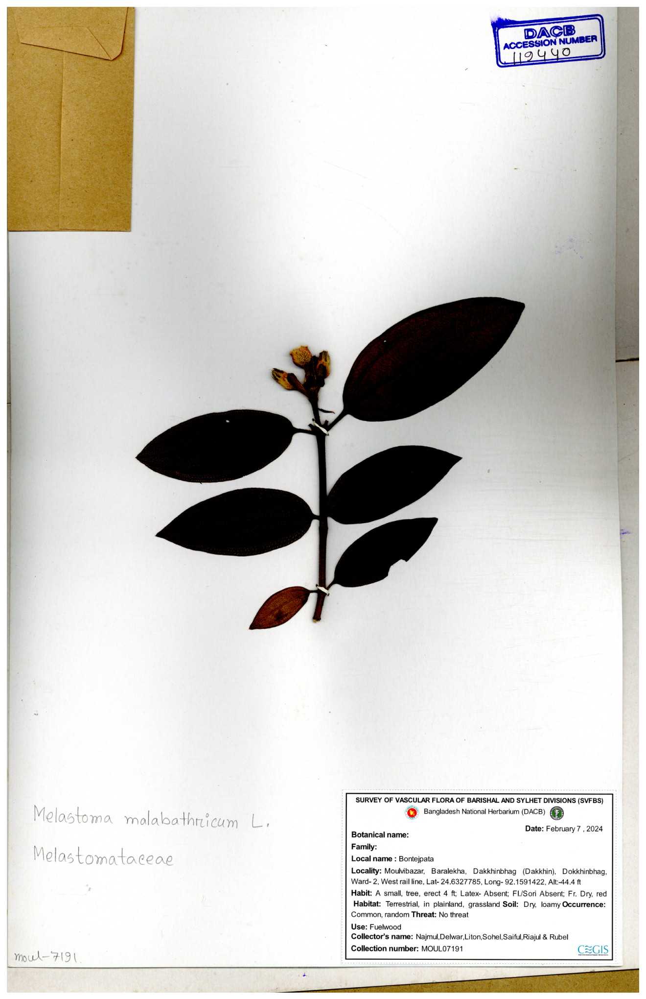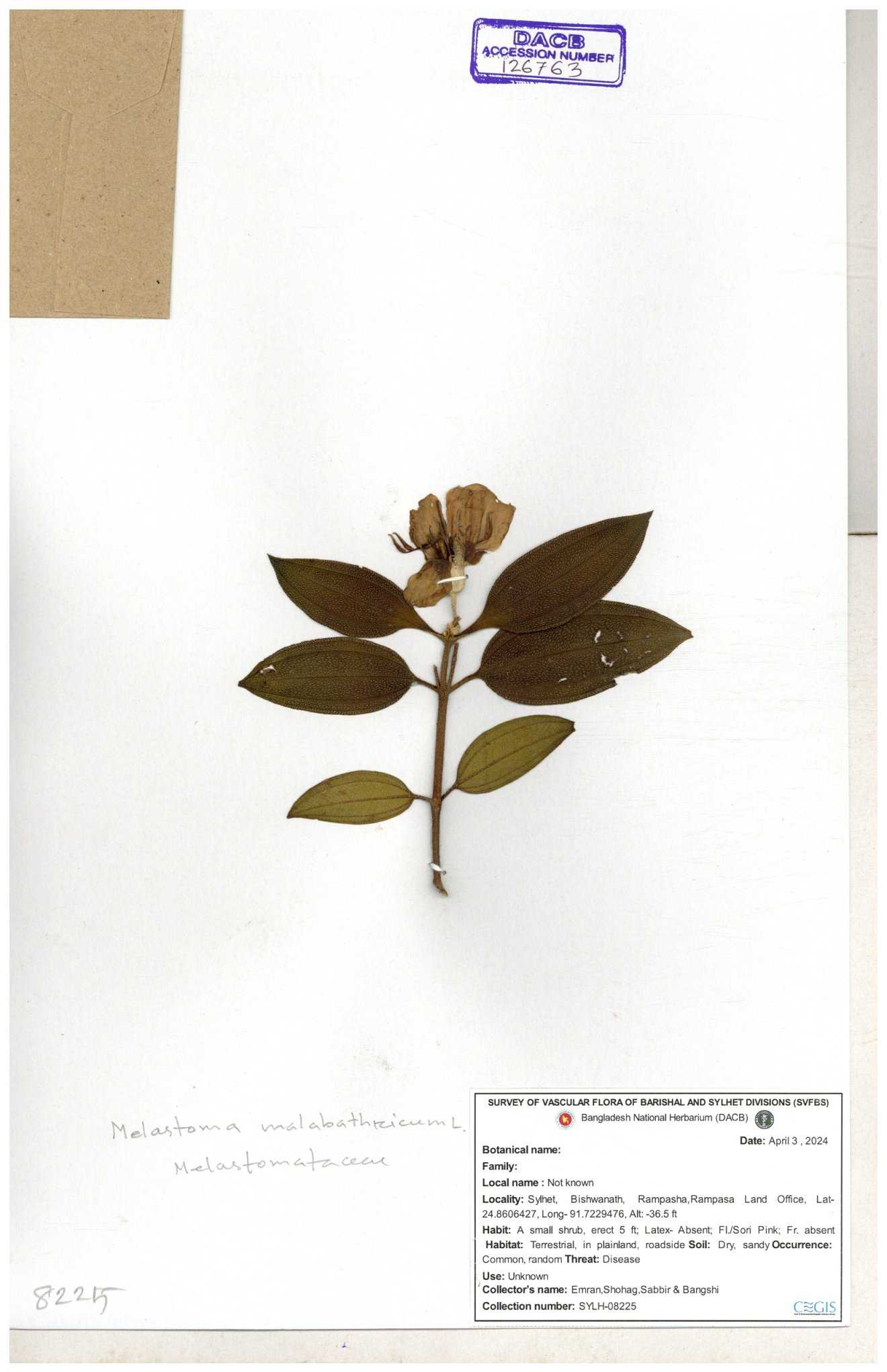| 66860 | Melastomataceae | Melastoma melabathricum | Bon tej pata | Joyanta, Mominur, Kamrul & Suborno | JCR-5097 18-04-2017 |
