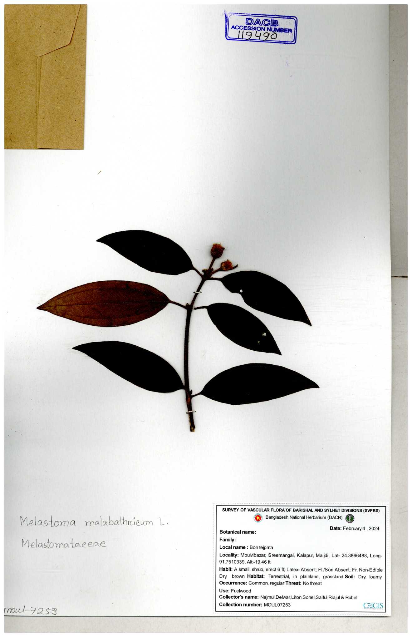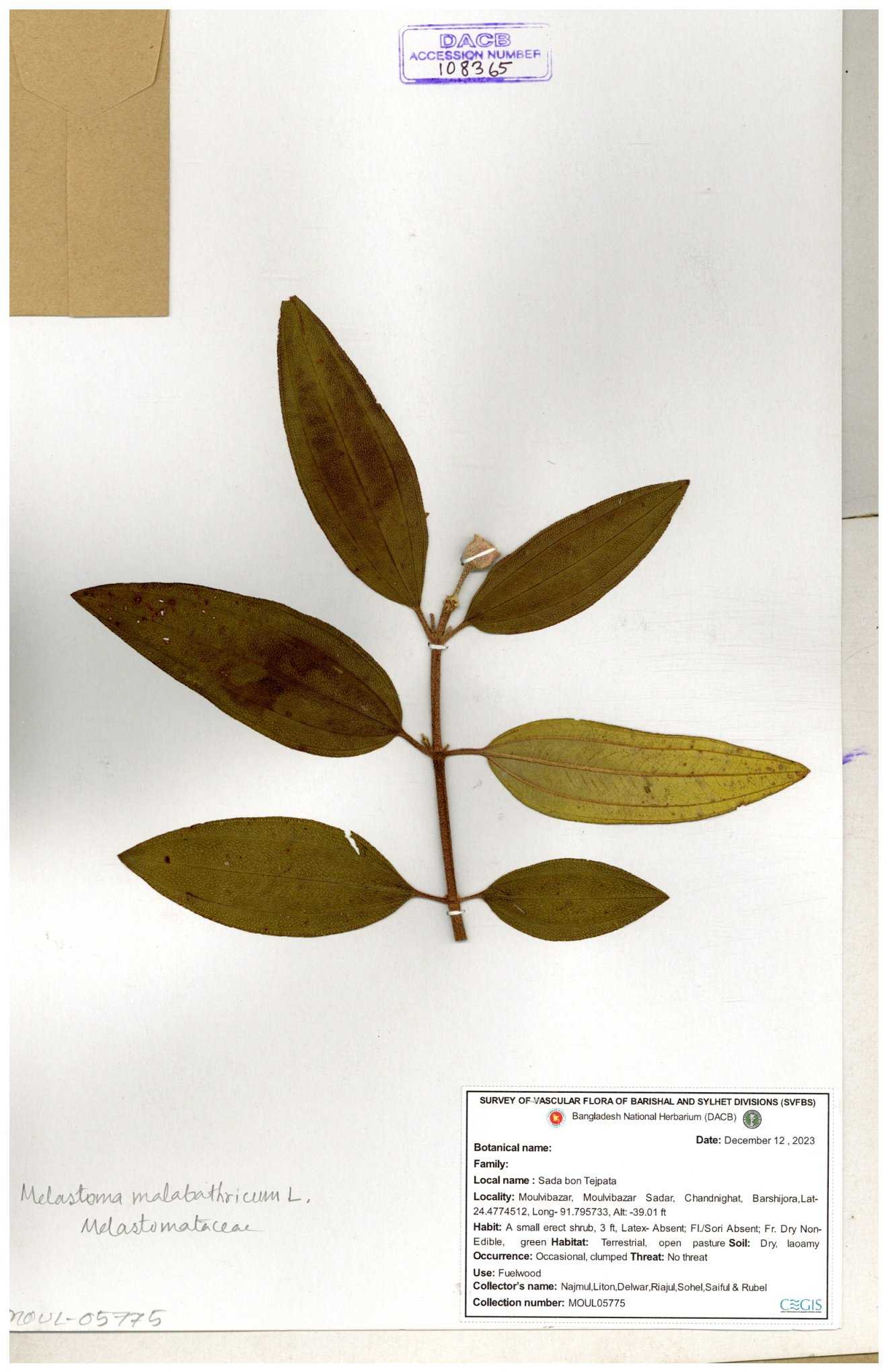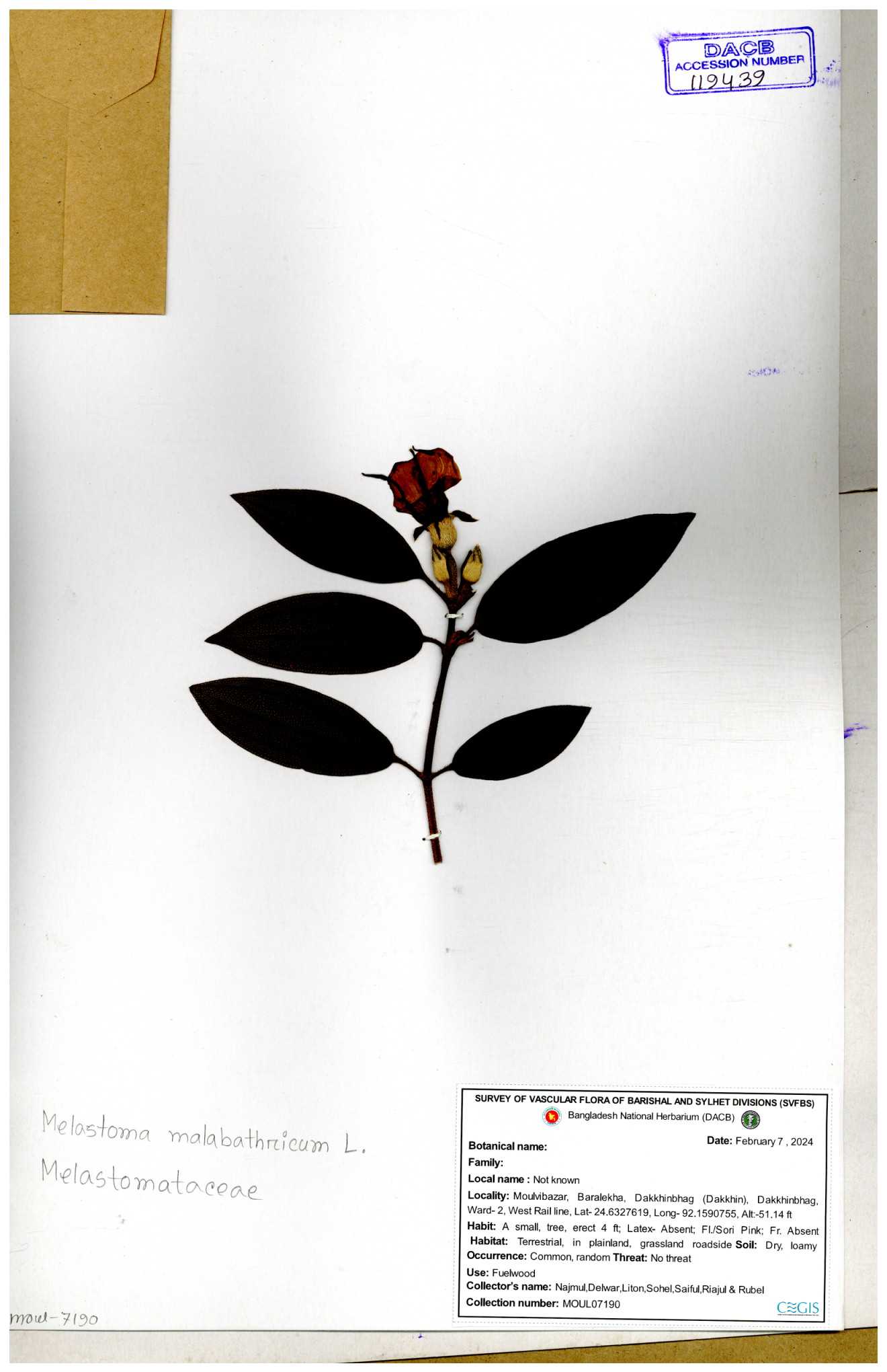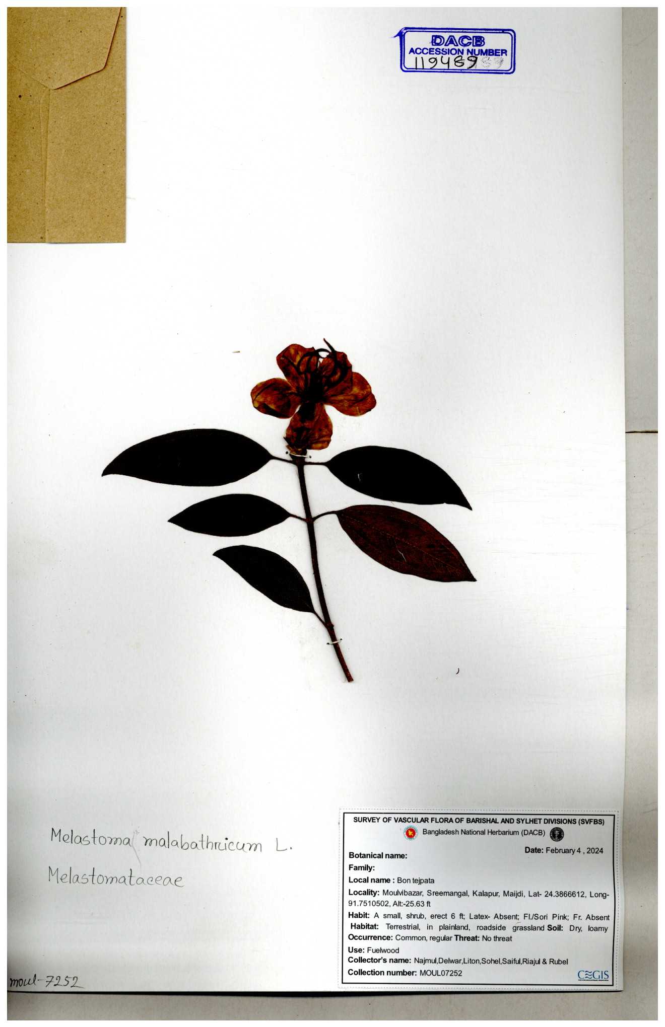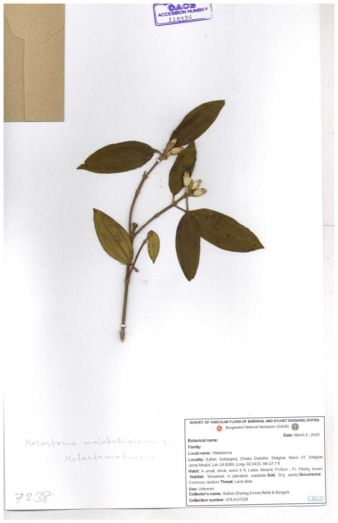| 66860 | Melastomataceae | Melastoma melabathricum | Bon tej pata | Joyanta, Mominur, Kamrul & Suborno | JCR-5097 18-04-2017 |