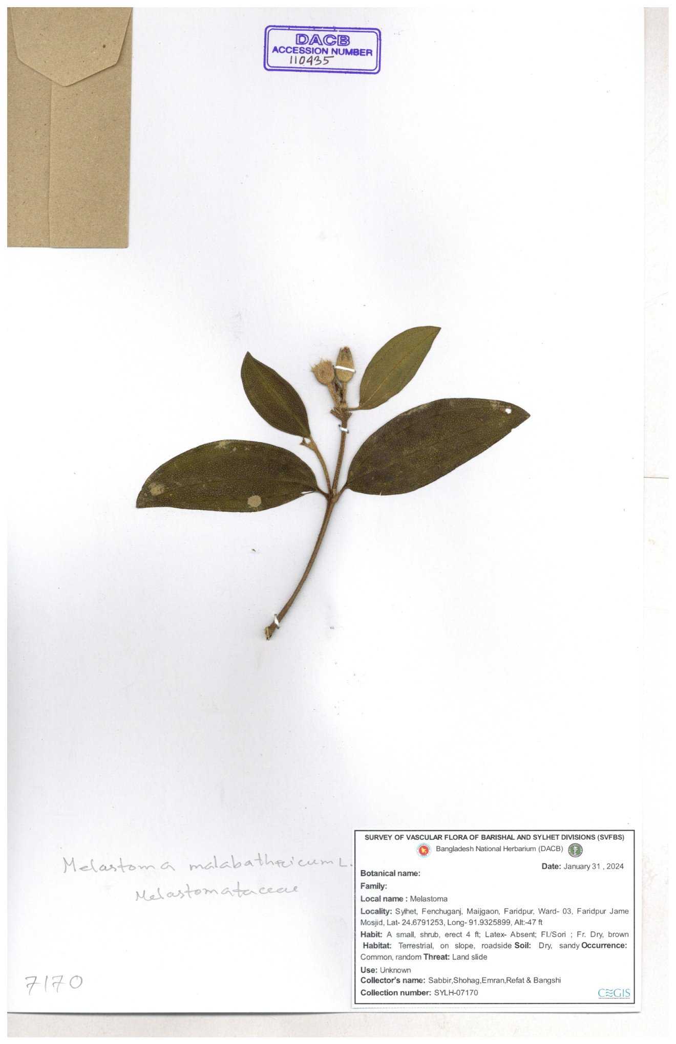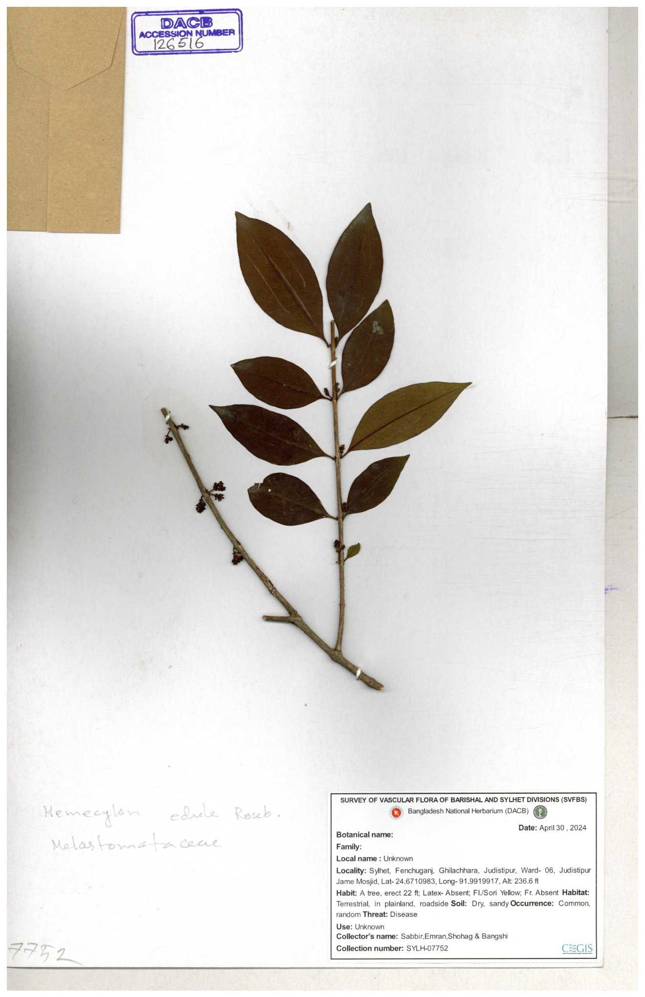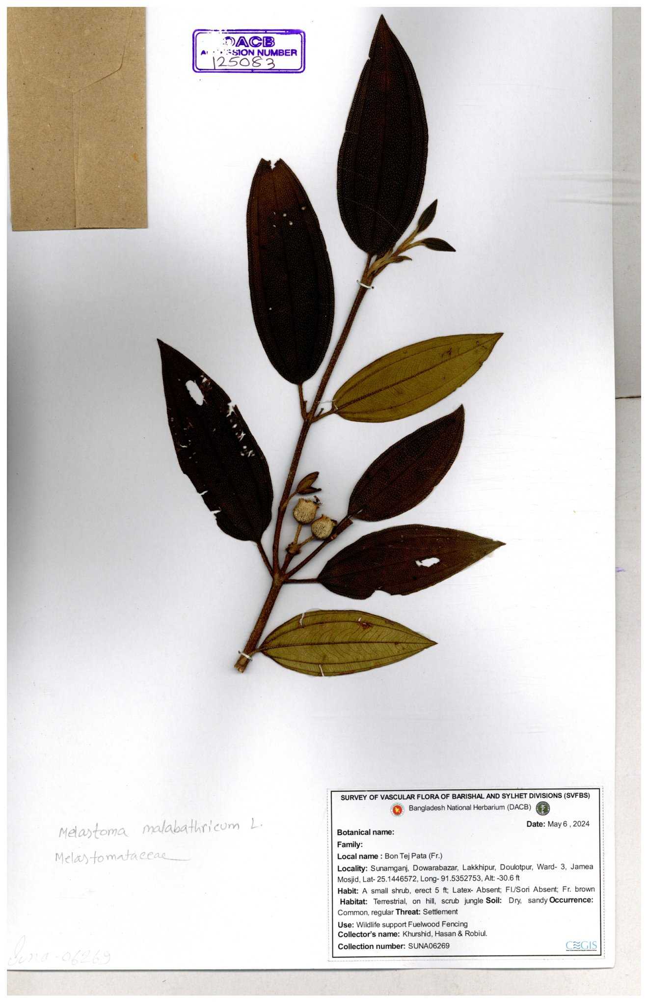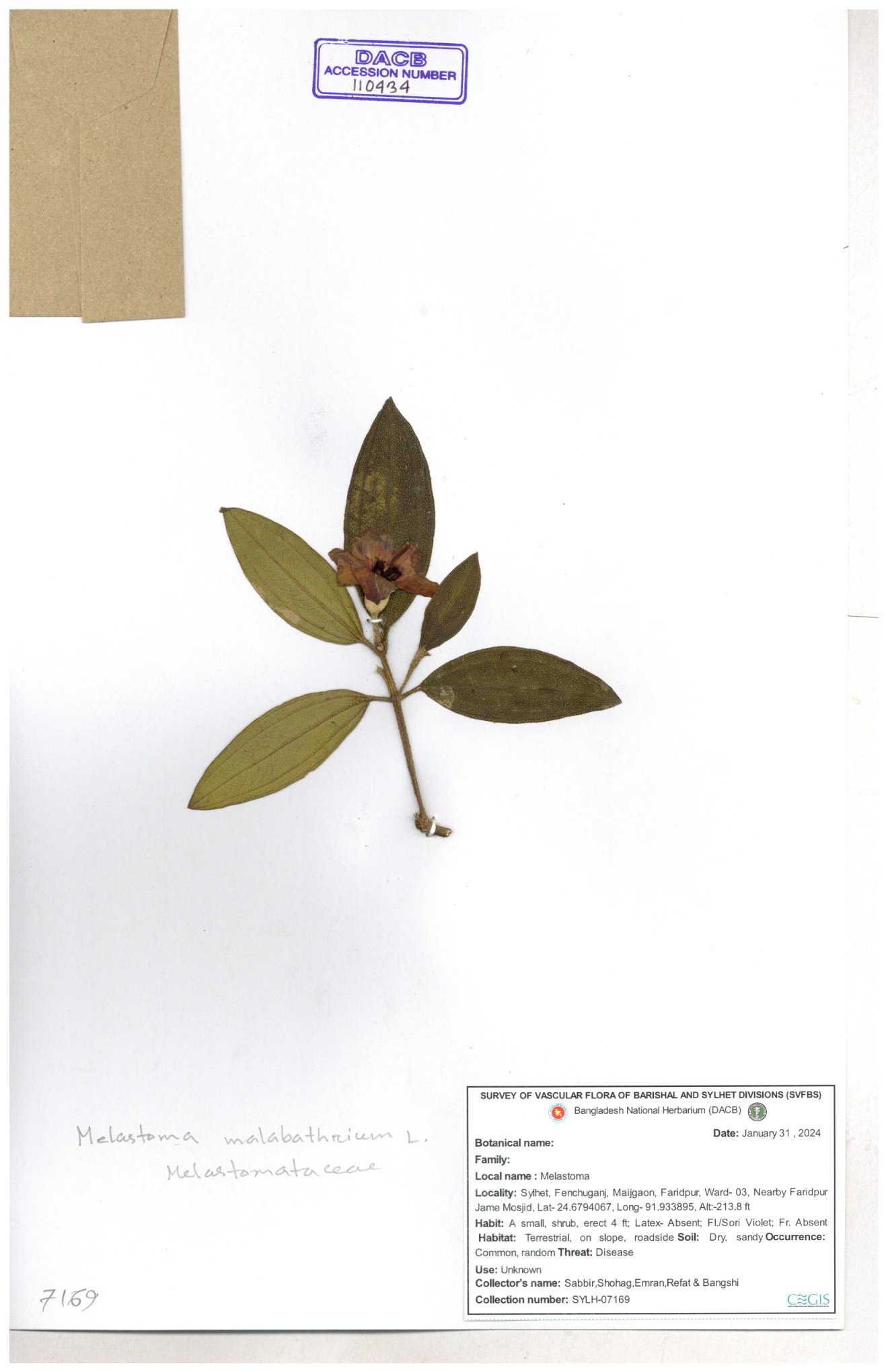 | 66860 | Melastomataceae | Melastoma melabathricum | Bon tej pata | Joyanta, Mominur, Kamrul & Suborno | JCR-5097 18-04-2017 |