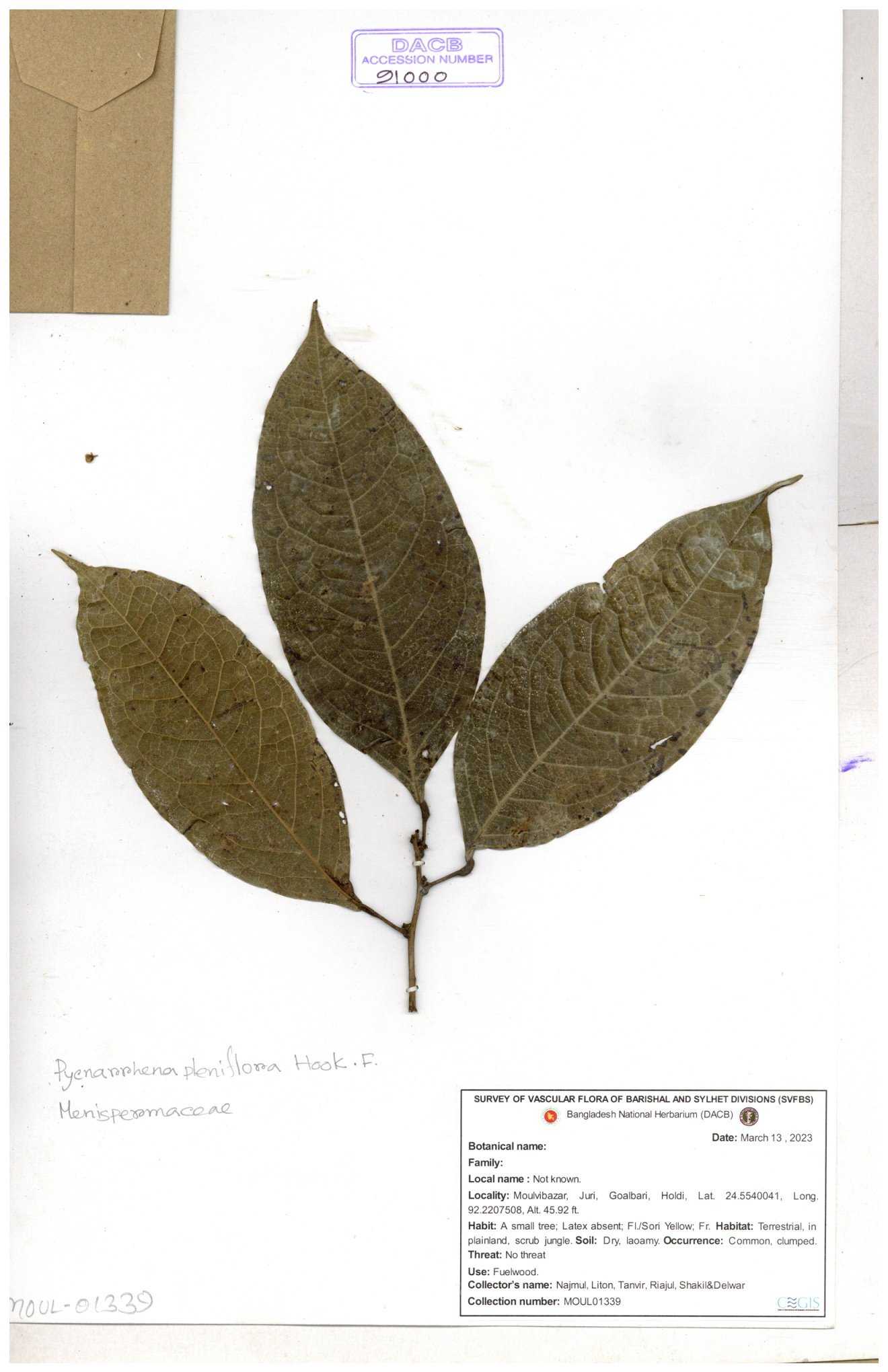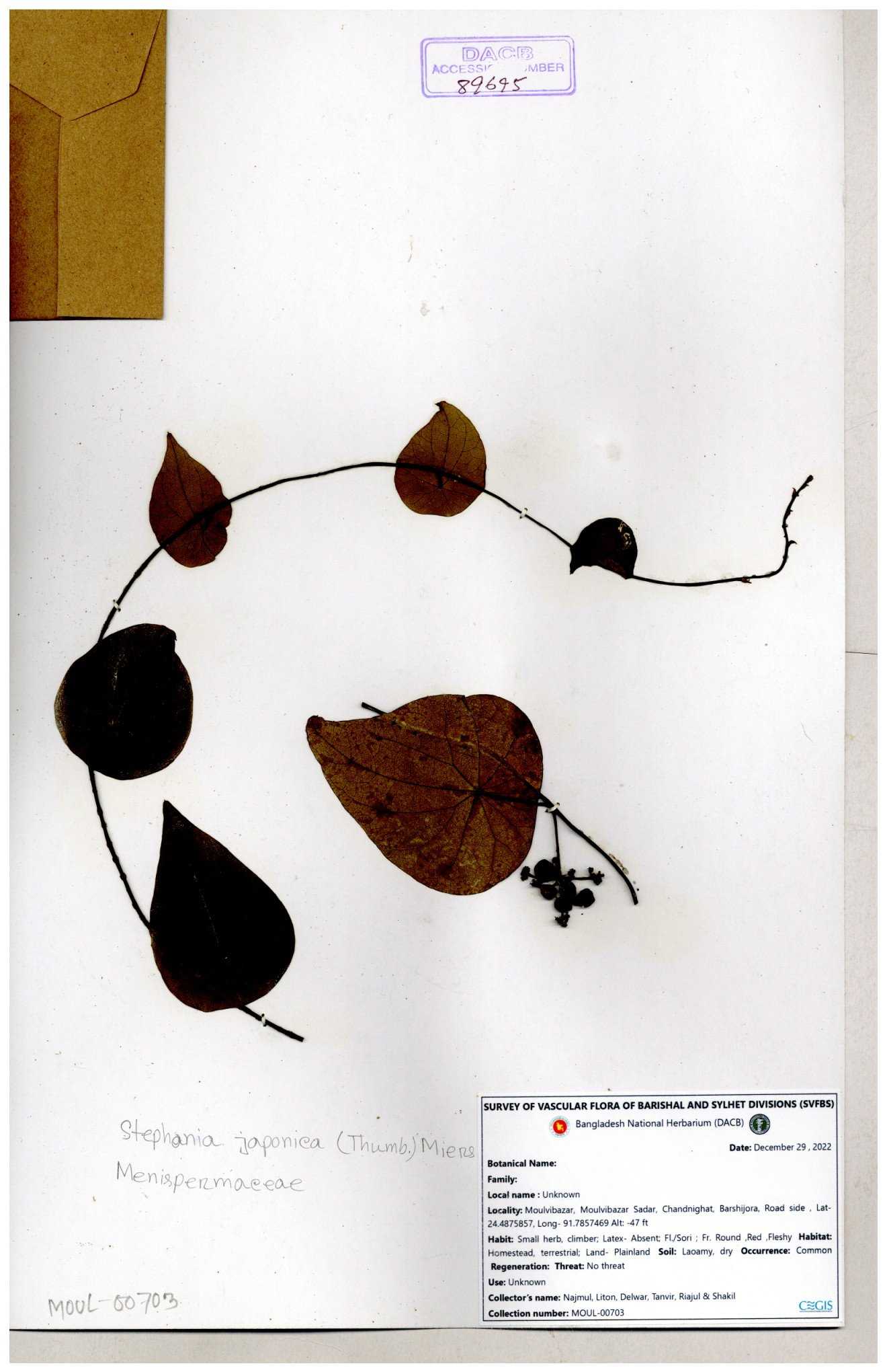| 93049 | Menispermaceae | Stephania glabra Miers | Nazul, Liton, Delwar, Riajul, Shakil, Mahdi & Rubel | MOUL02396 07-06-2023 |