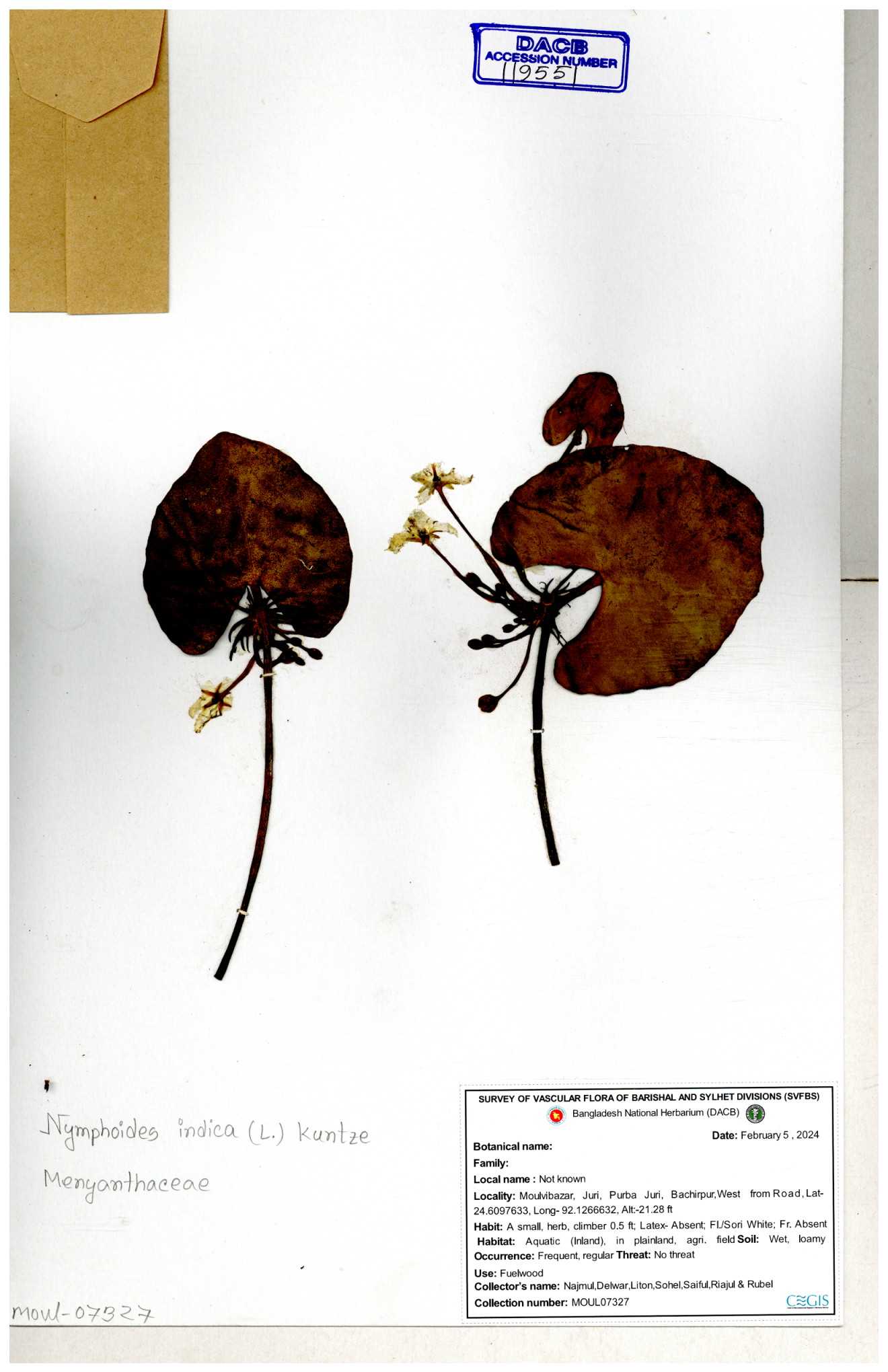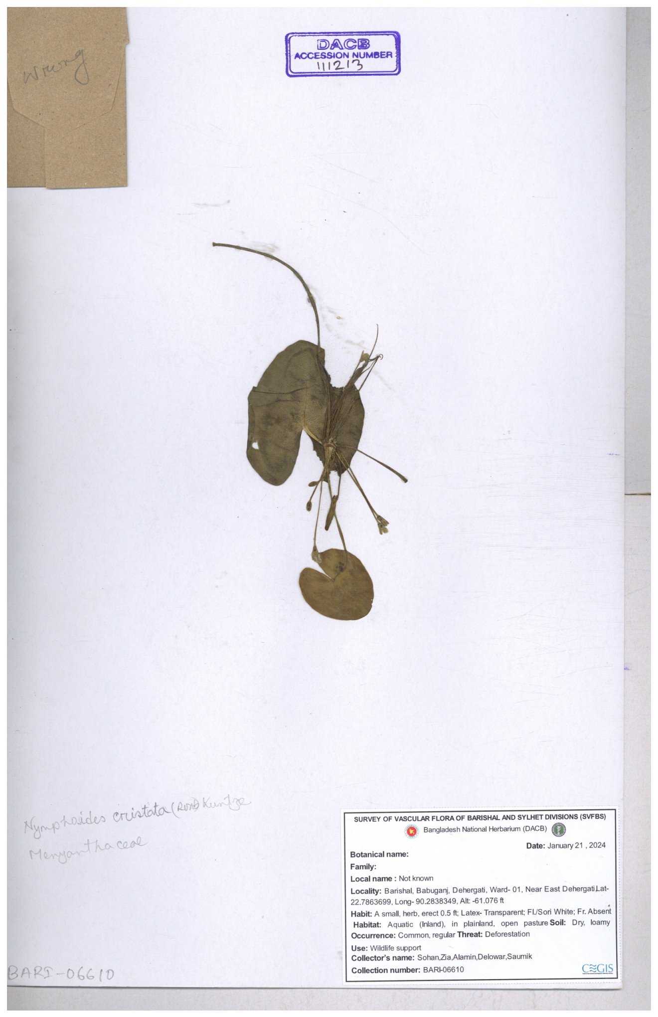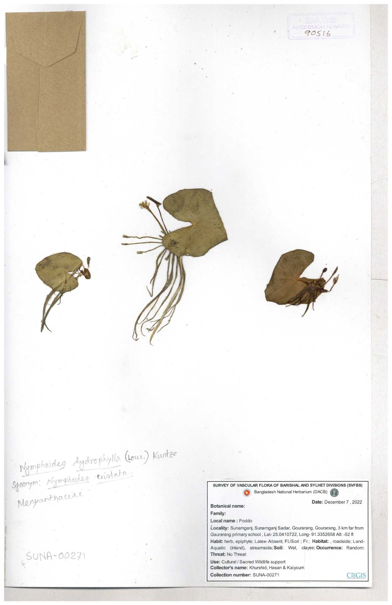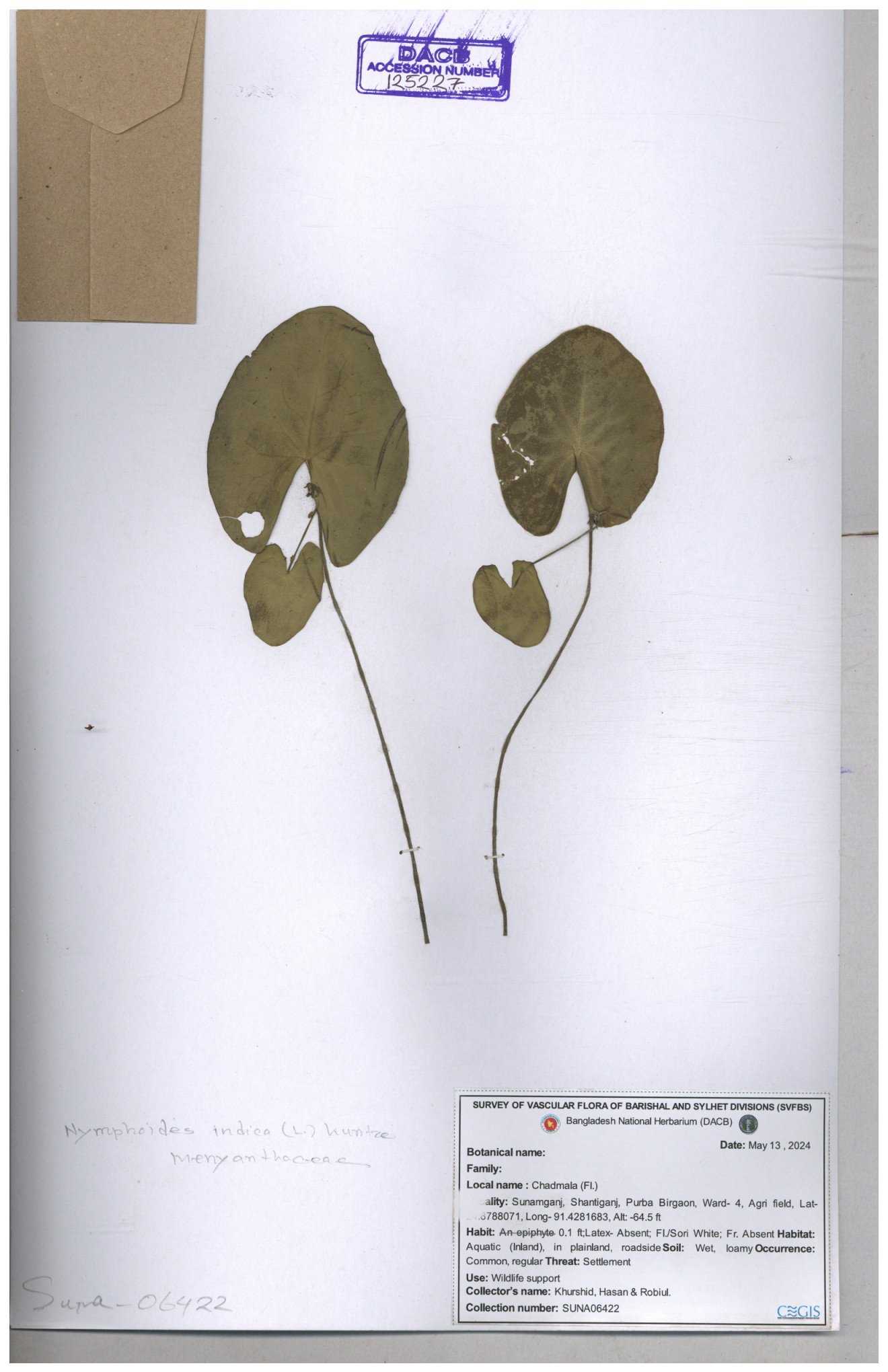 | 87195 | Menyanthaceae | Nymphoides indica (L.) Kuntze | Cadmala | Dr. M. Sultana | DMS-4770 27-05-2022 |