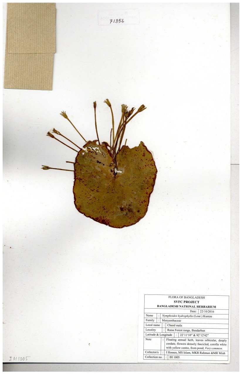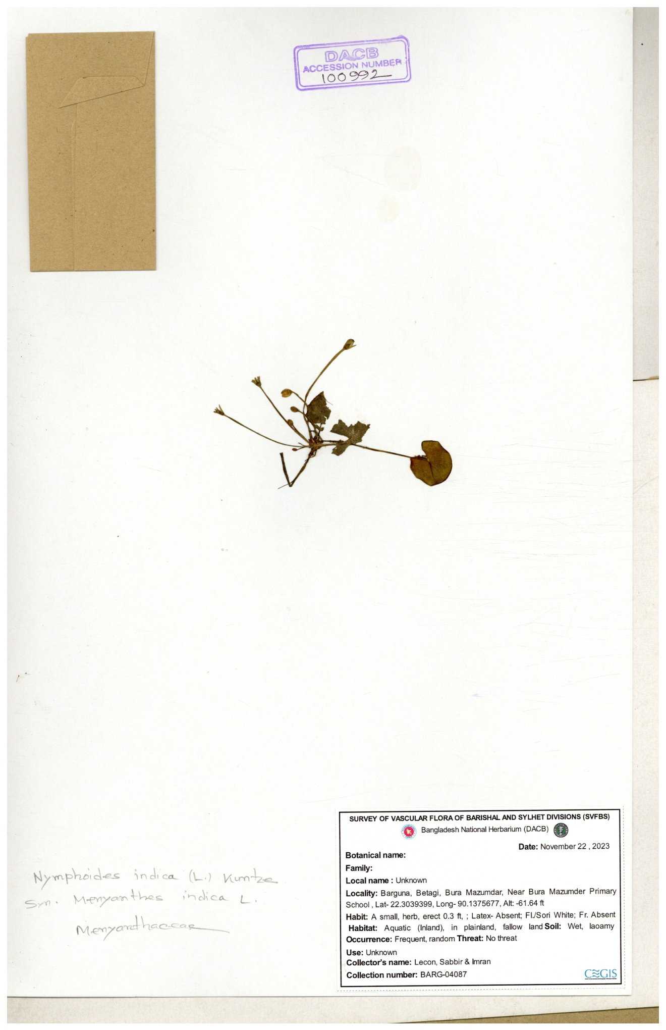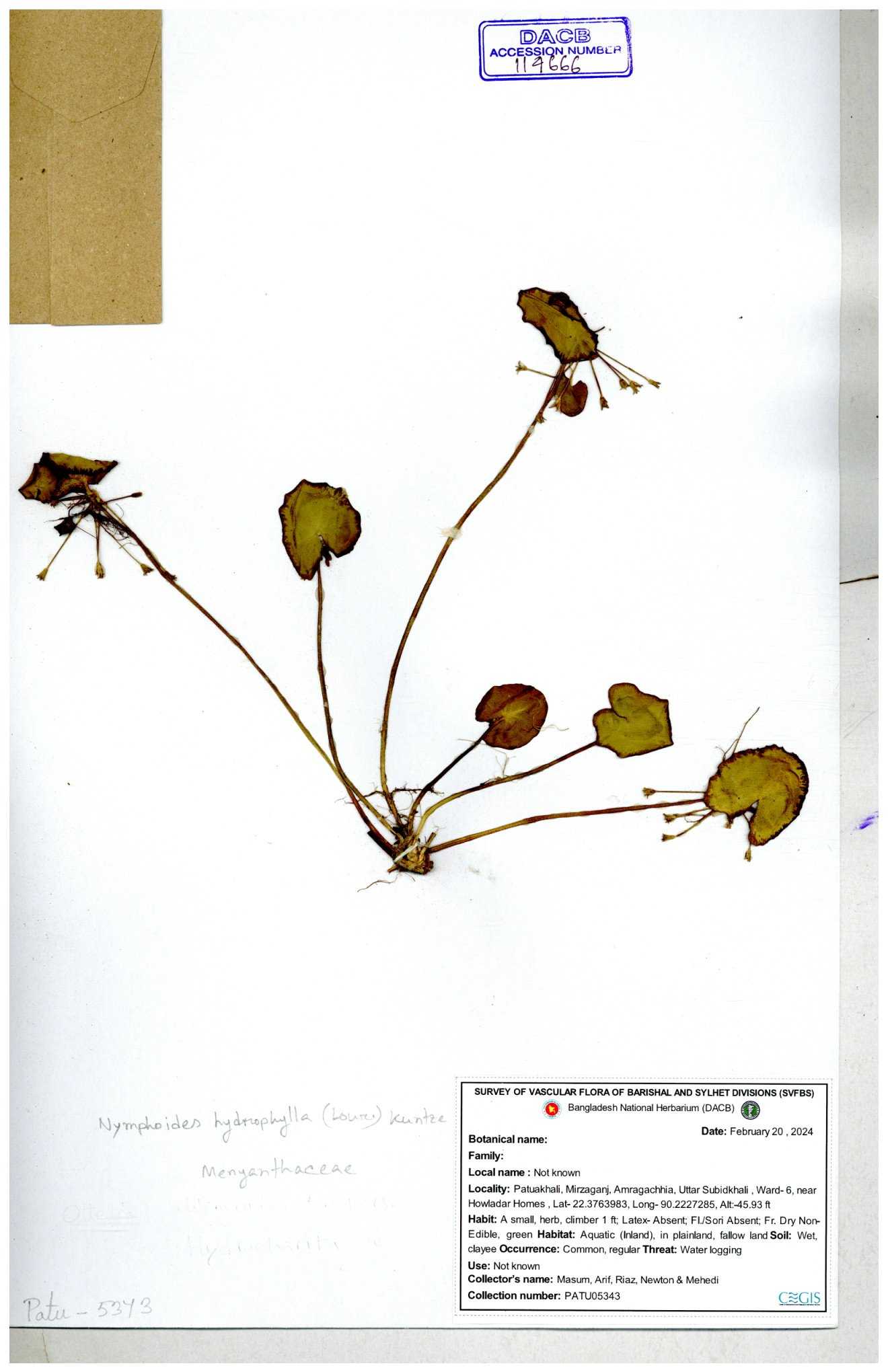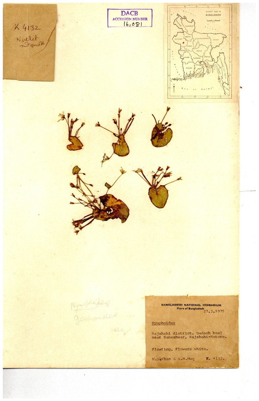 | 87195 | Menyanthaceae | Nymphoides indica (L.) Kuntze | Cadmala | Dr. M. Sultana | DMS-4770 27-05-2022 |
