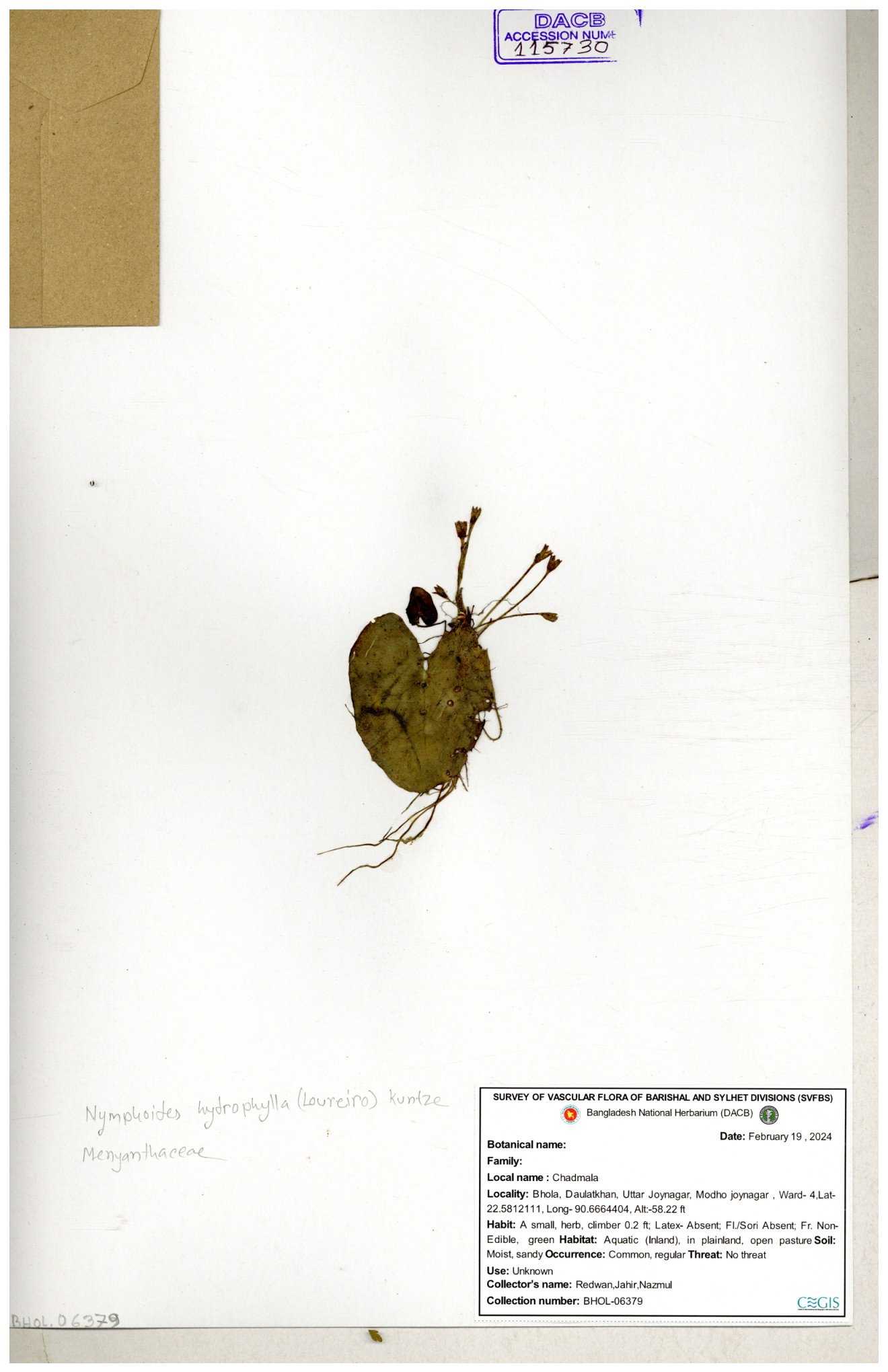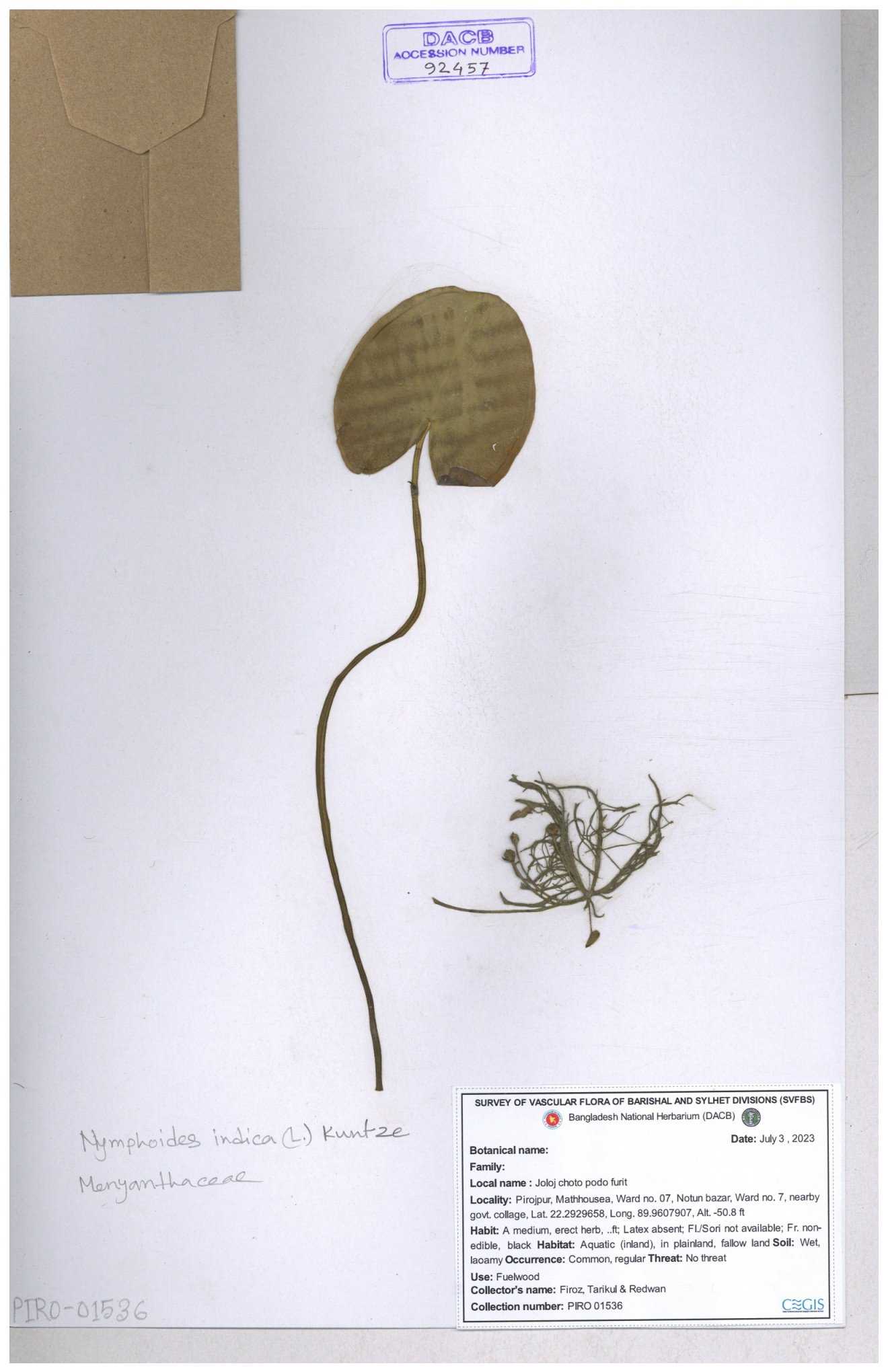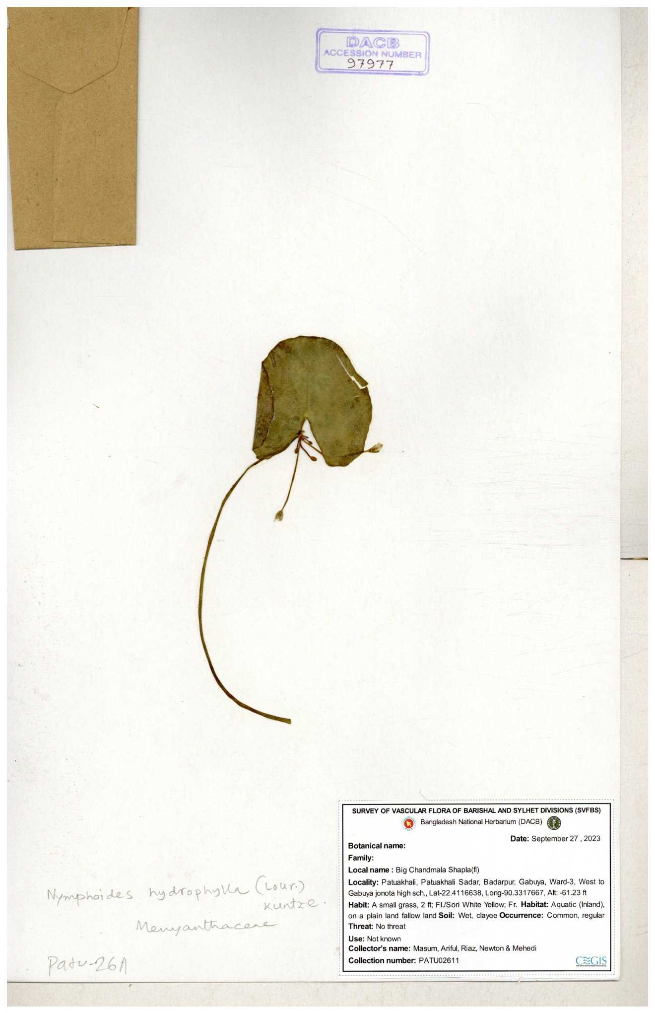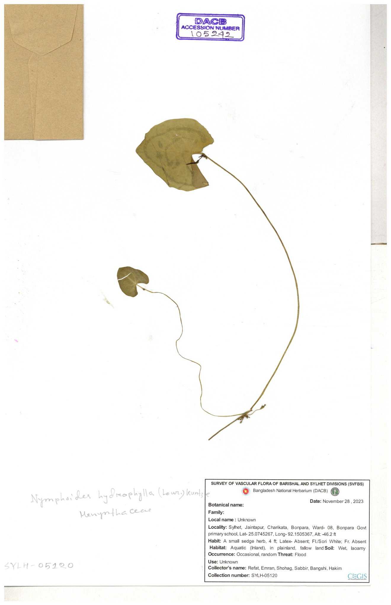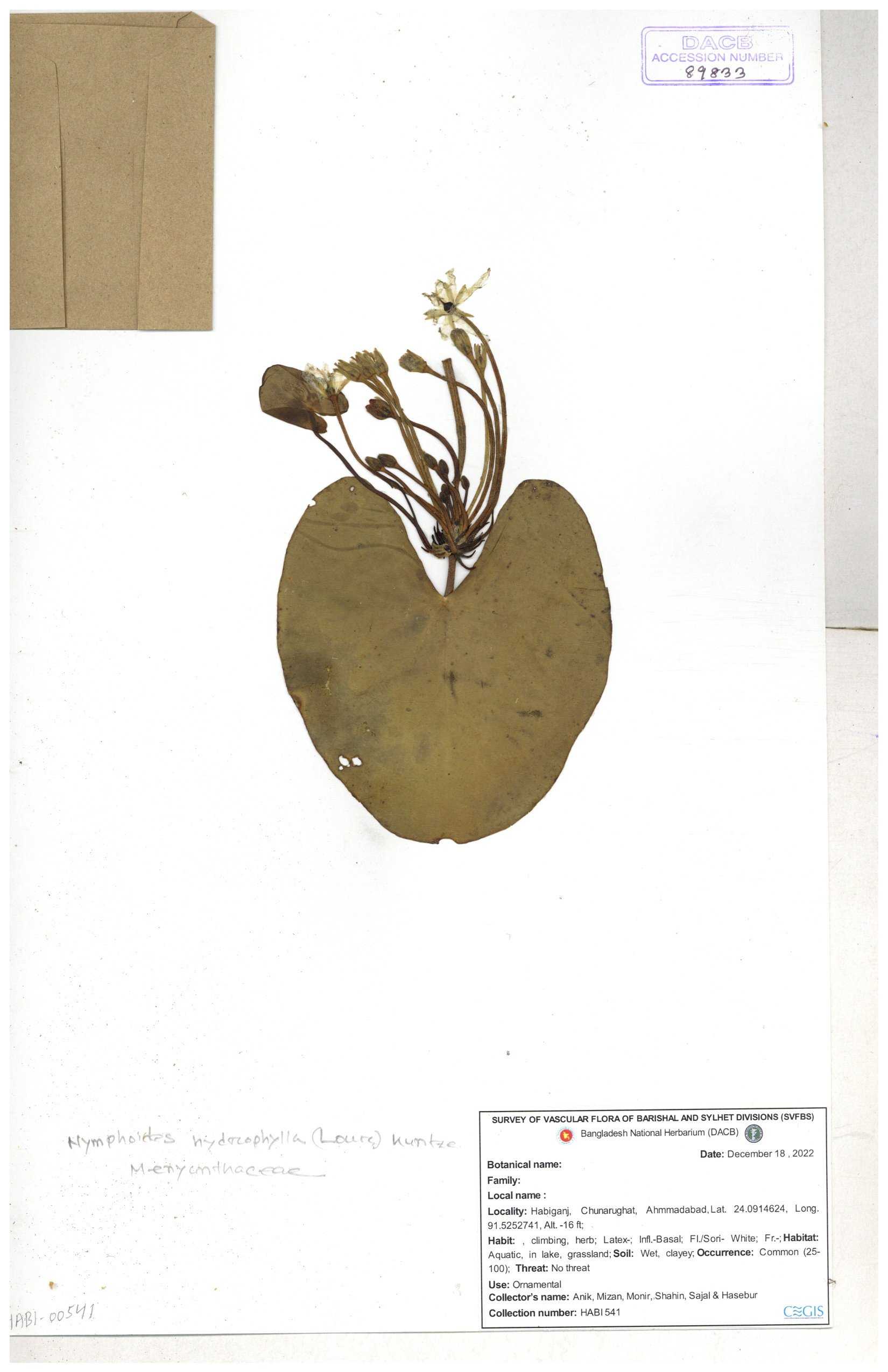 | 87195 | Menyanthaceae | Nymphoides indica (L.) Kuntze | Cadmala | Dr. M. Sultana | DMS-4770 27-05-2022 |
