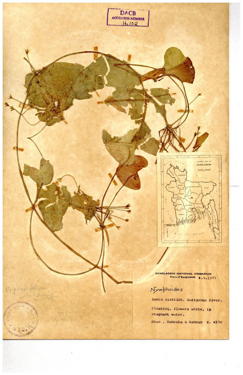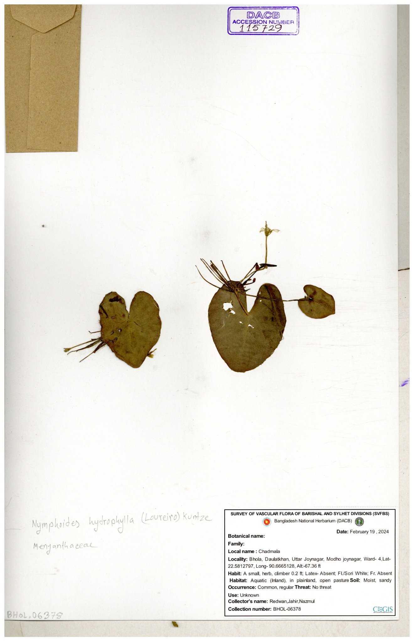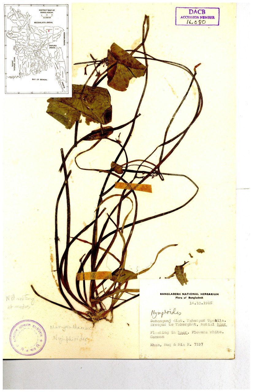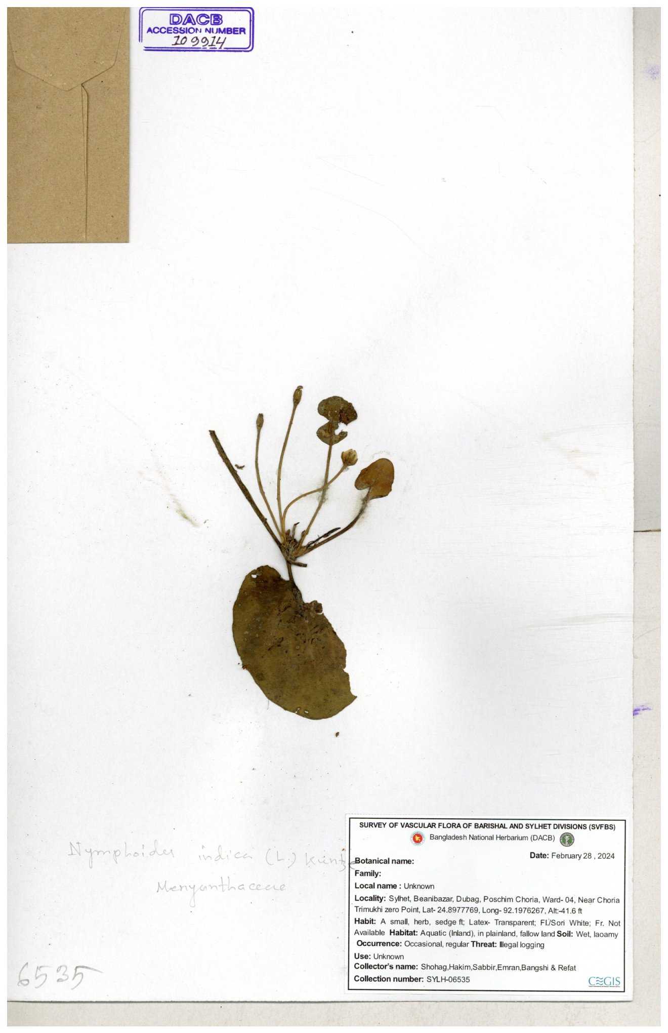 | 87195 | Menyanthaceae | Nymphoides indica (L.) Kuntze | Cadmala | Dr. M. Sultana | DMS-4770 27-05-2022 |
