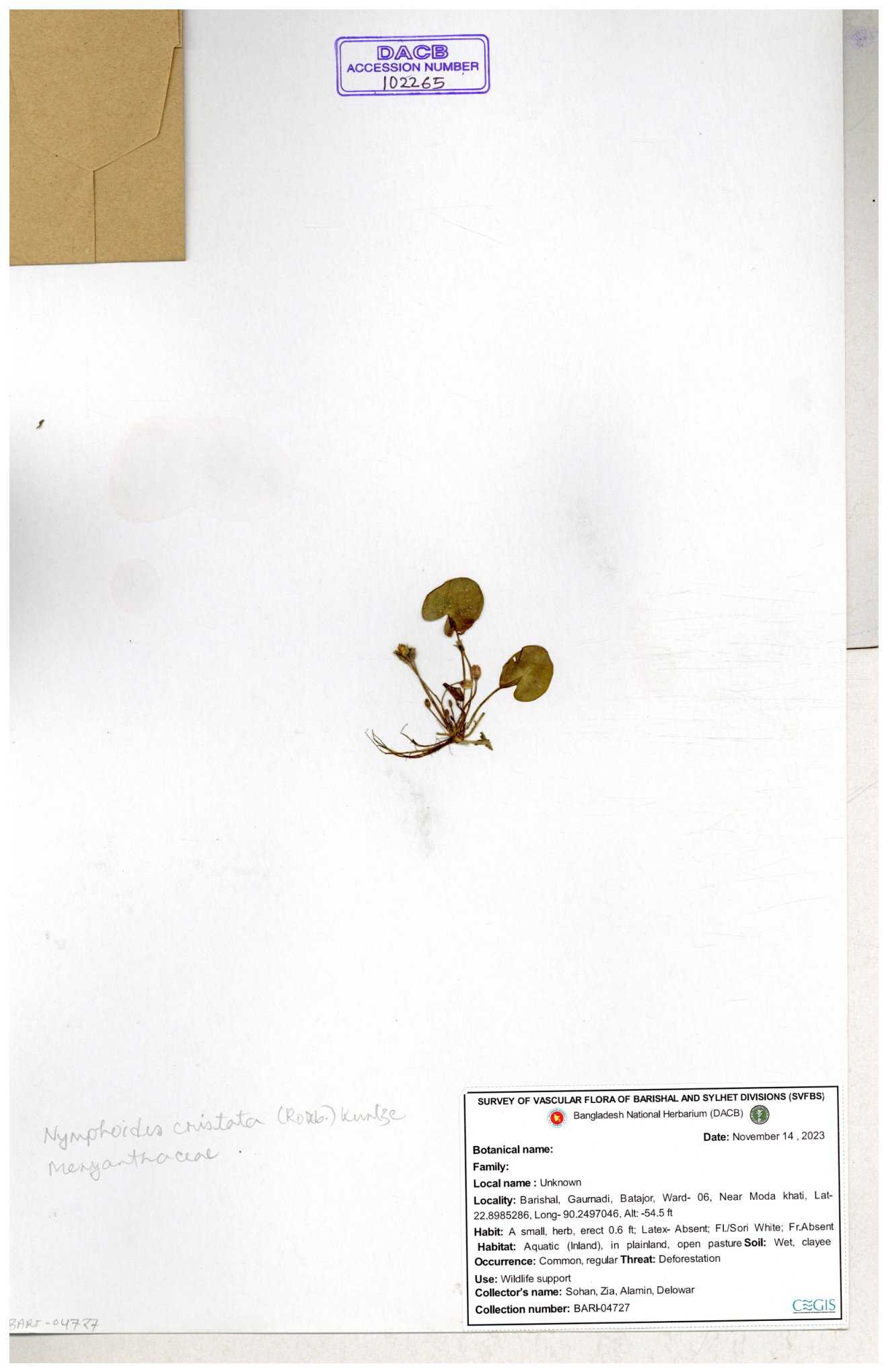 | 102265 | Menyanthaceae | Nymphoides cristata | 30-11--0001 |