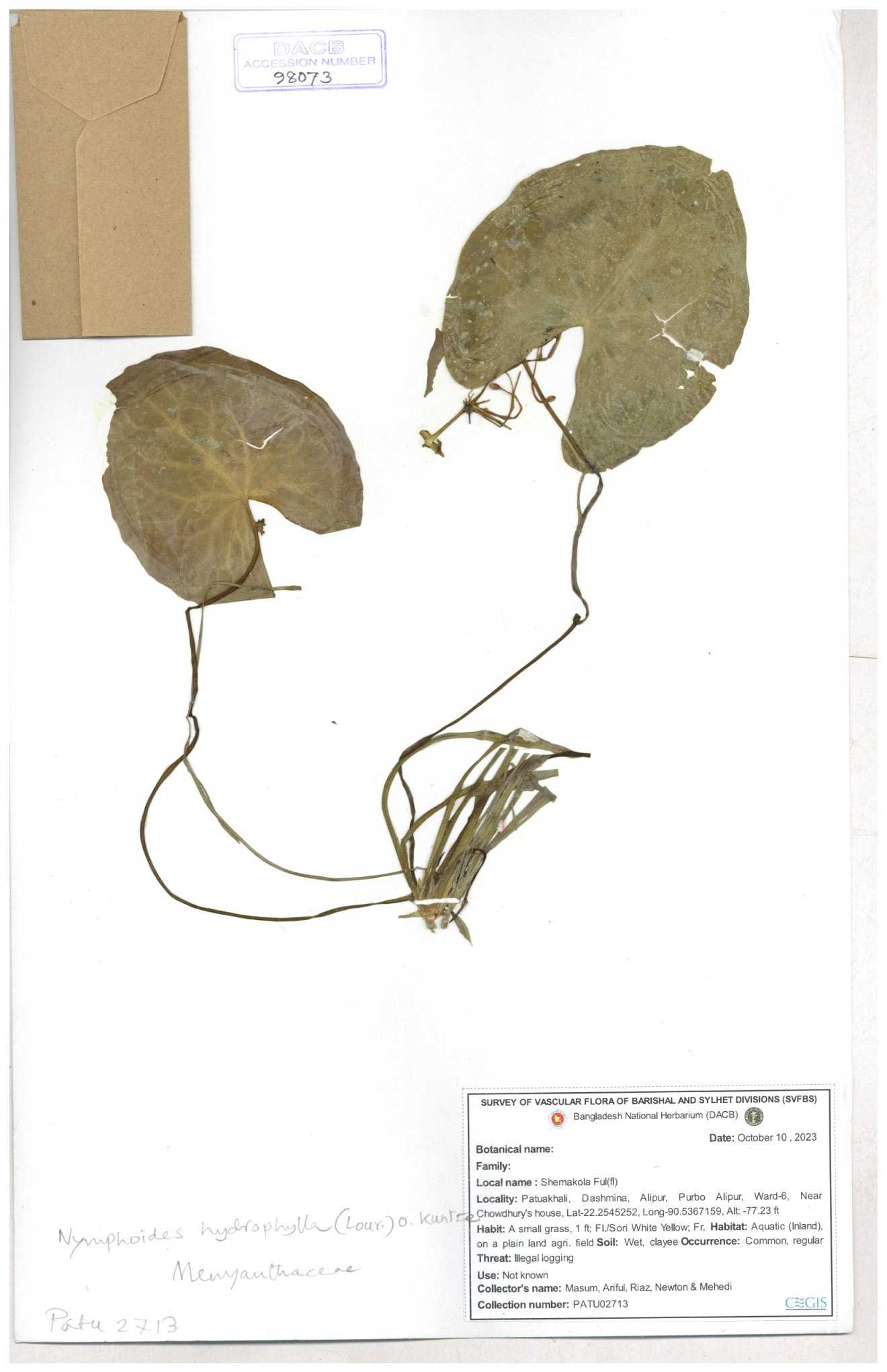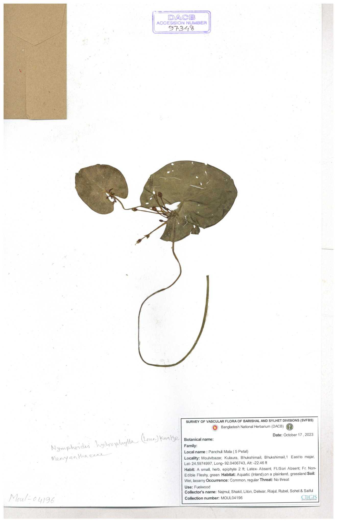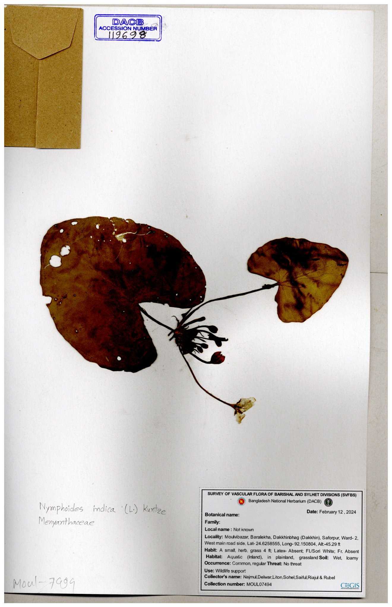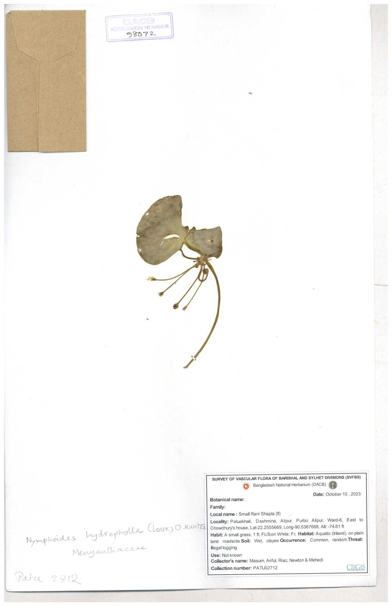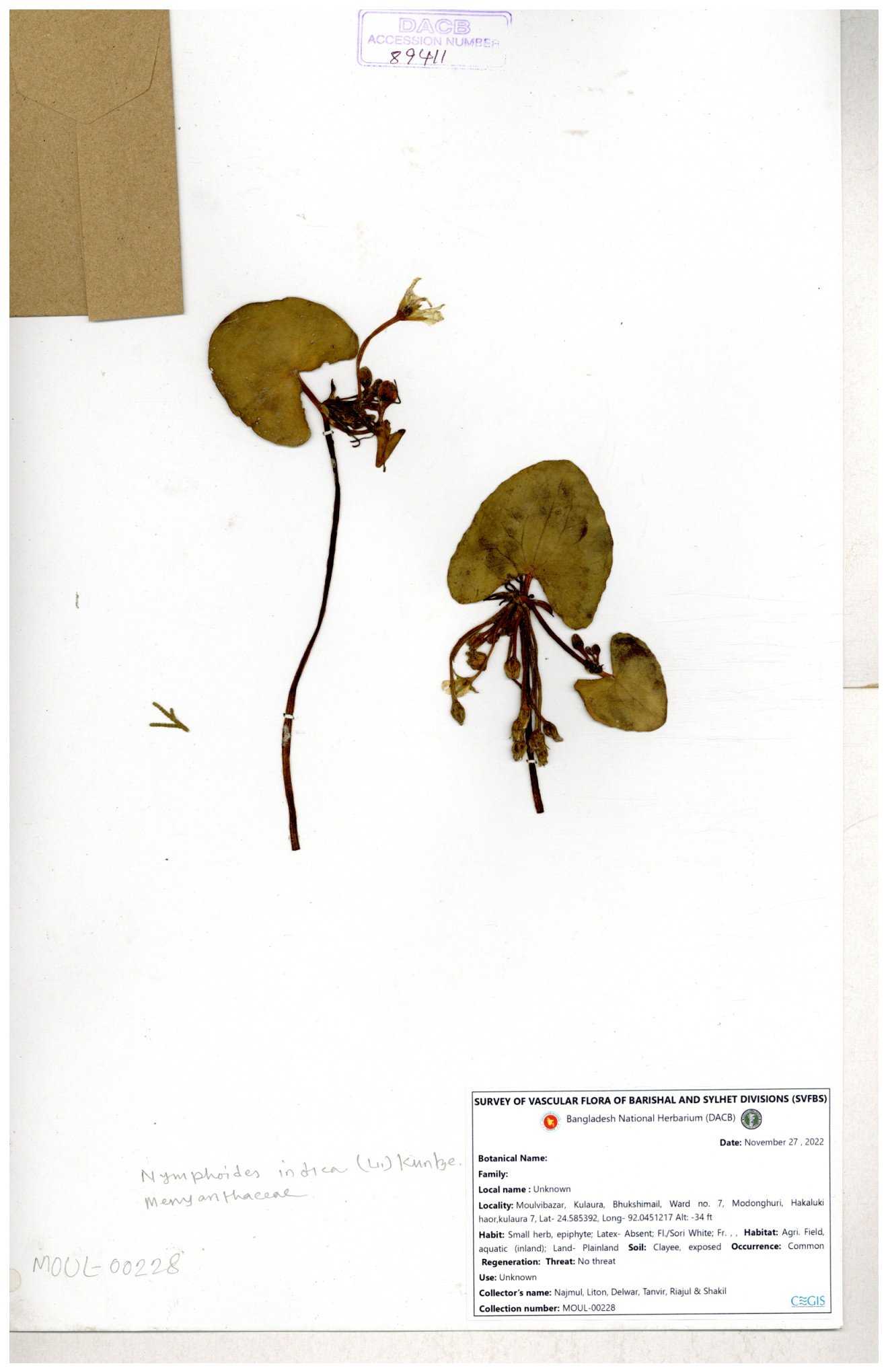 | 93034 | Menyanthaceae | Nymphoides indica Kunth | Nazul, Liton, Delwar, Riajul, Shakil, Mahdi & Rubel | MOUL02379 07-04-2023 |