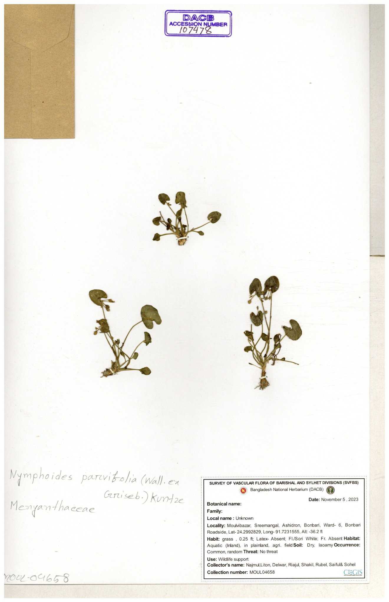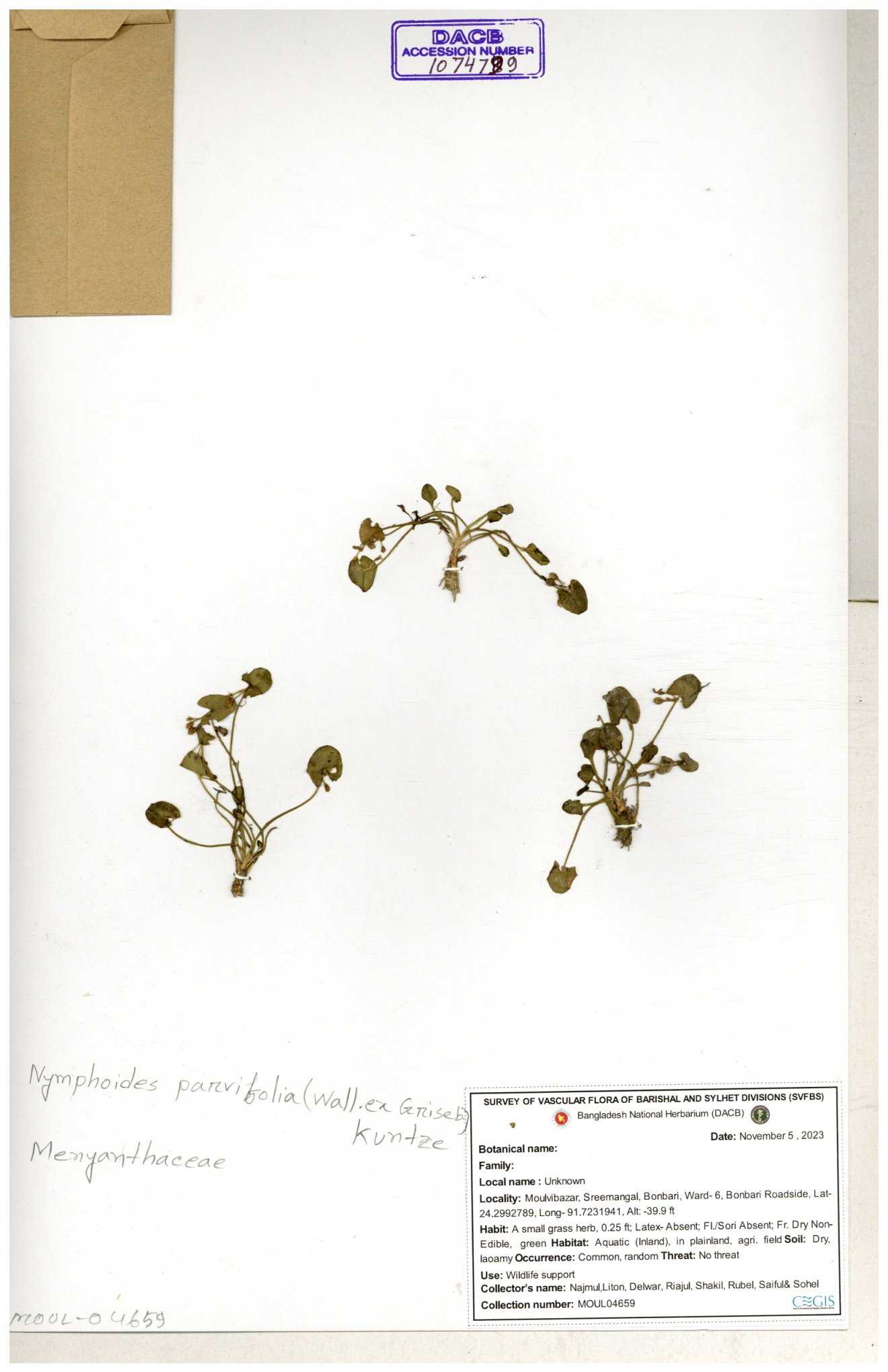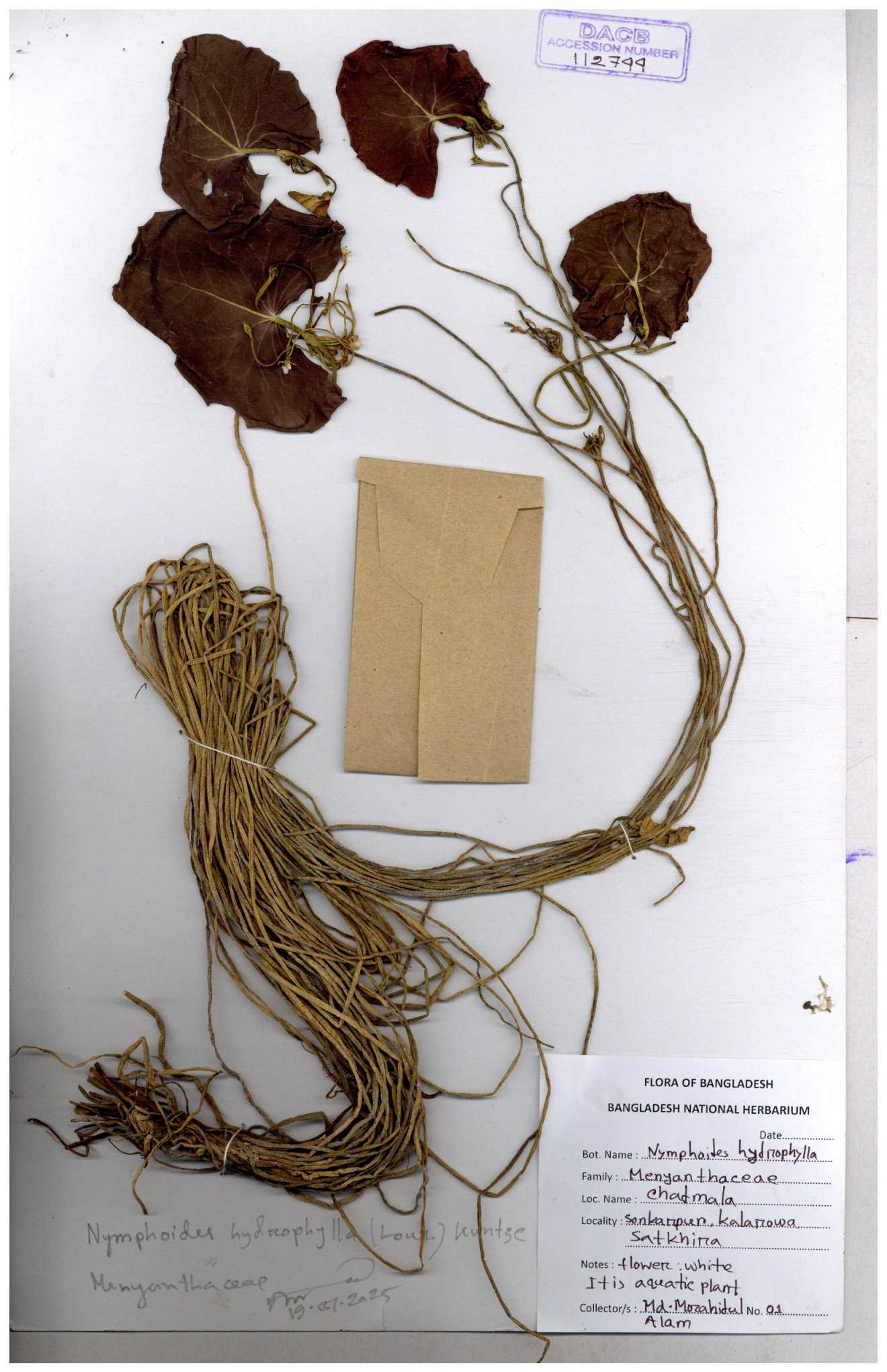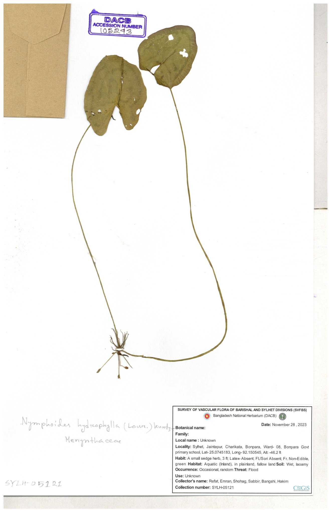 | 93034 | Menyanthaceae | Nymphoides indica Kunth | Nazul, Liton, Delwar, Riajul, Shakil, Mahdi & Rubel | MOUL02379 07-04-2023 |