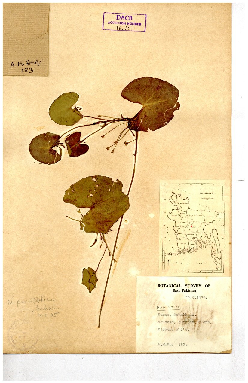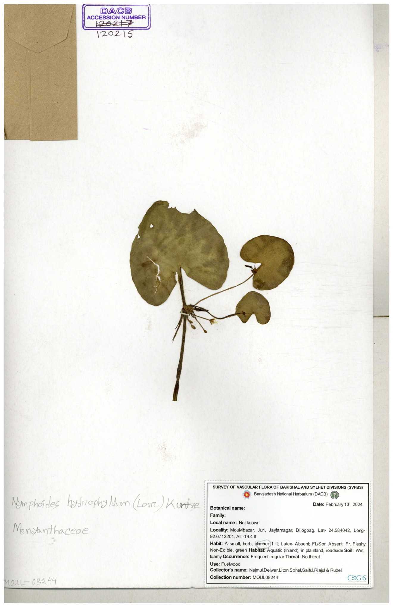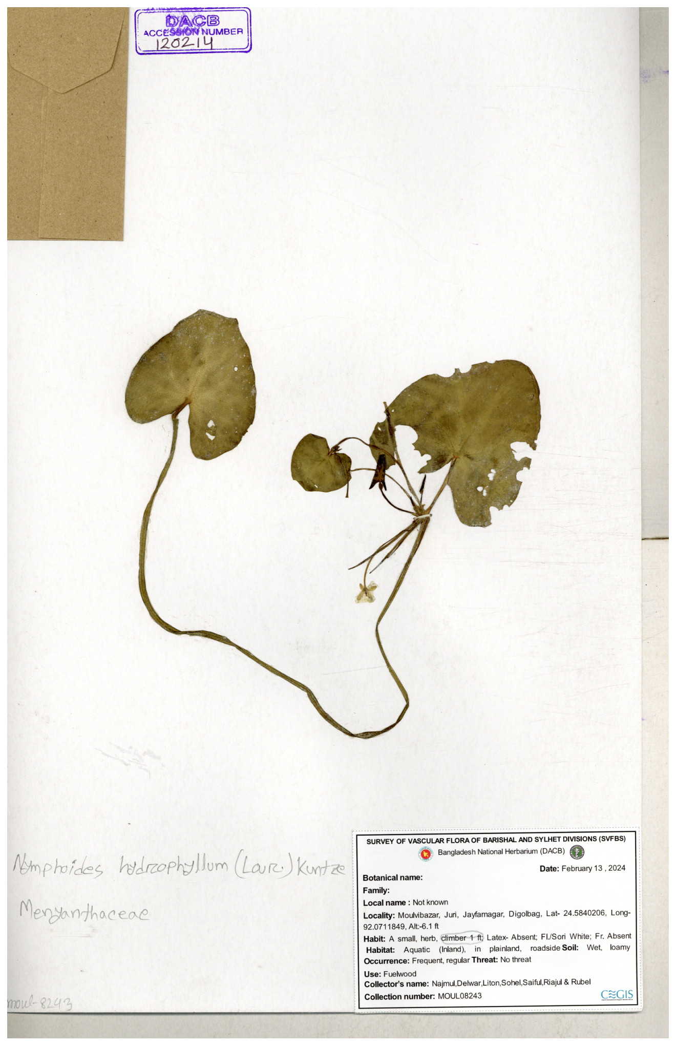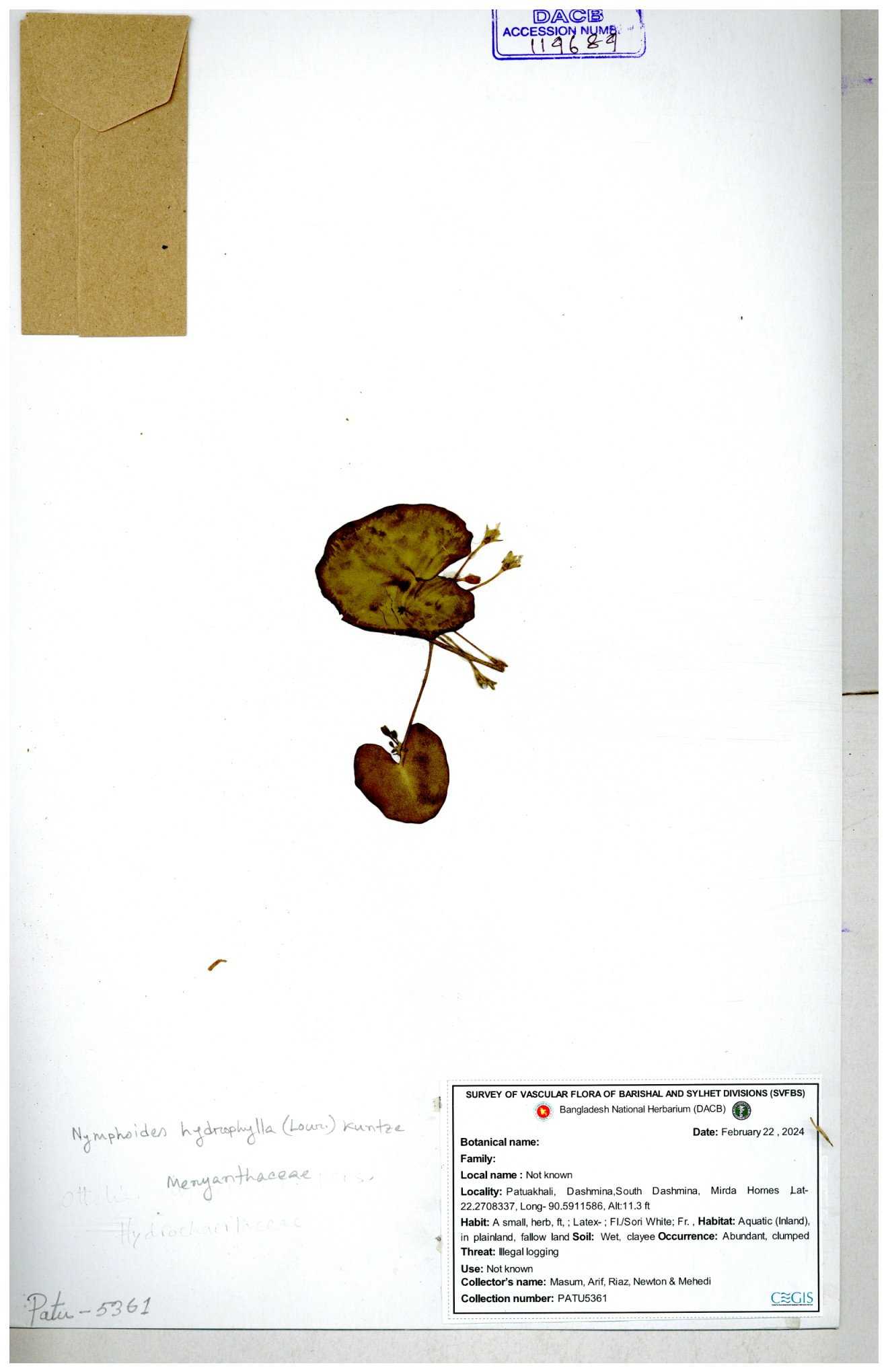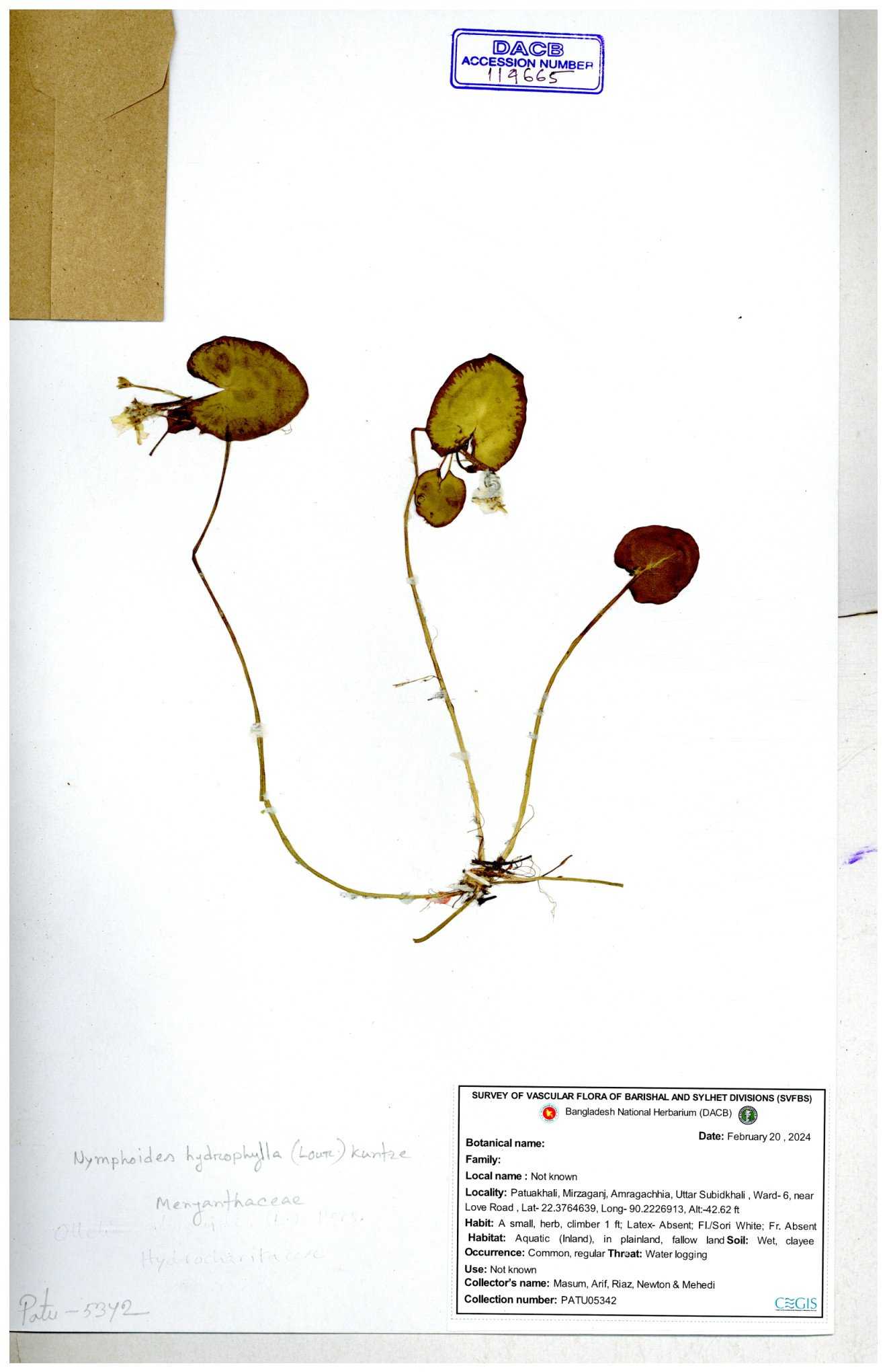 | 93034 | Menyanthaceae | Nymphoides indica Kunth | Nazul, Liton, Delwar, Riajul, Shakil, Mahdi & Rubel | MOUL02379 07-04-2023 |