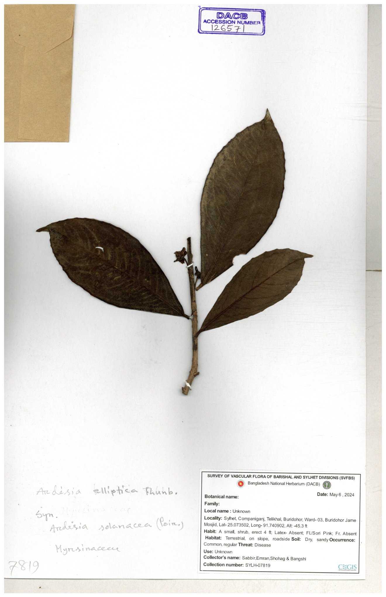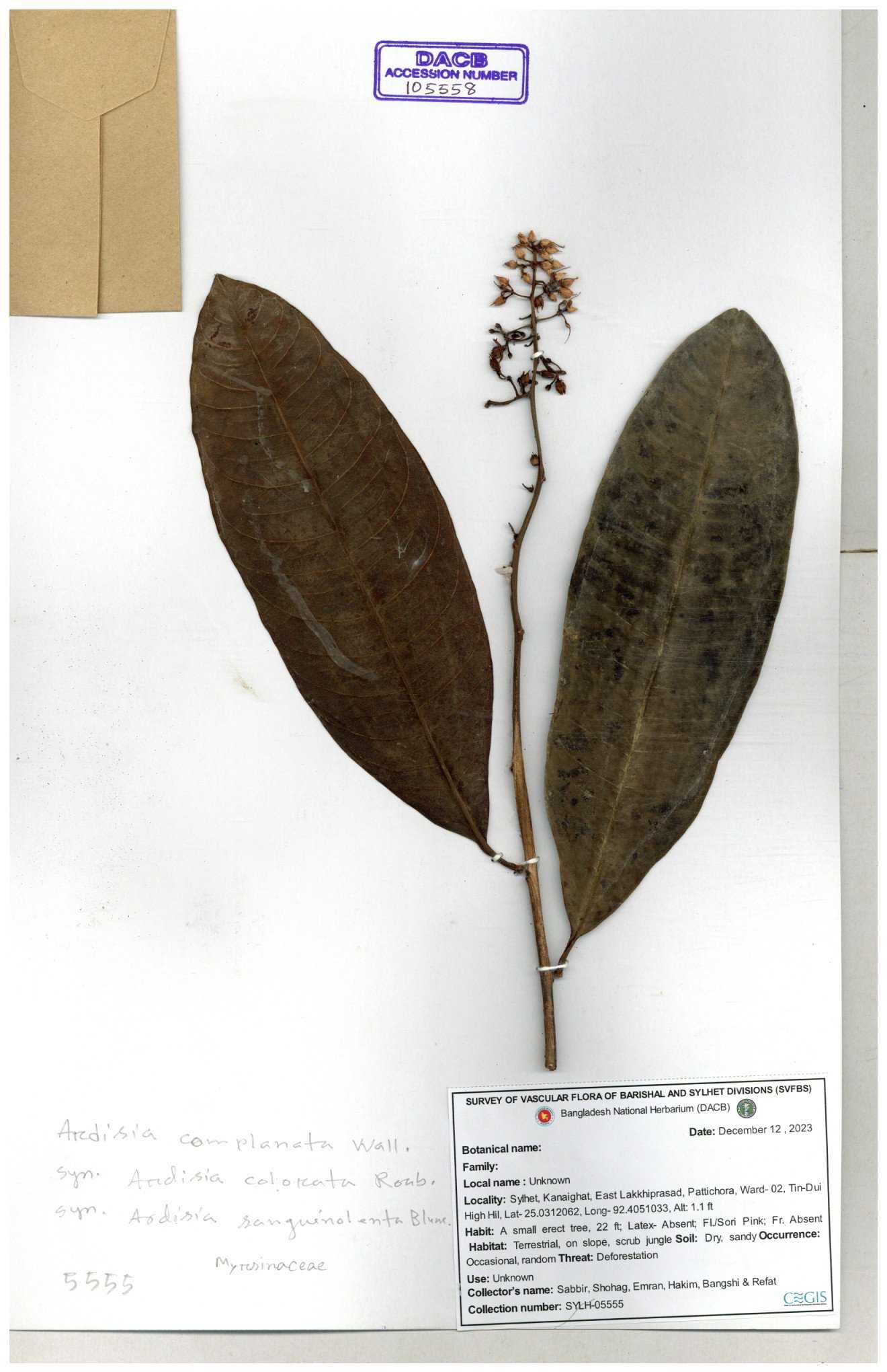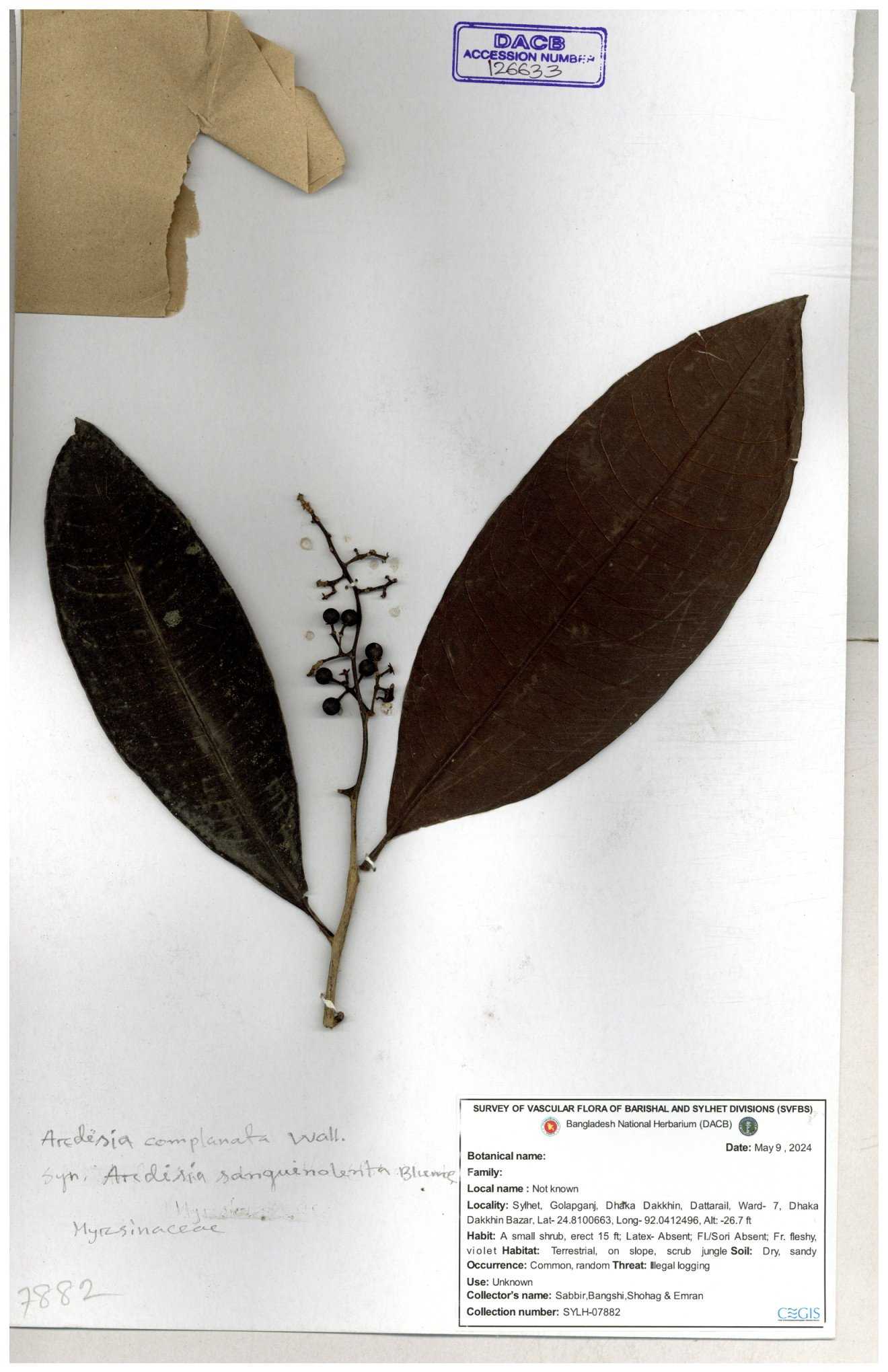 | 65810 | Myrsinaceae | Ardisia thomsonii Mez. | Unknown | Naimur Rahman | NR- 1349 02-12-2020 |