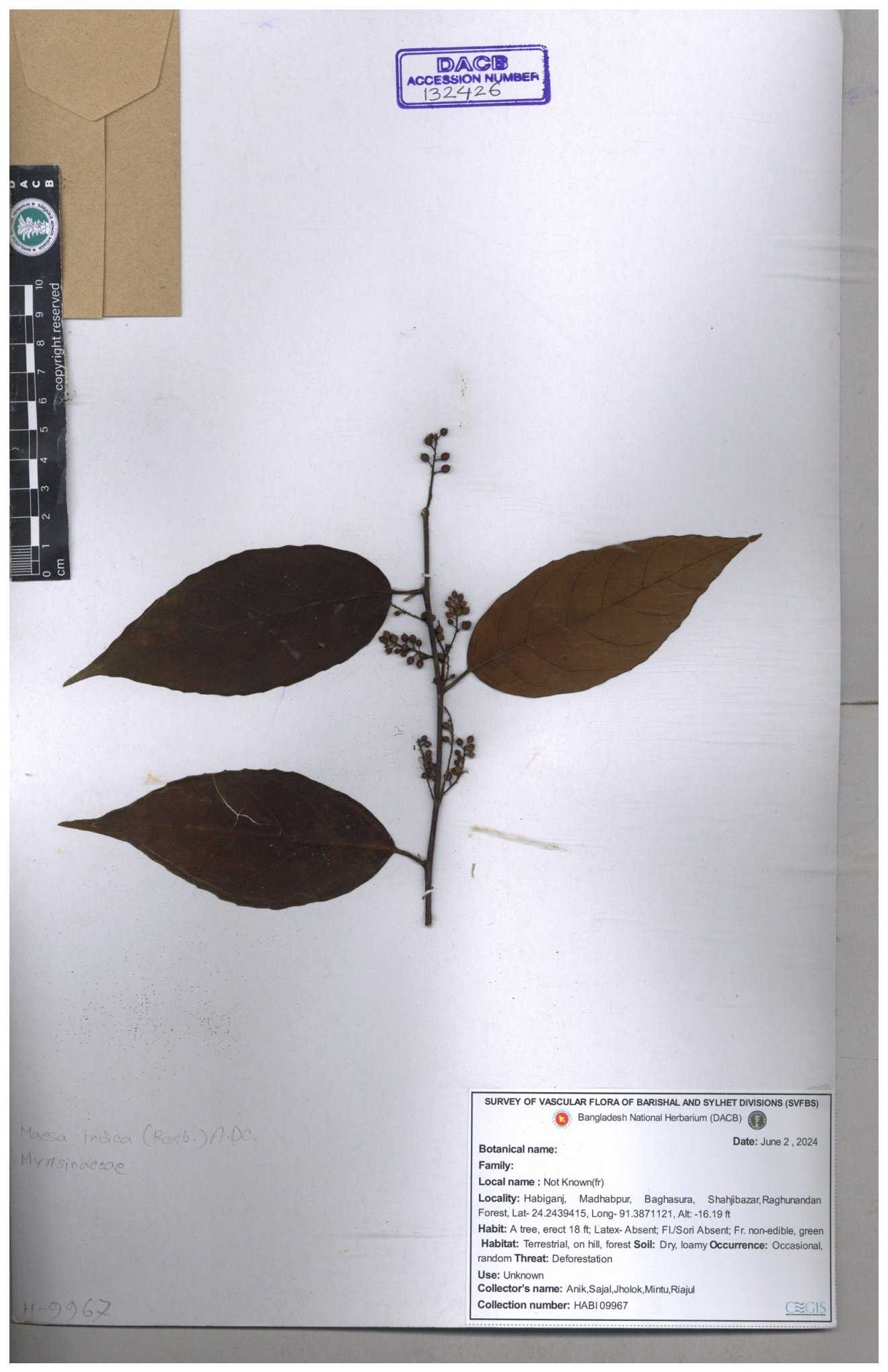 | 82313 | Myrsinaceae | Maesa indica | Kowser et al | KH-2899 18-12-2016 |
