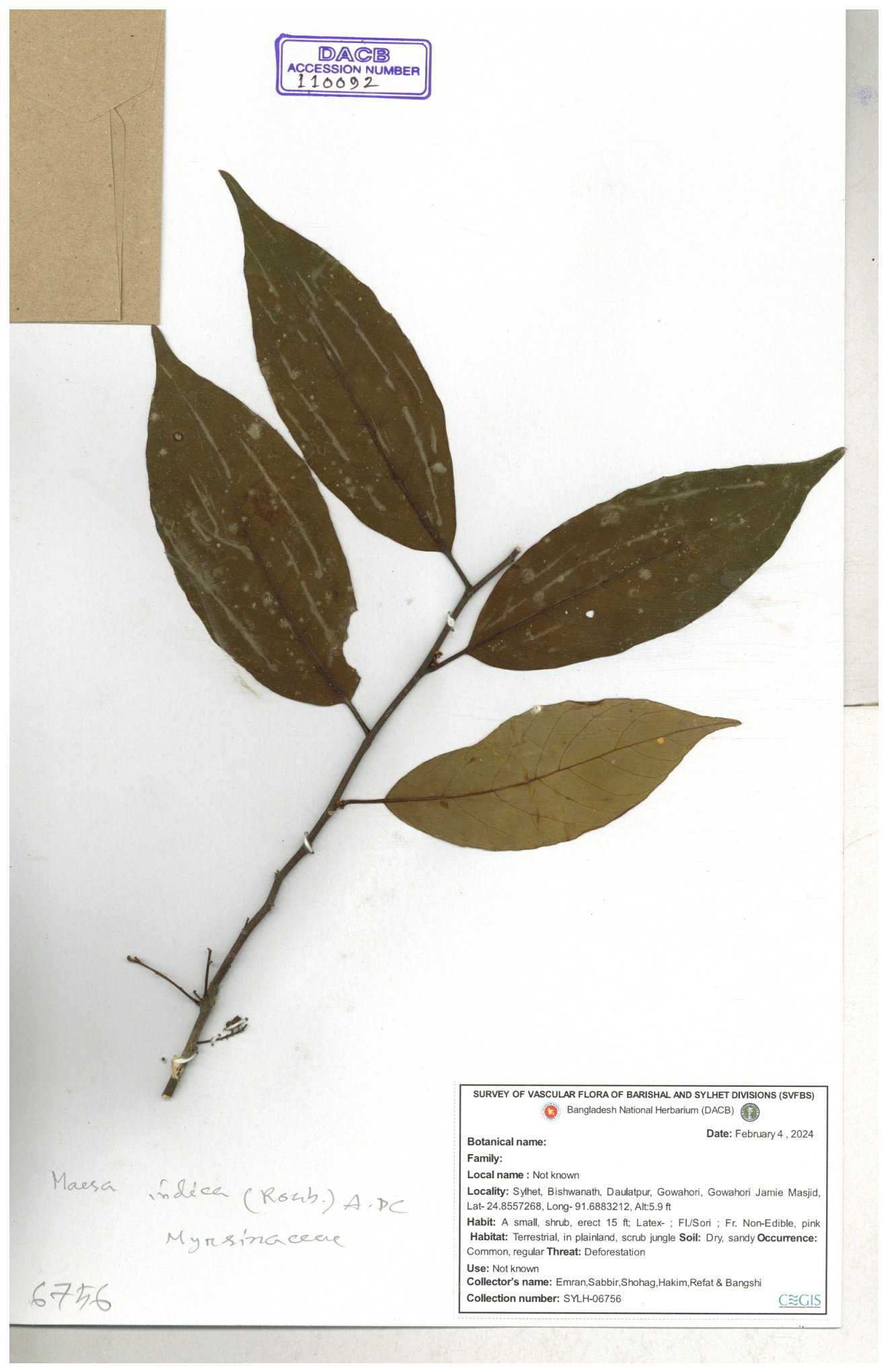 | 72928 | Myrsinaceae | Maesa chisia | Md. Shahidul Islam et | MSI-6786 10-01-2018 |