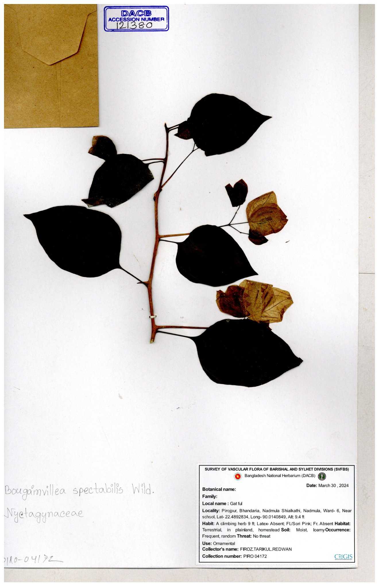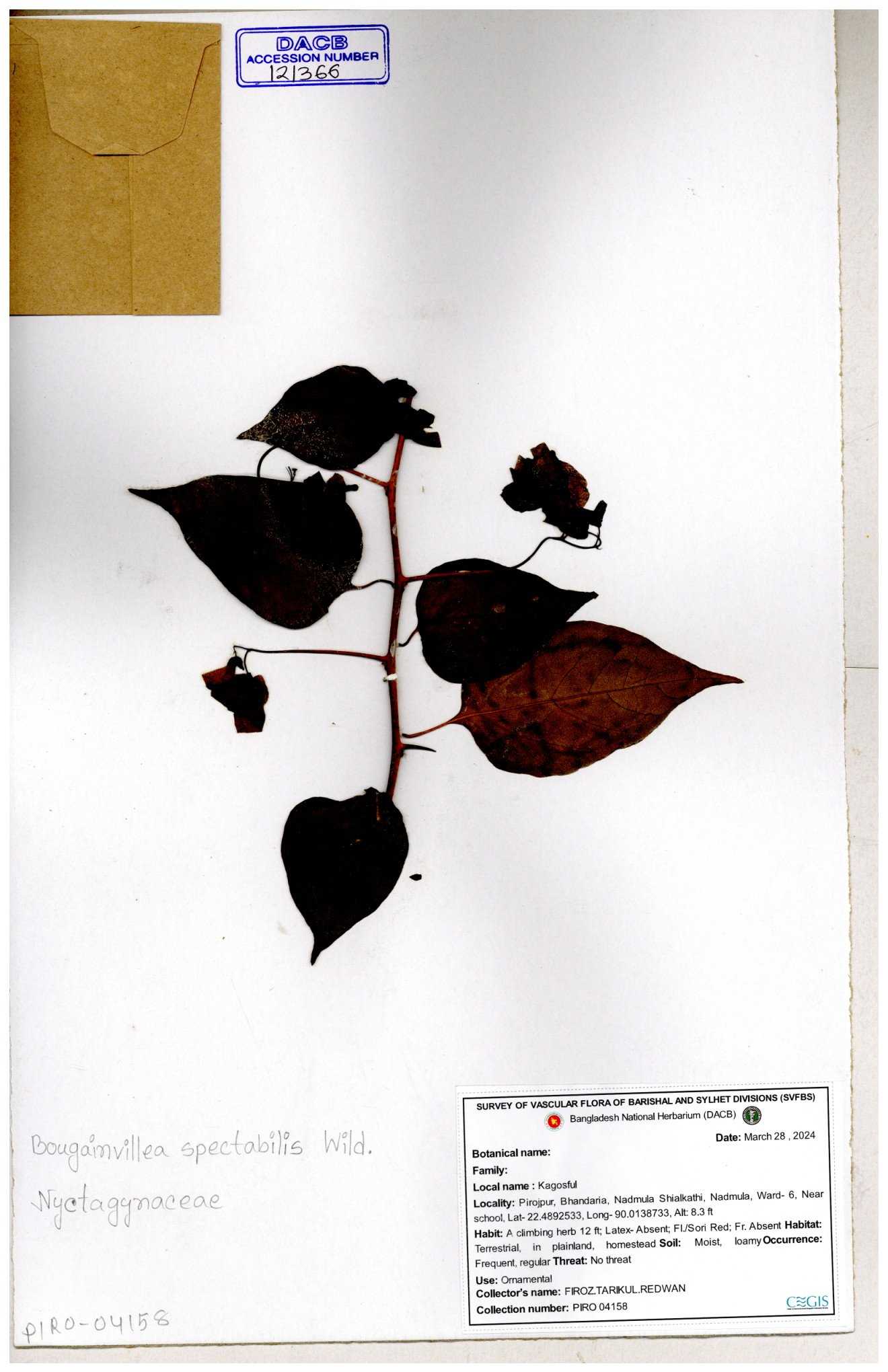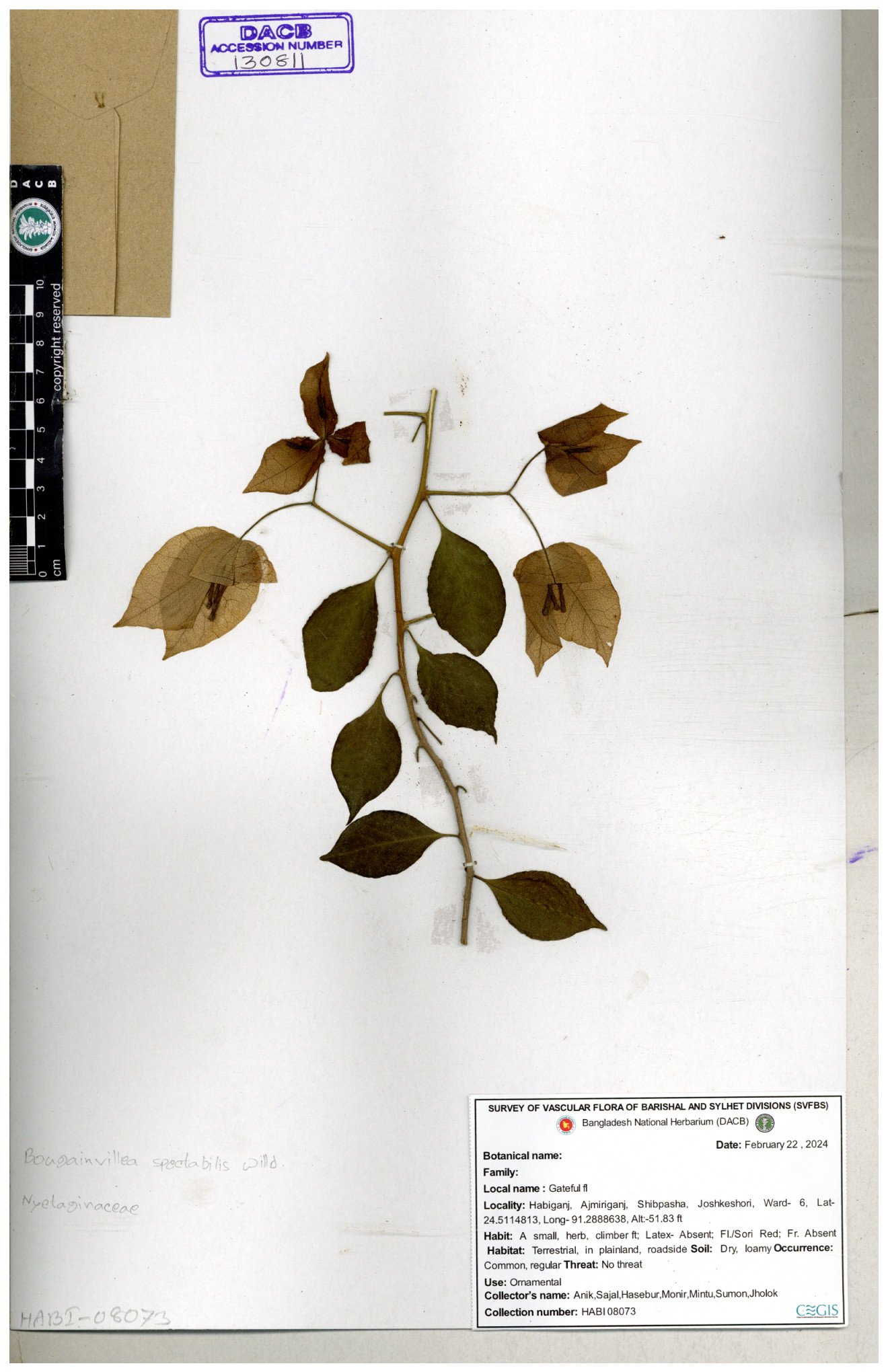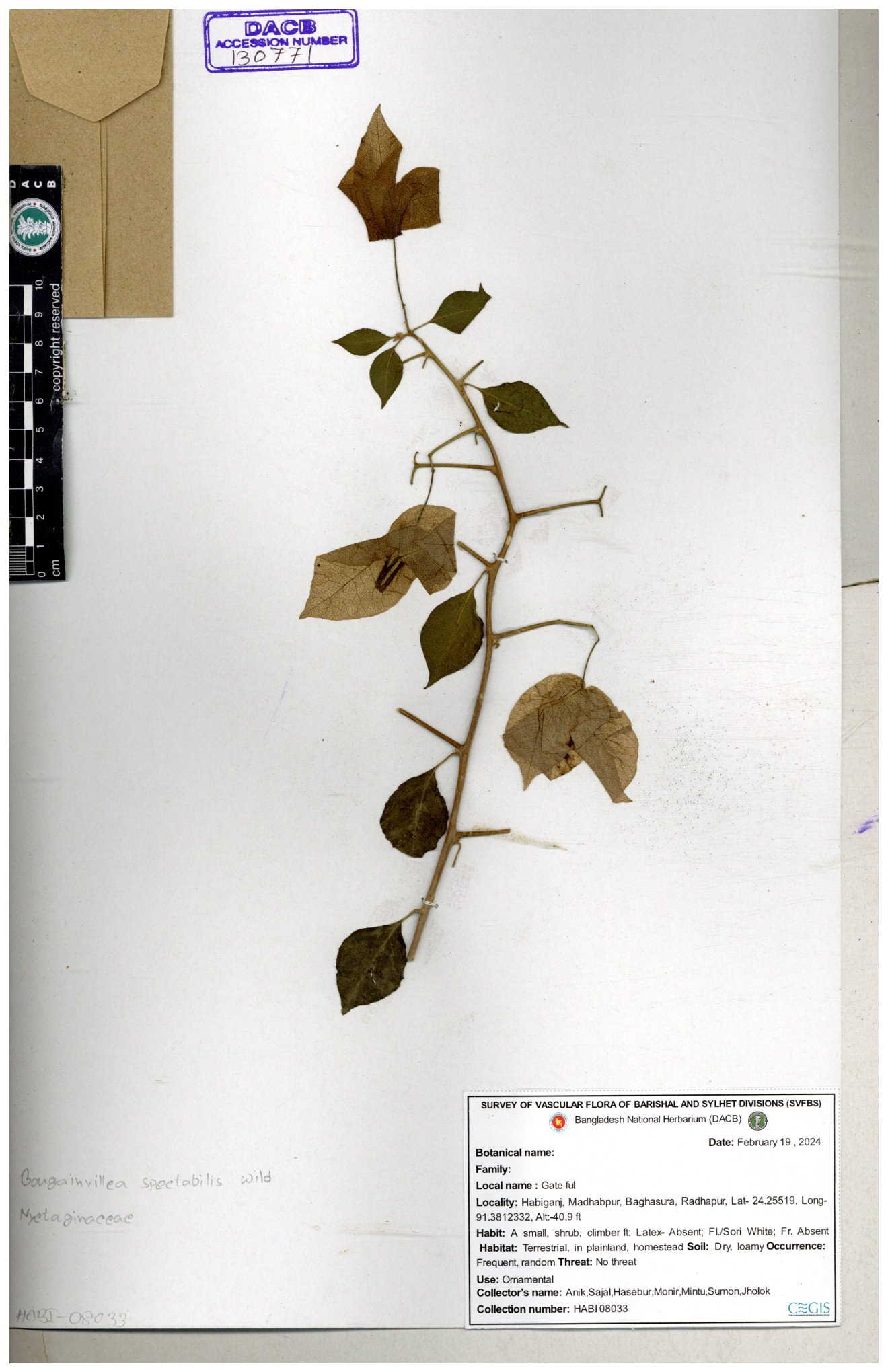 | 61953 | Nyctaginaceae | Bougainvillea spectabilis Willd. | Dr.M Sultana, Dr. M. Sayedur Rahman & Naimur Rahman | DMS.2689 05-02-2019 |