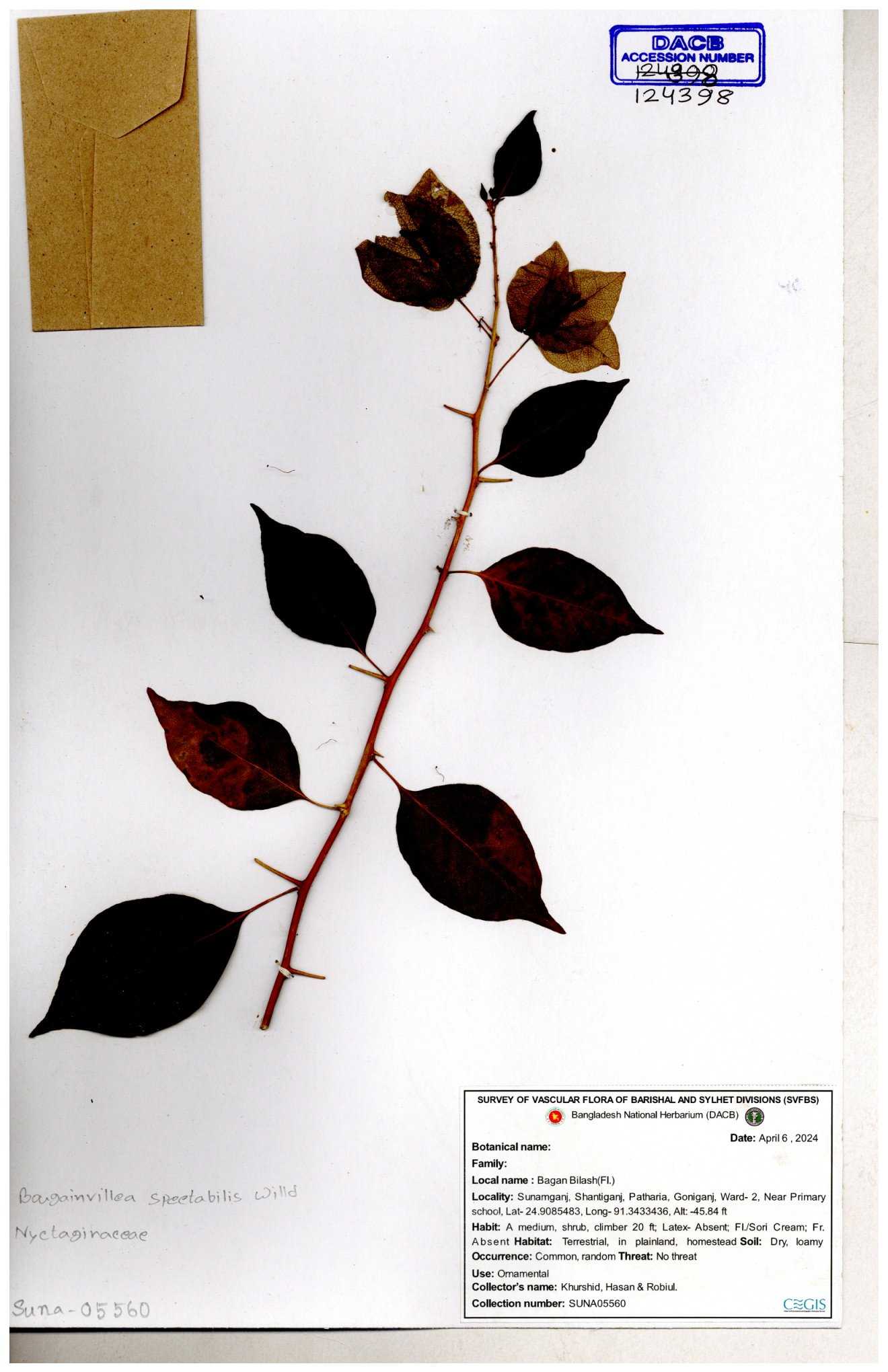 | 62815 | Nyctaginaceae | Bougainvillea glabra Chois | Dr.M Sultana, Dr. M. Sayedur Rahman & Naimur Rahman | DMS.2651 05-02-2019 |