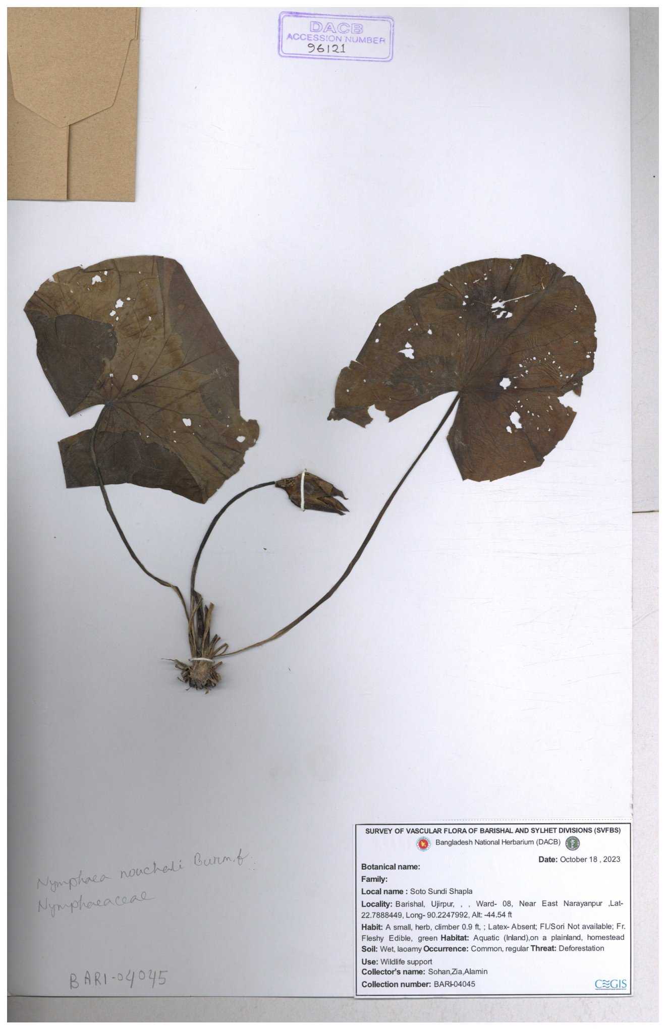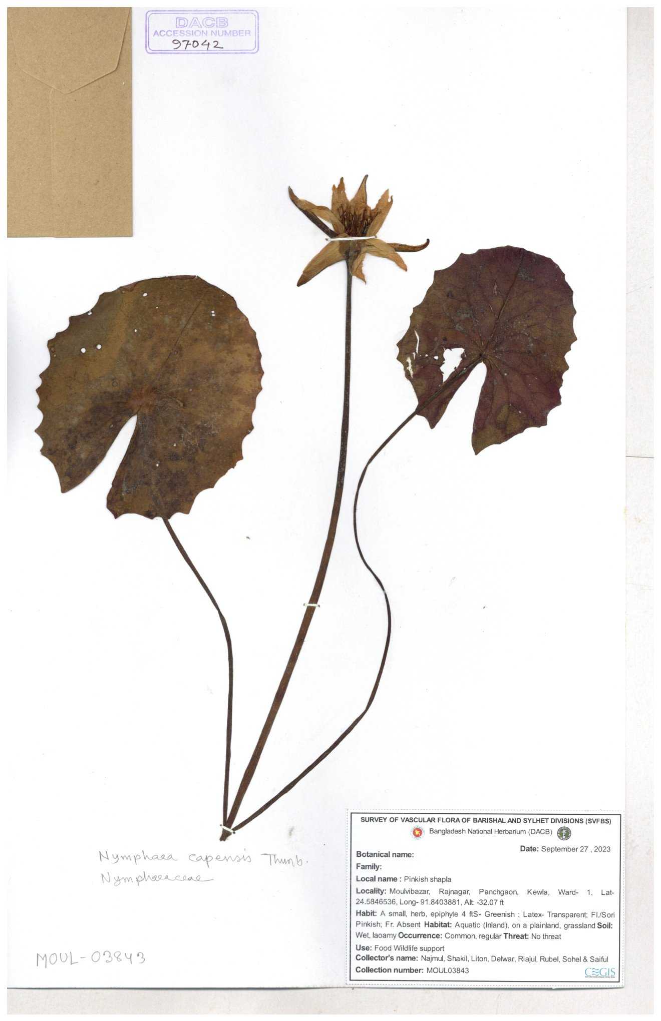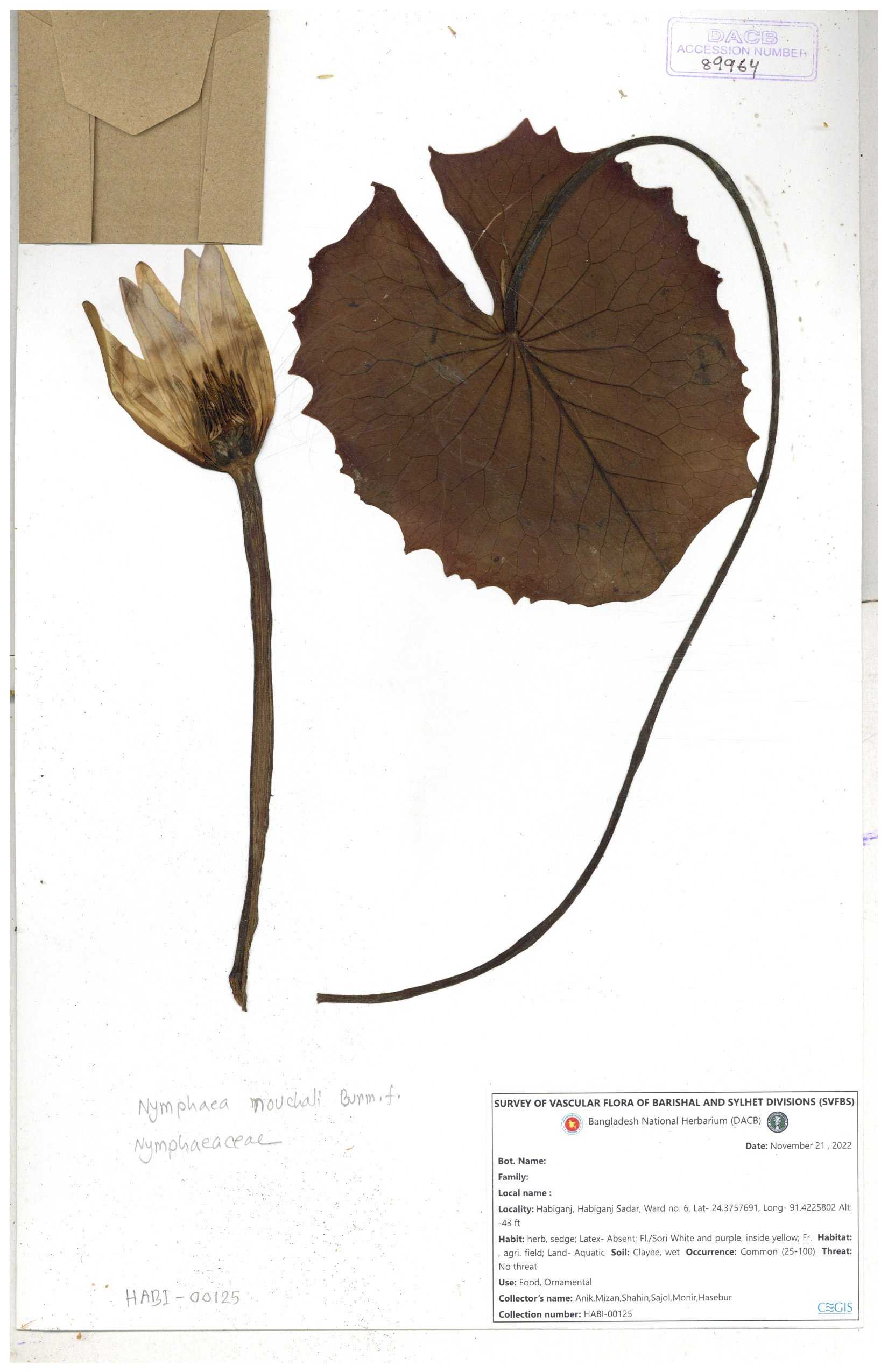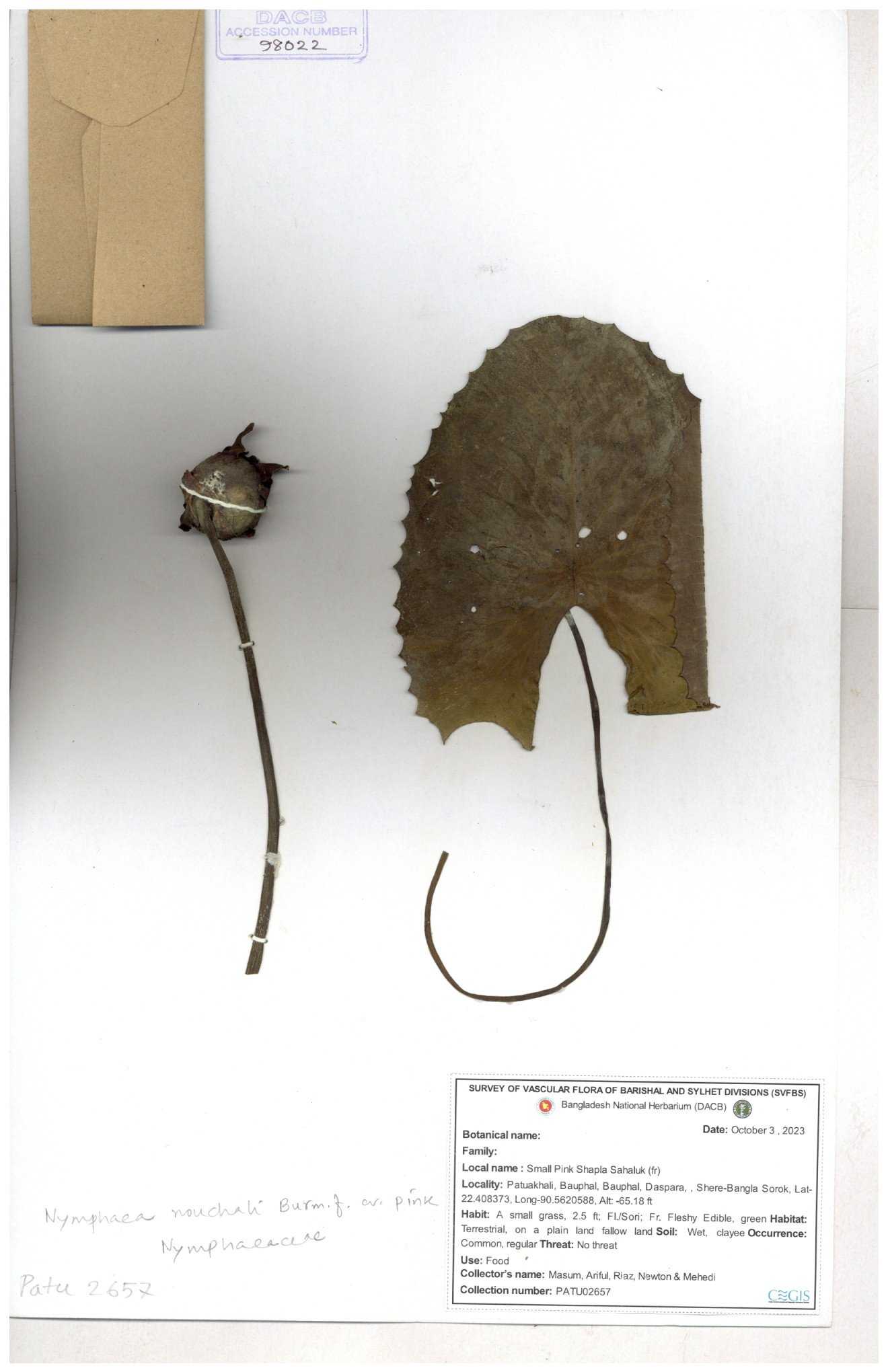| 66416 | Nymphaeaceae | Nymphaea nouchali Burm.f. | Shapla | Joyanta Chardra Roy, Kamrul Islam & Suborno Chakma | JCR-2323 19-01-2022 |