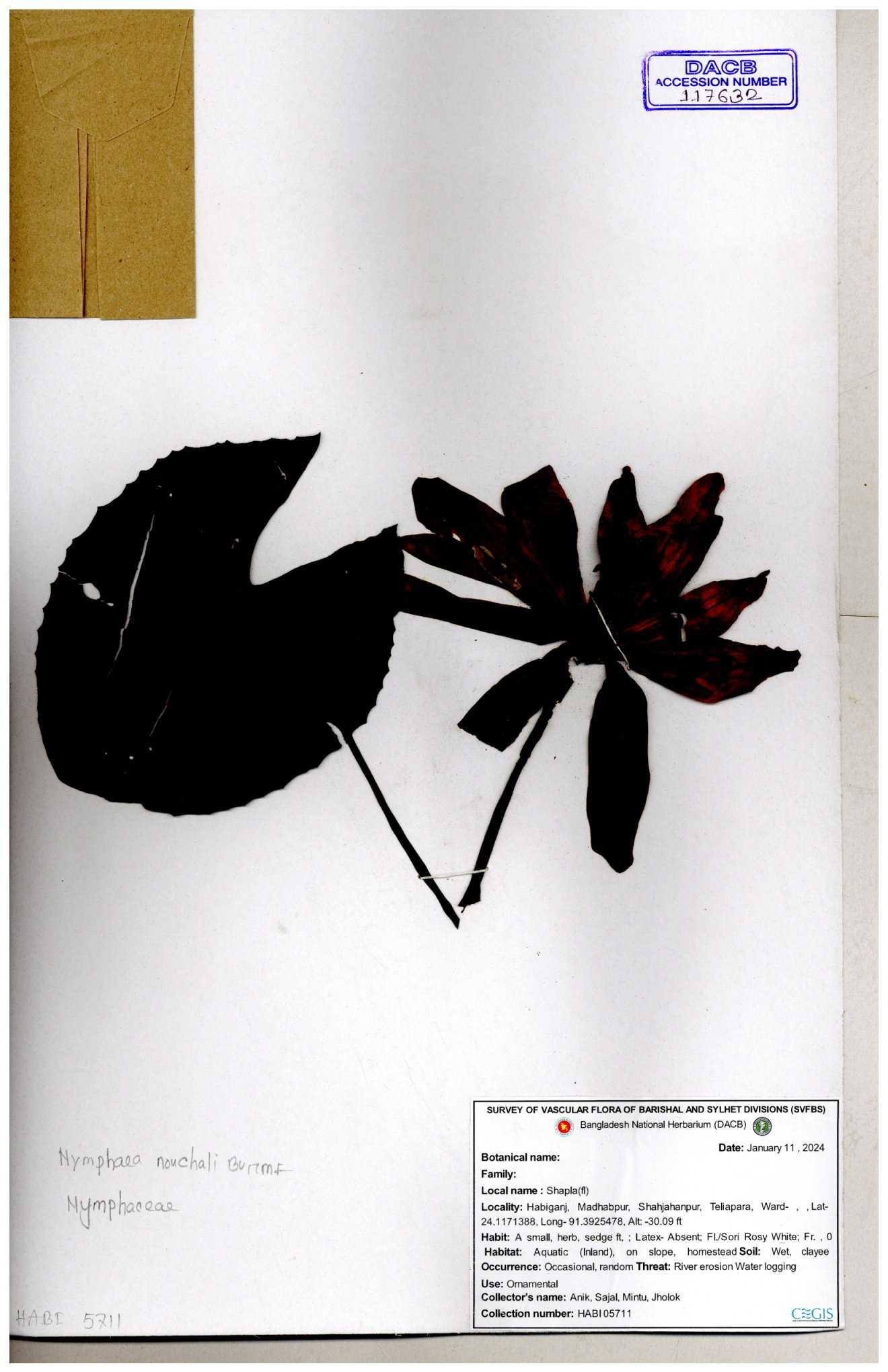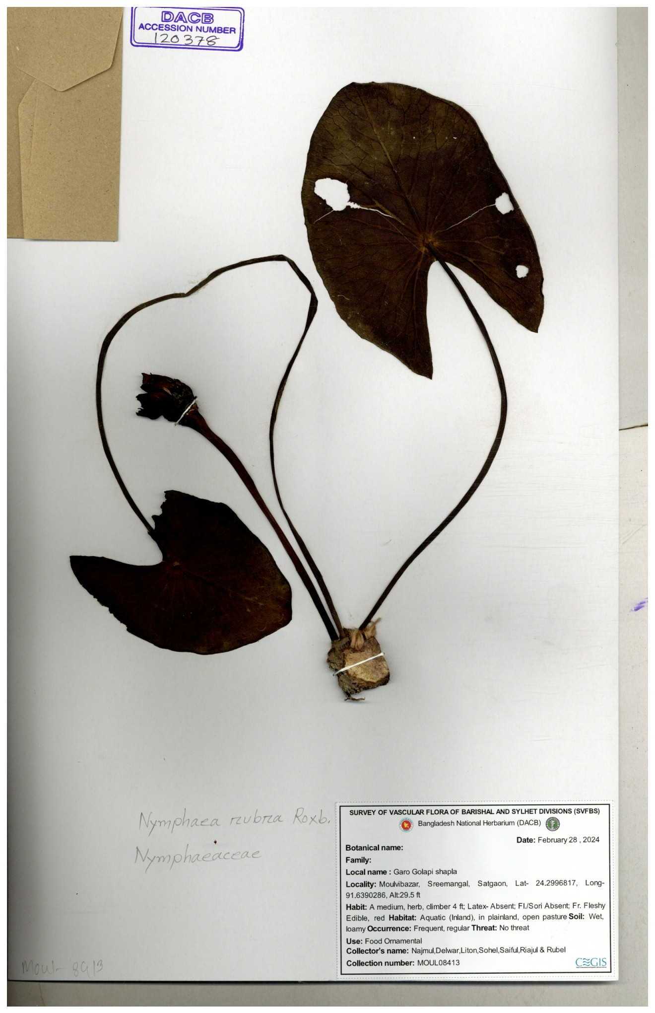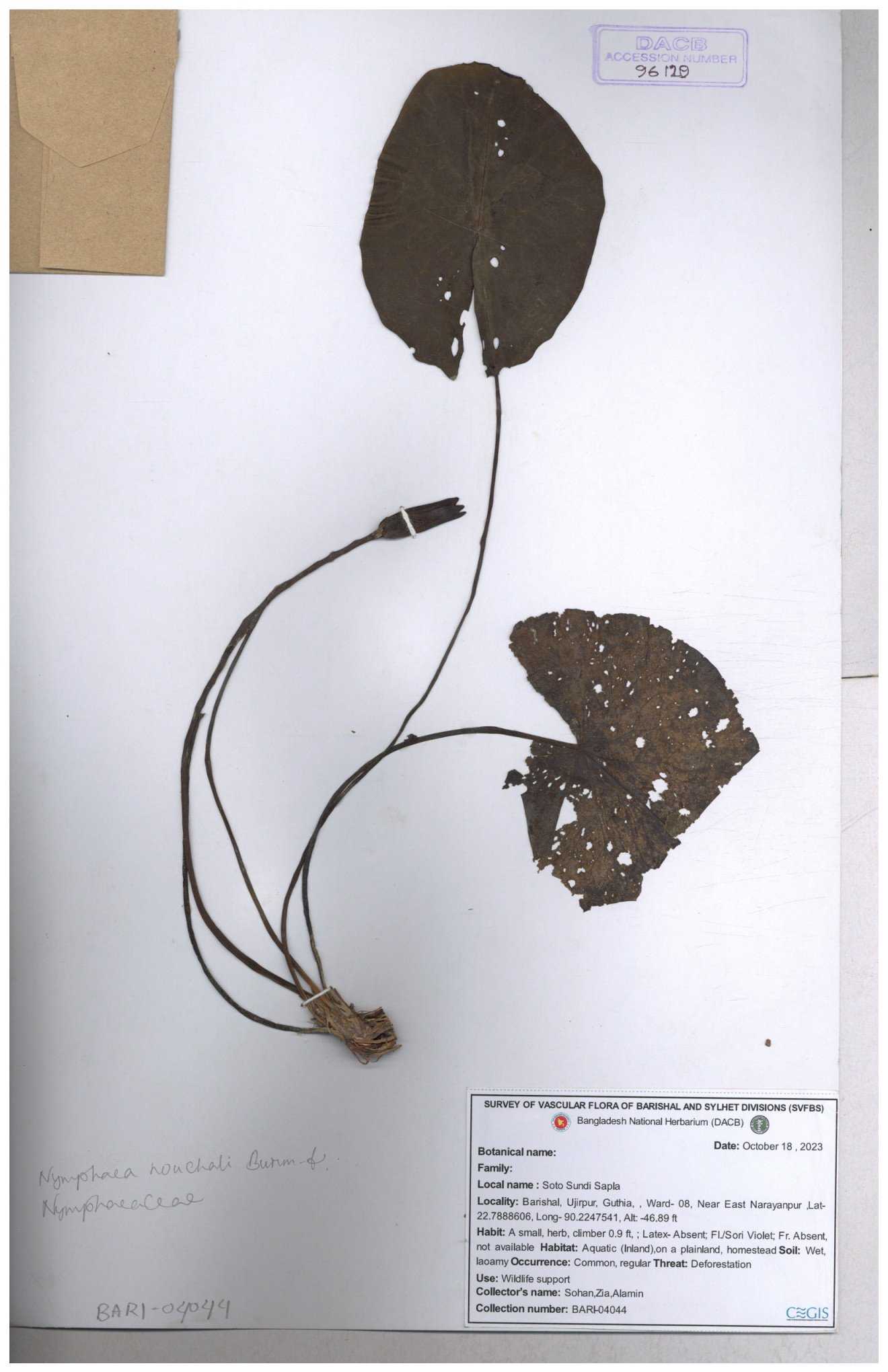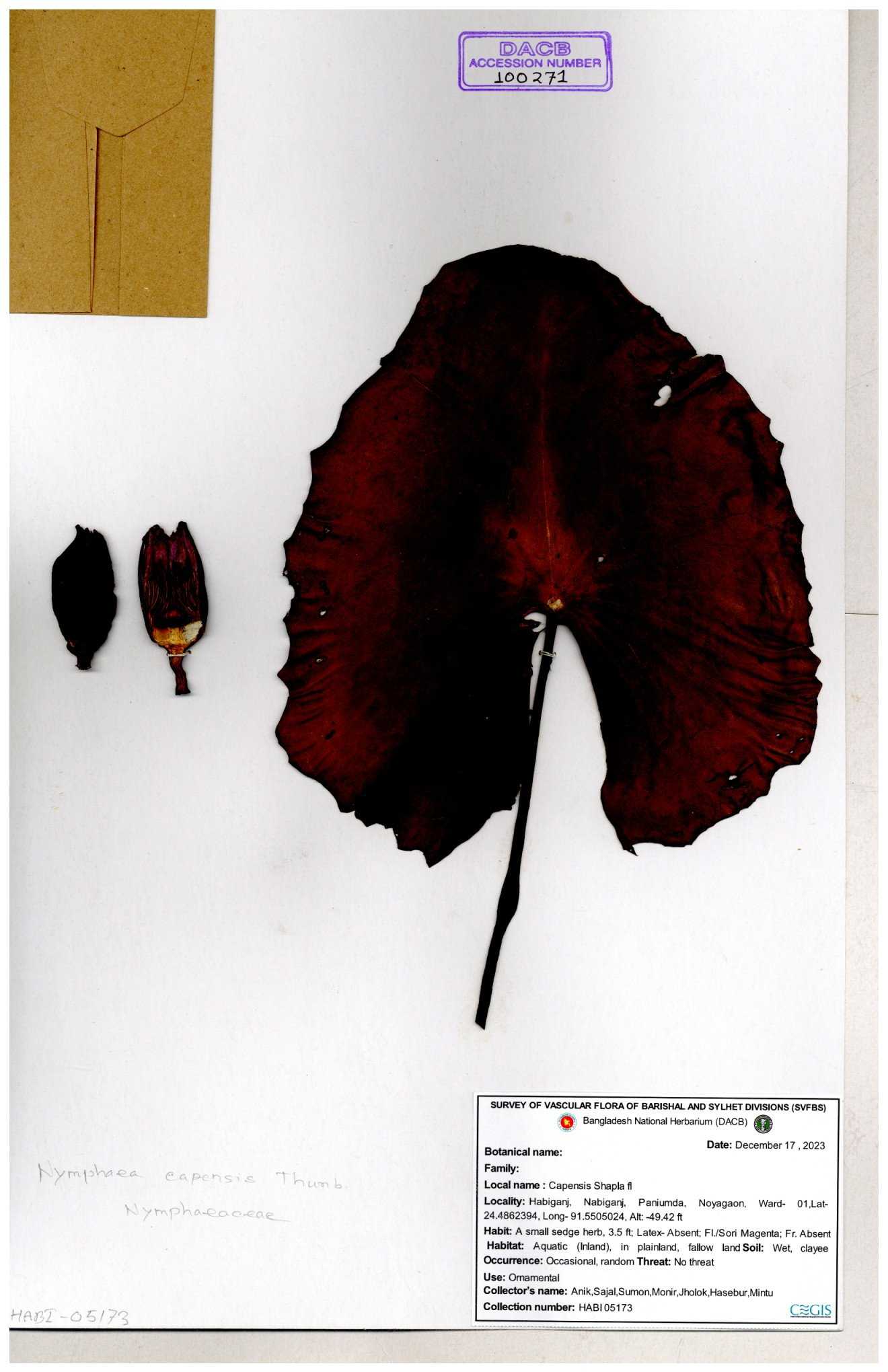 | 66416 | Nymphaeaceae | Nymphaea nouchali Burm.f. | Shapla | Joyanta Chardra Roy, Kamrul Islam & Suborno Chakma | JCR-2323 19-01-2022 |