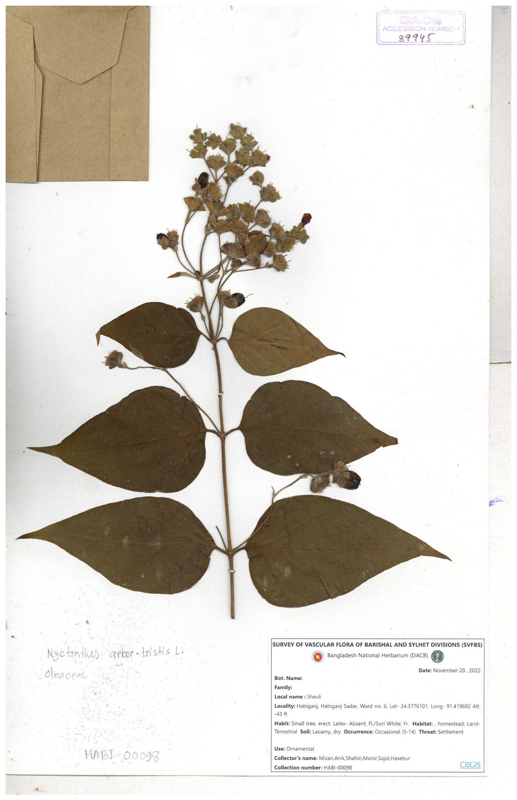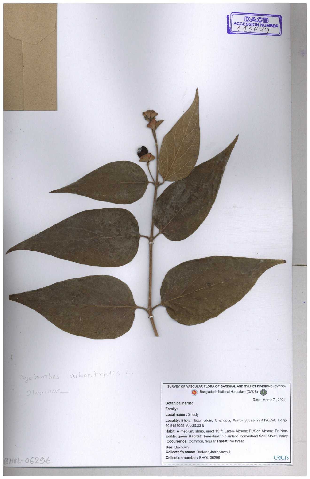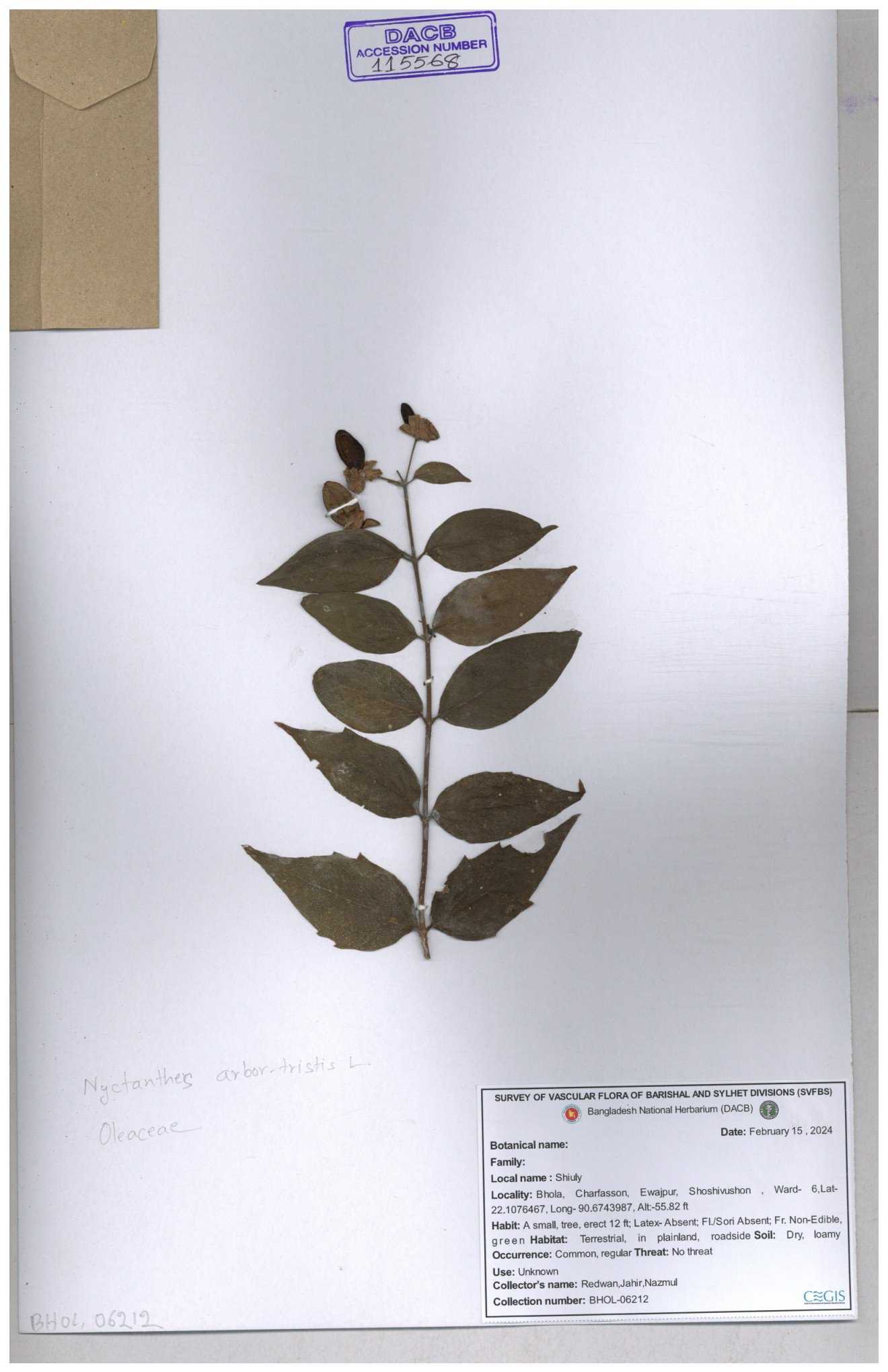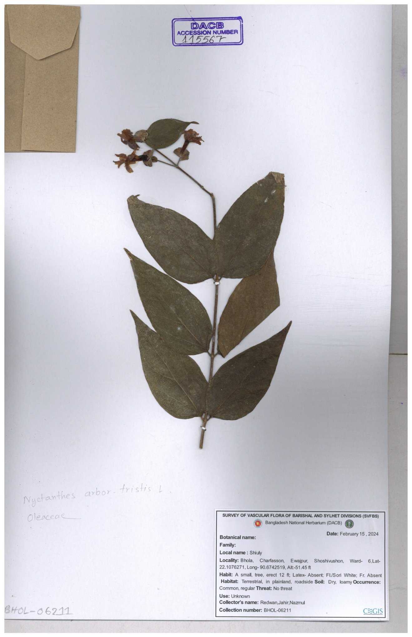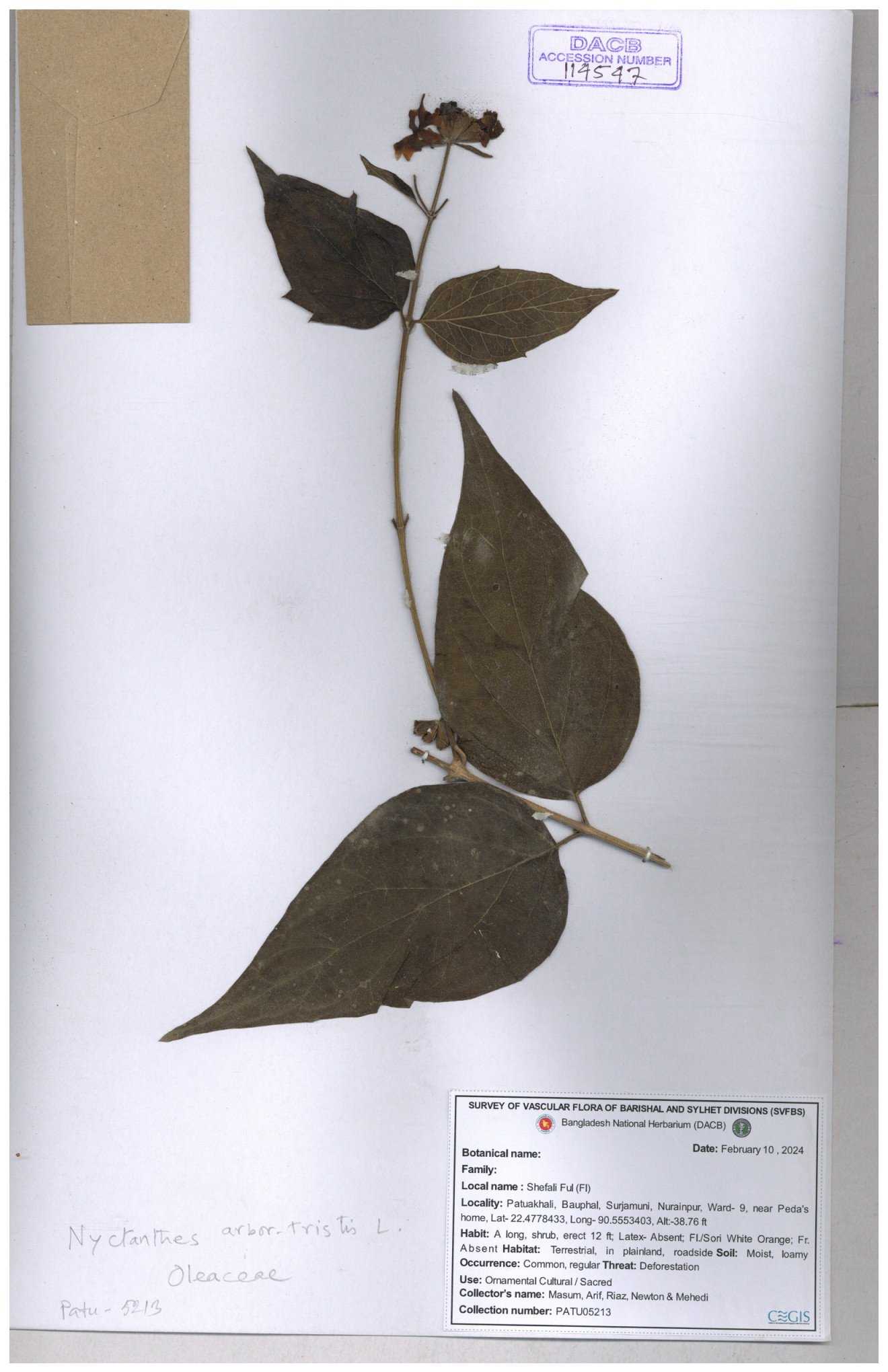 | 65793 | Oleaceae | Nyctanthes arbor-tristis (L.) | Unknown | Naimur Rahman | NR-1401 02-12-2020 |