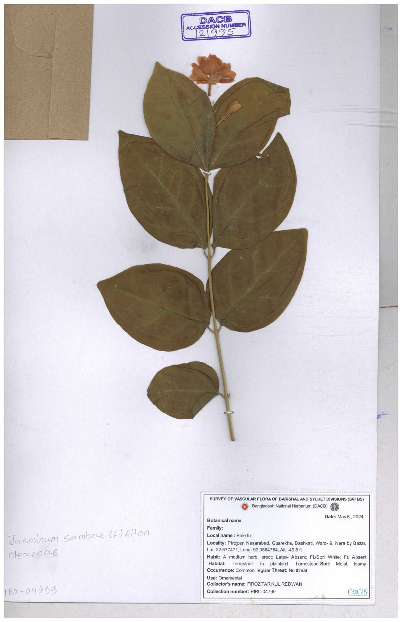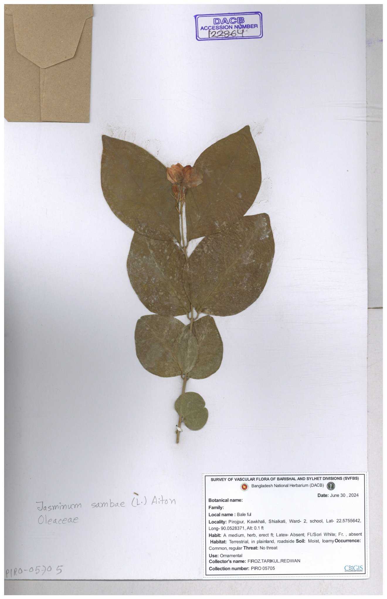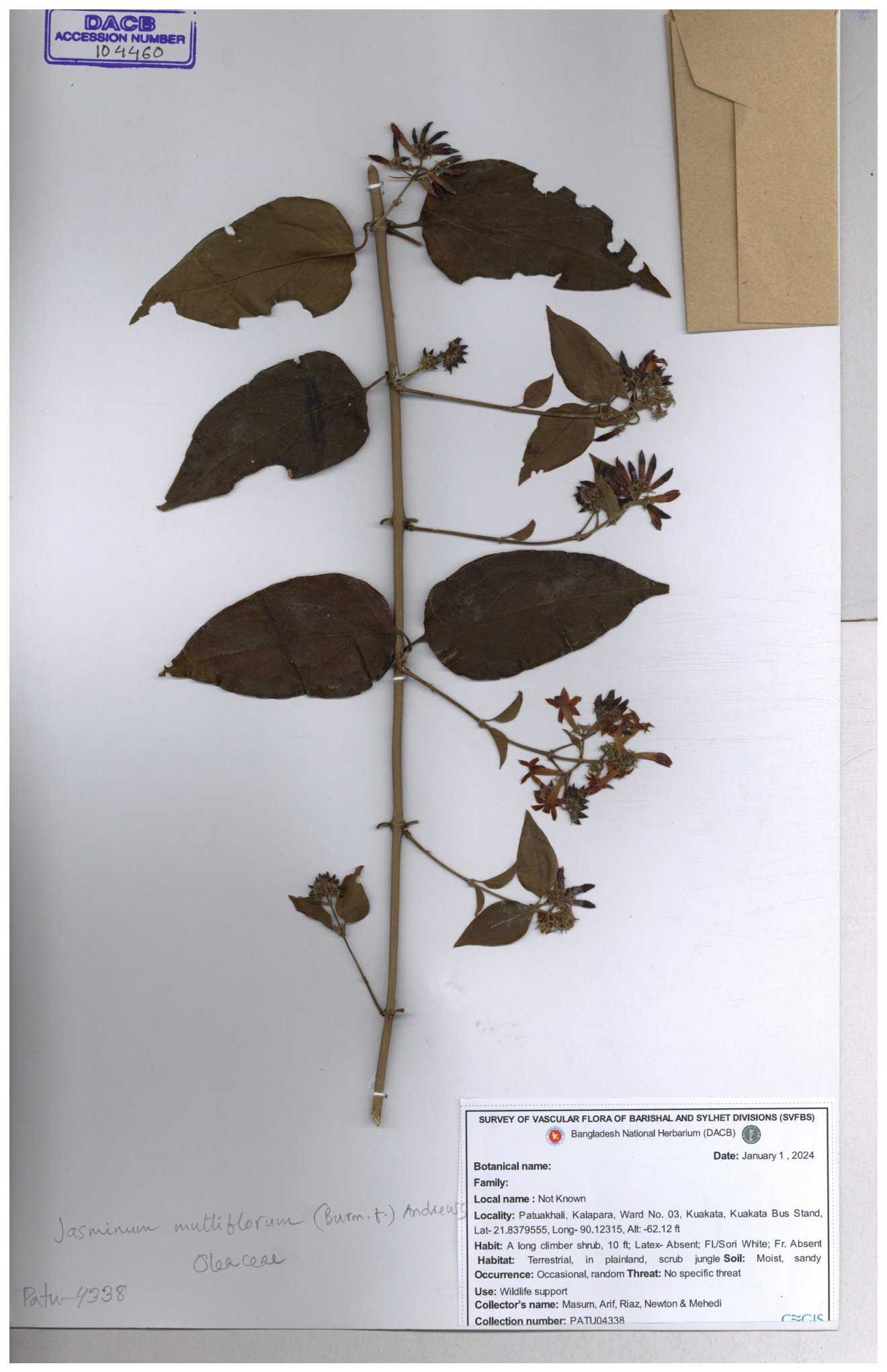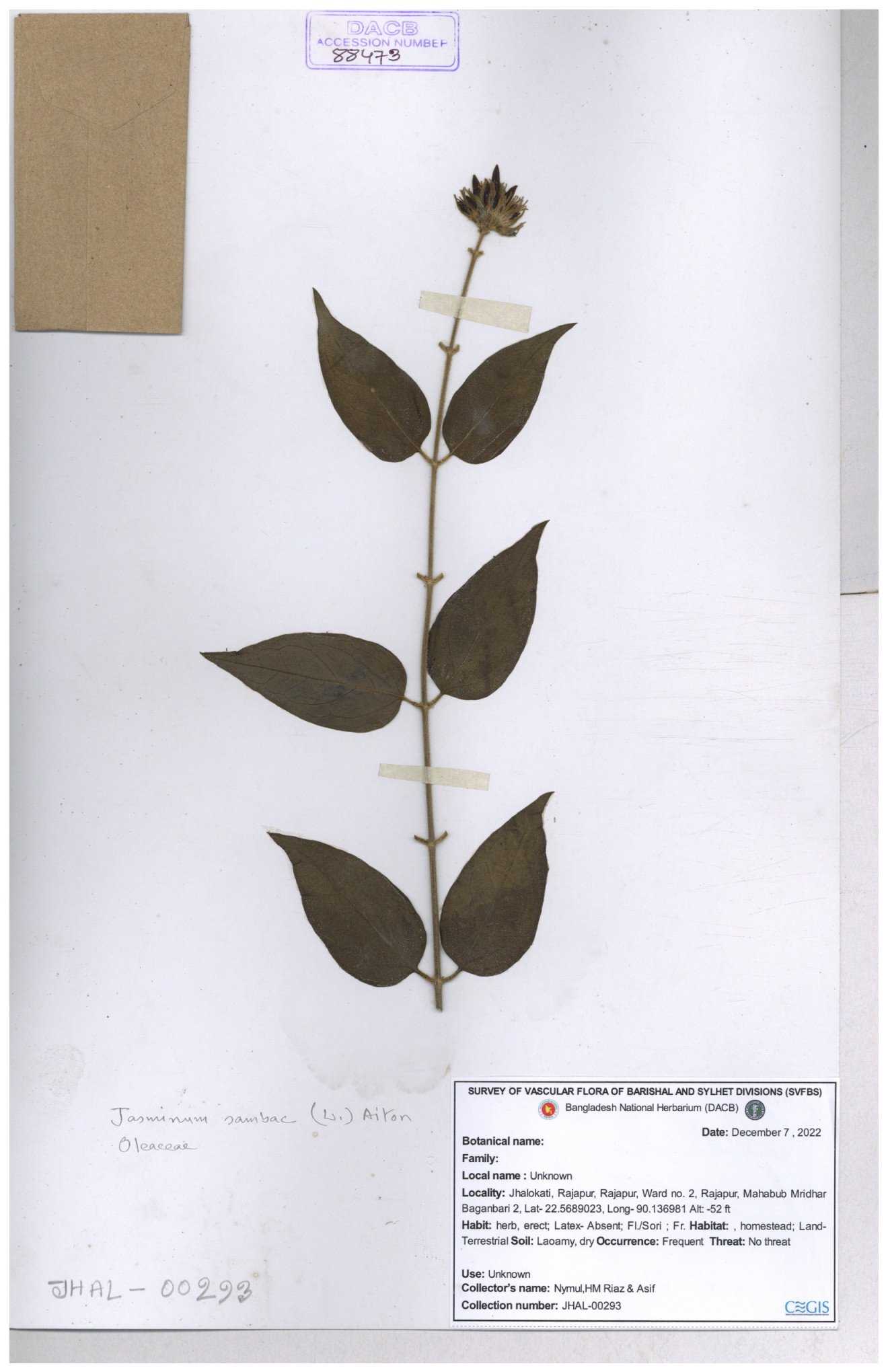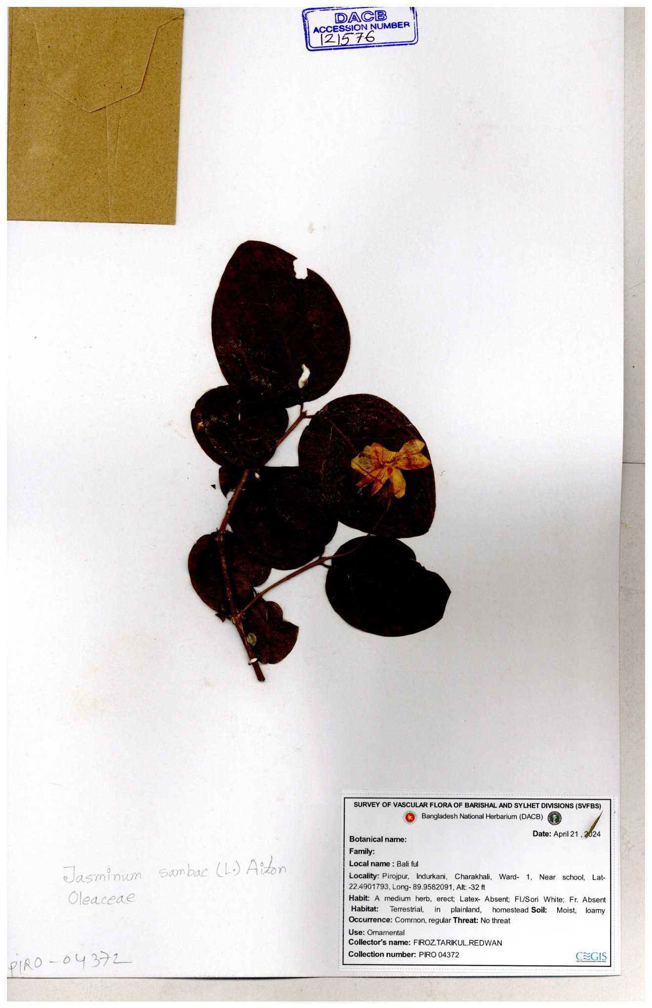 | 65793 | Oleaceae | Nyctanthes arbor-tristis (L.) | Unknown | Naimur Rahman | NR-1401 02-12-2020 |