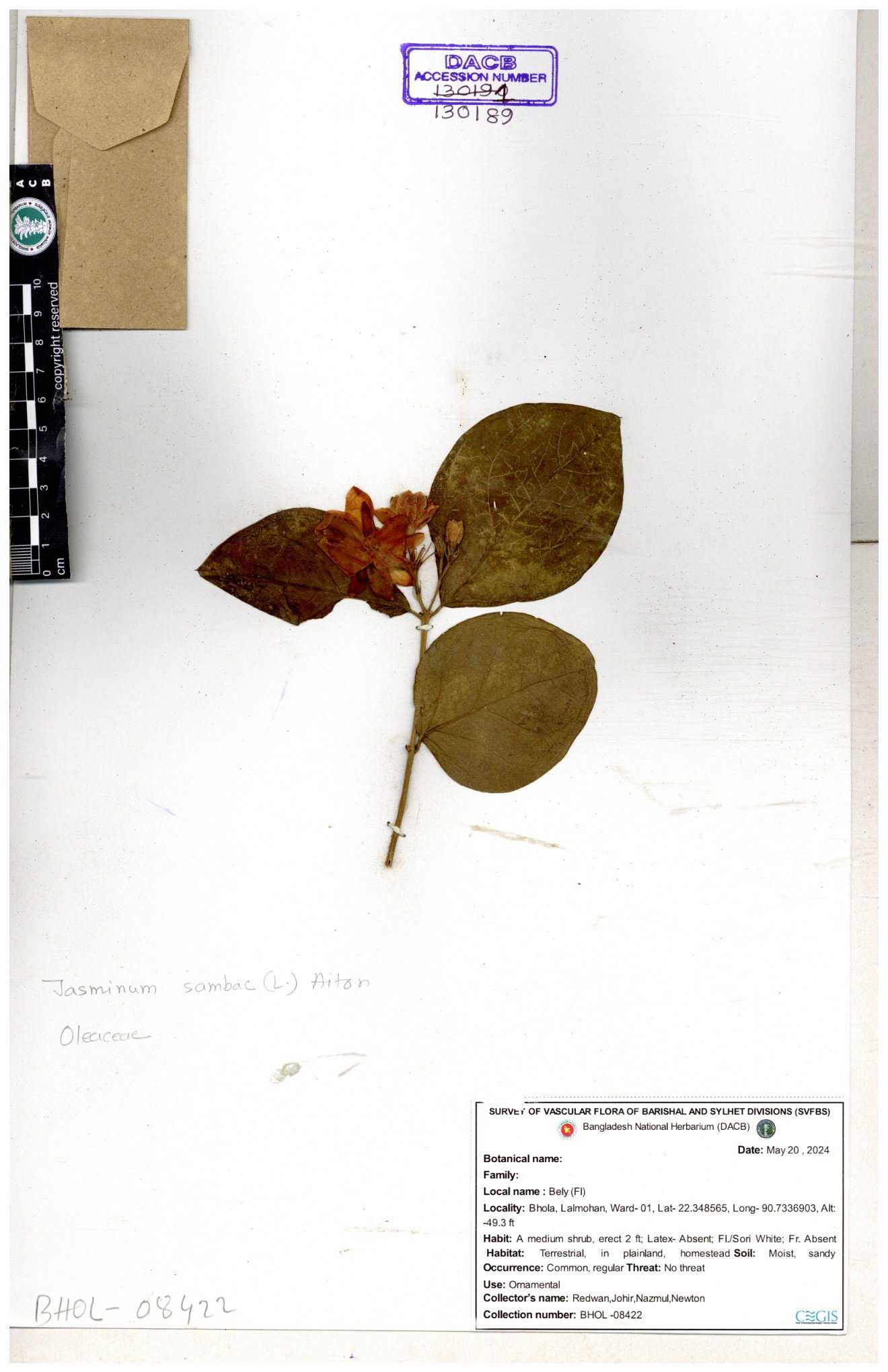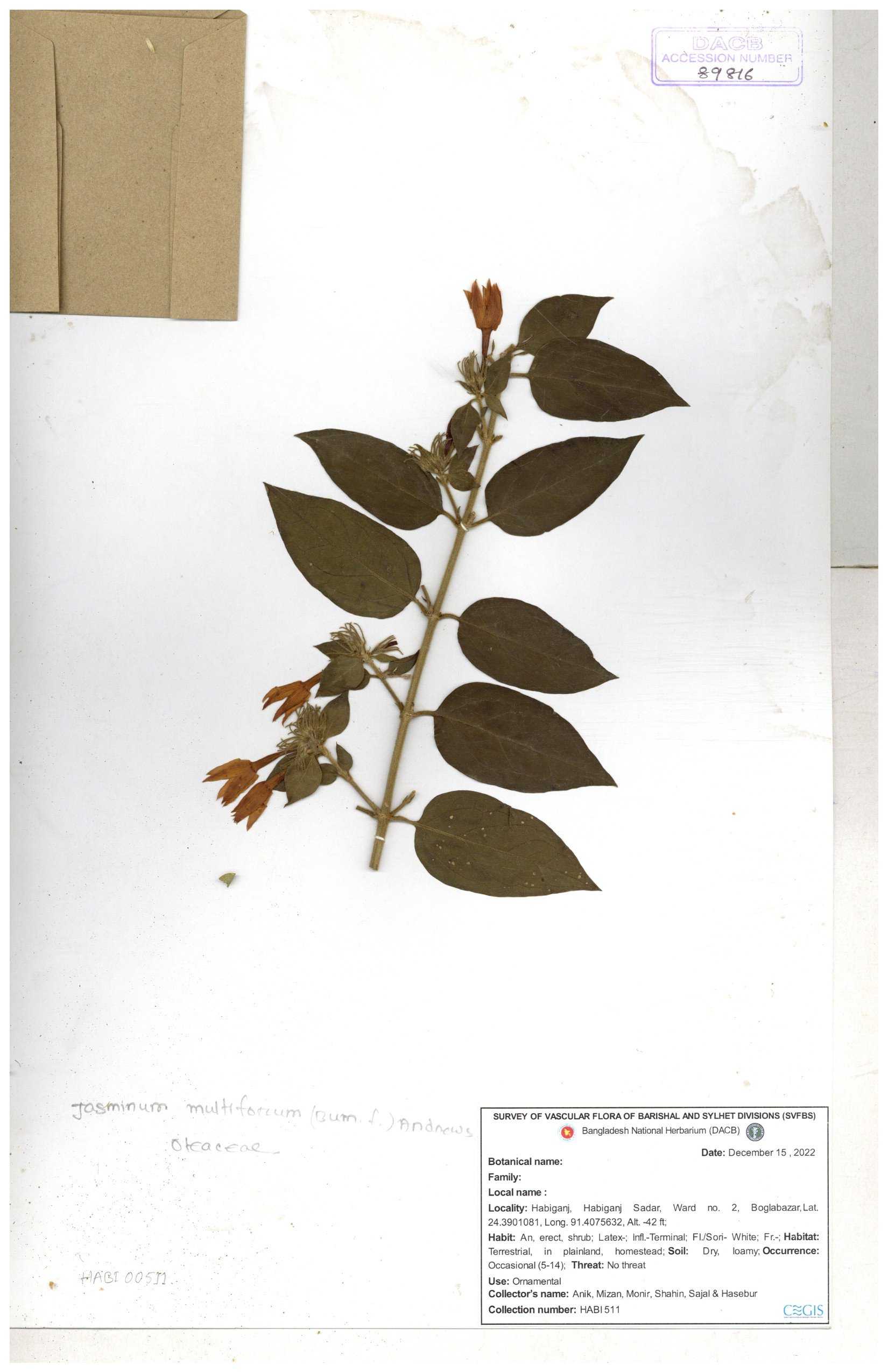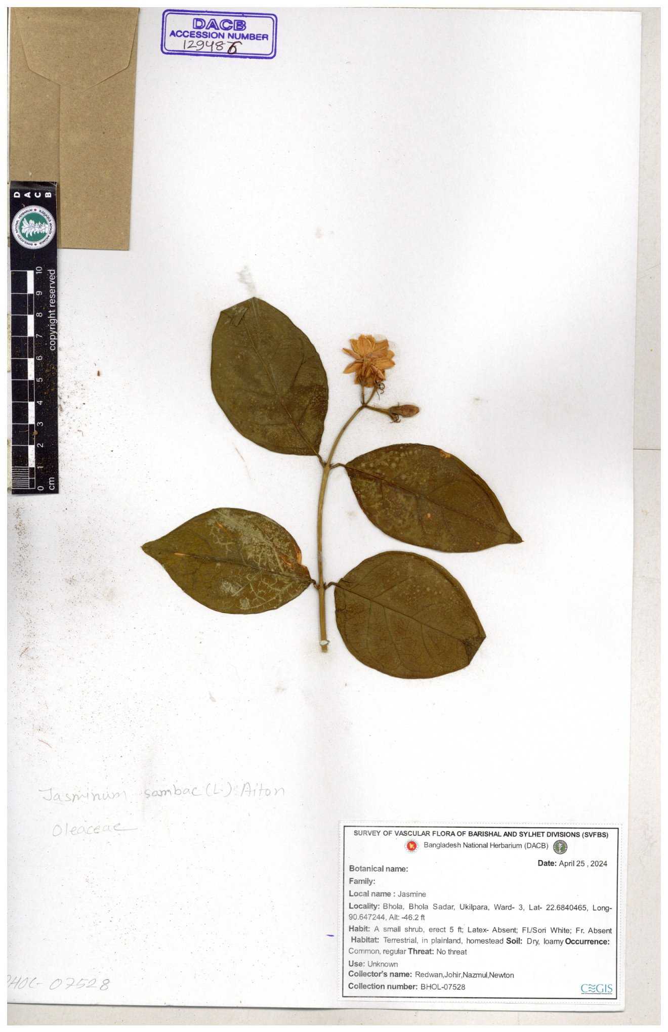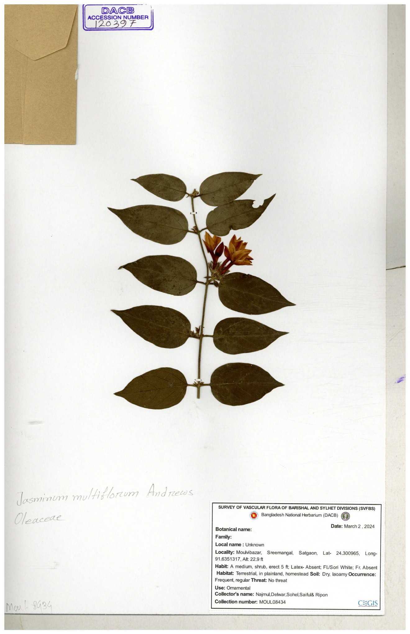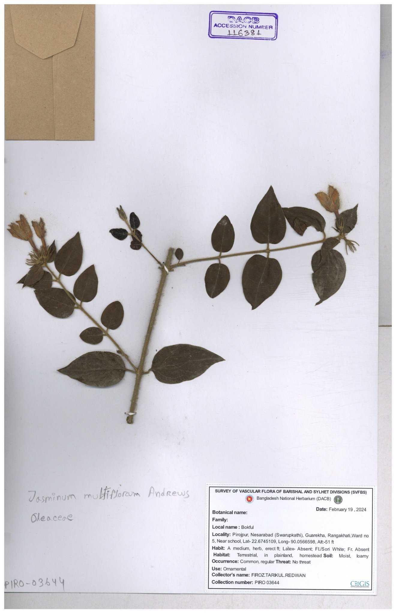 | 65793 | Oleaceae | Nyctanthes arbor-tristis (L.) | Unknown | Naimur Rahman | NR-1401 02-12-2020 |