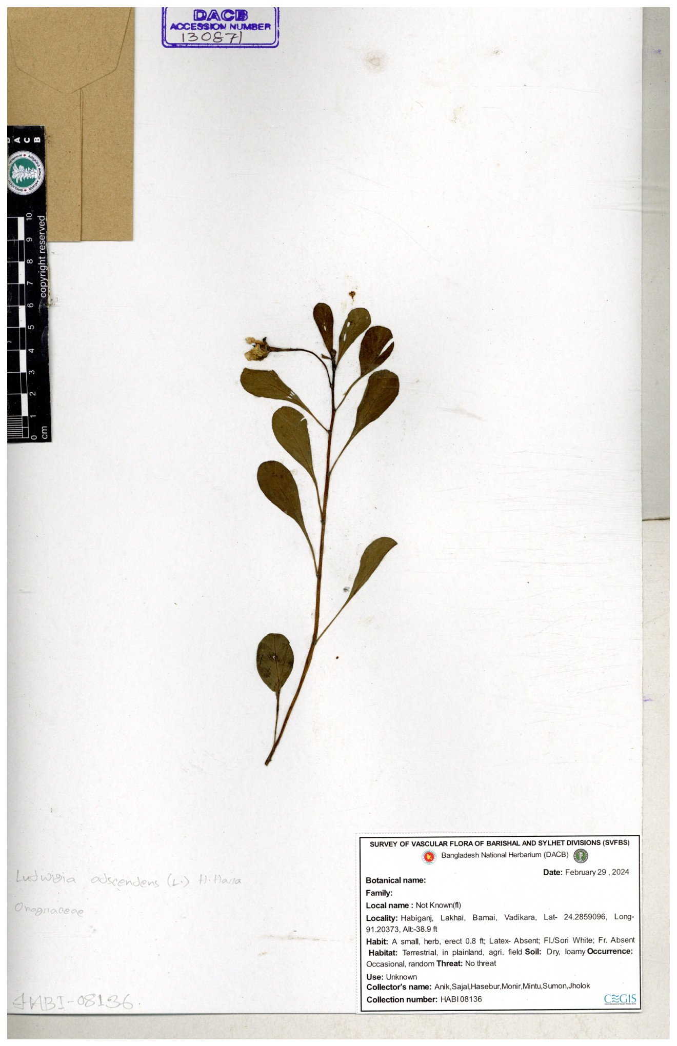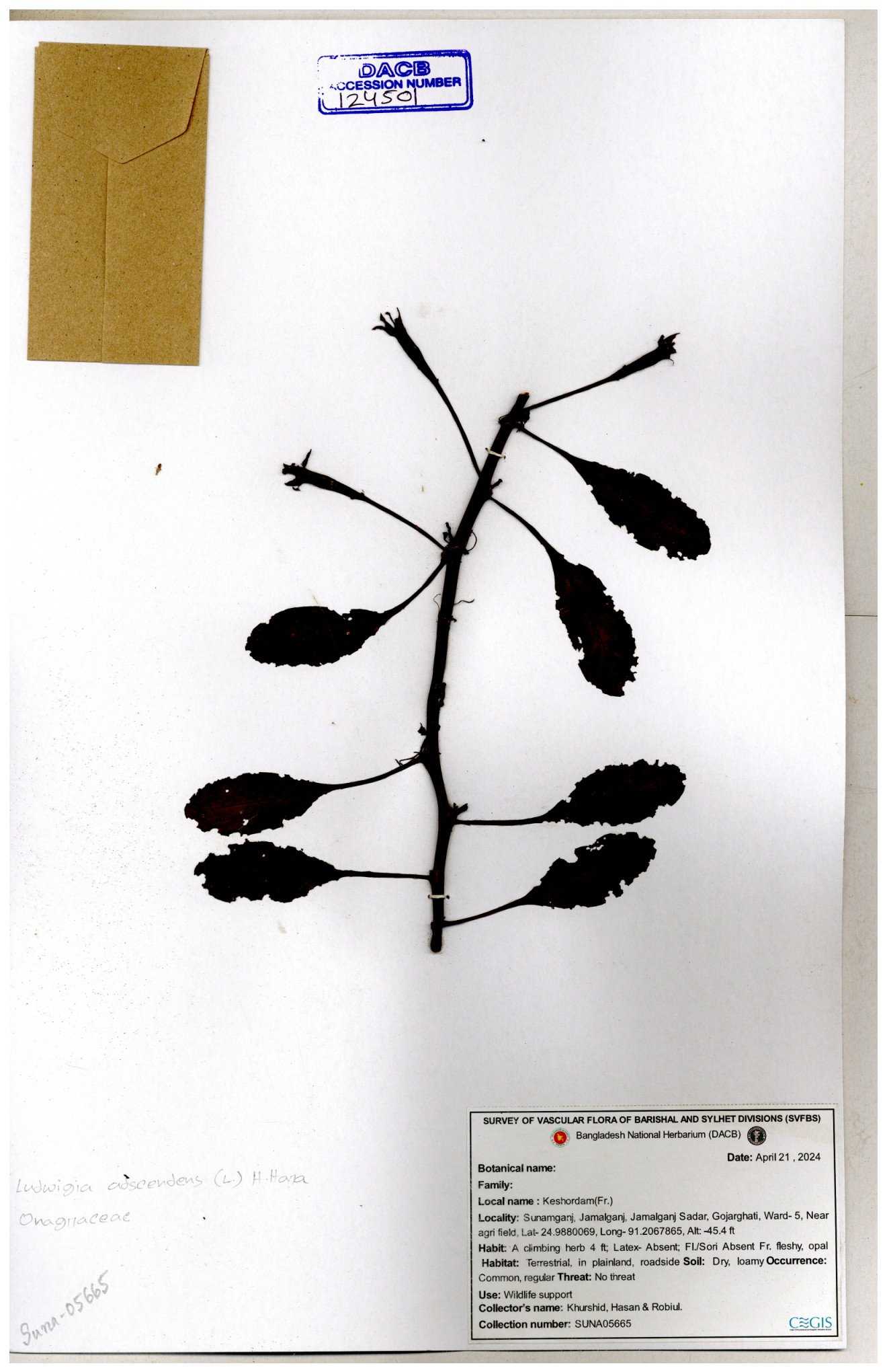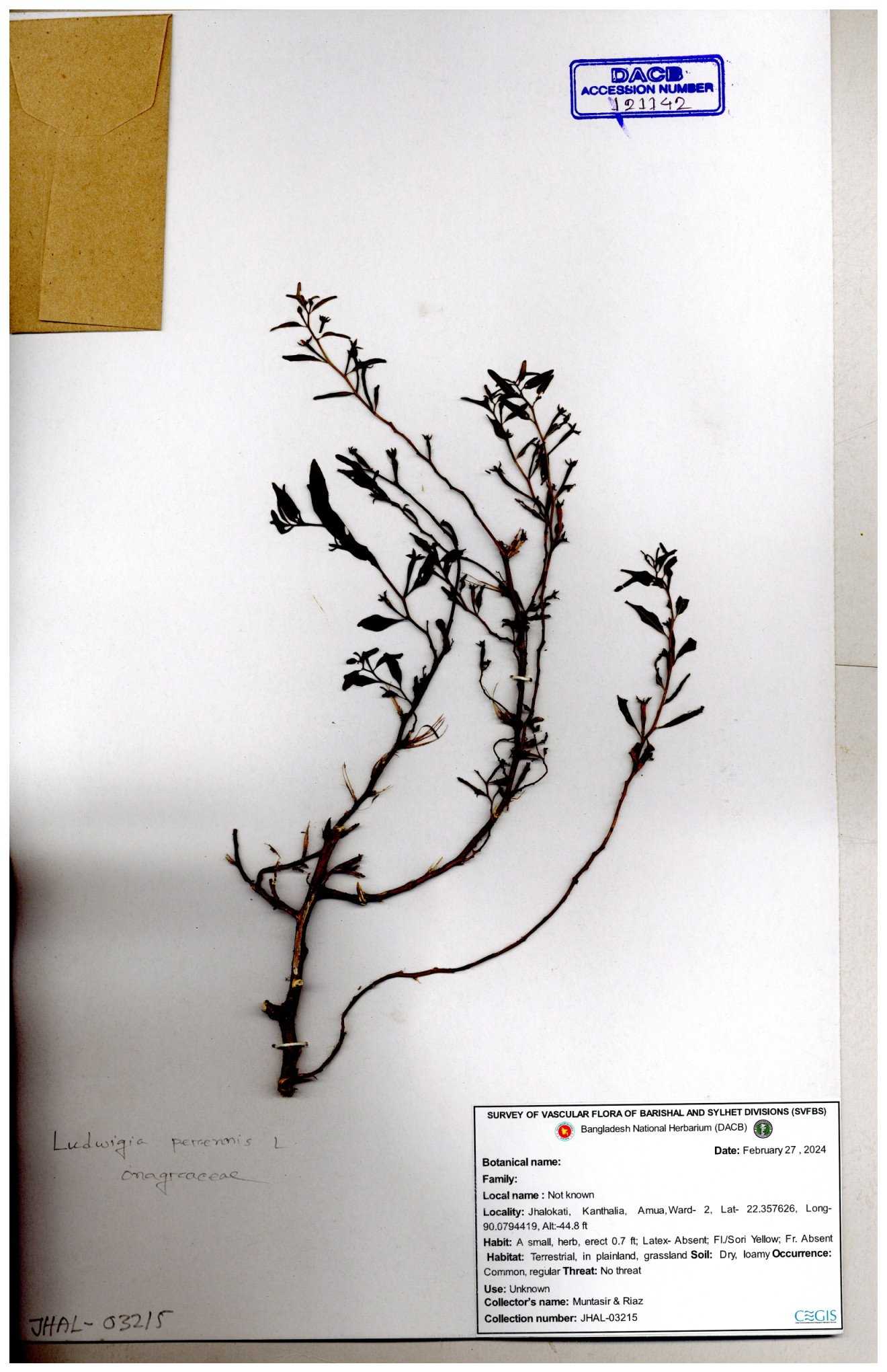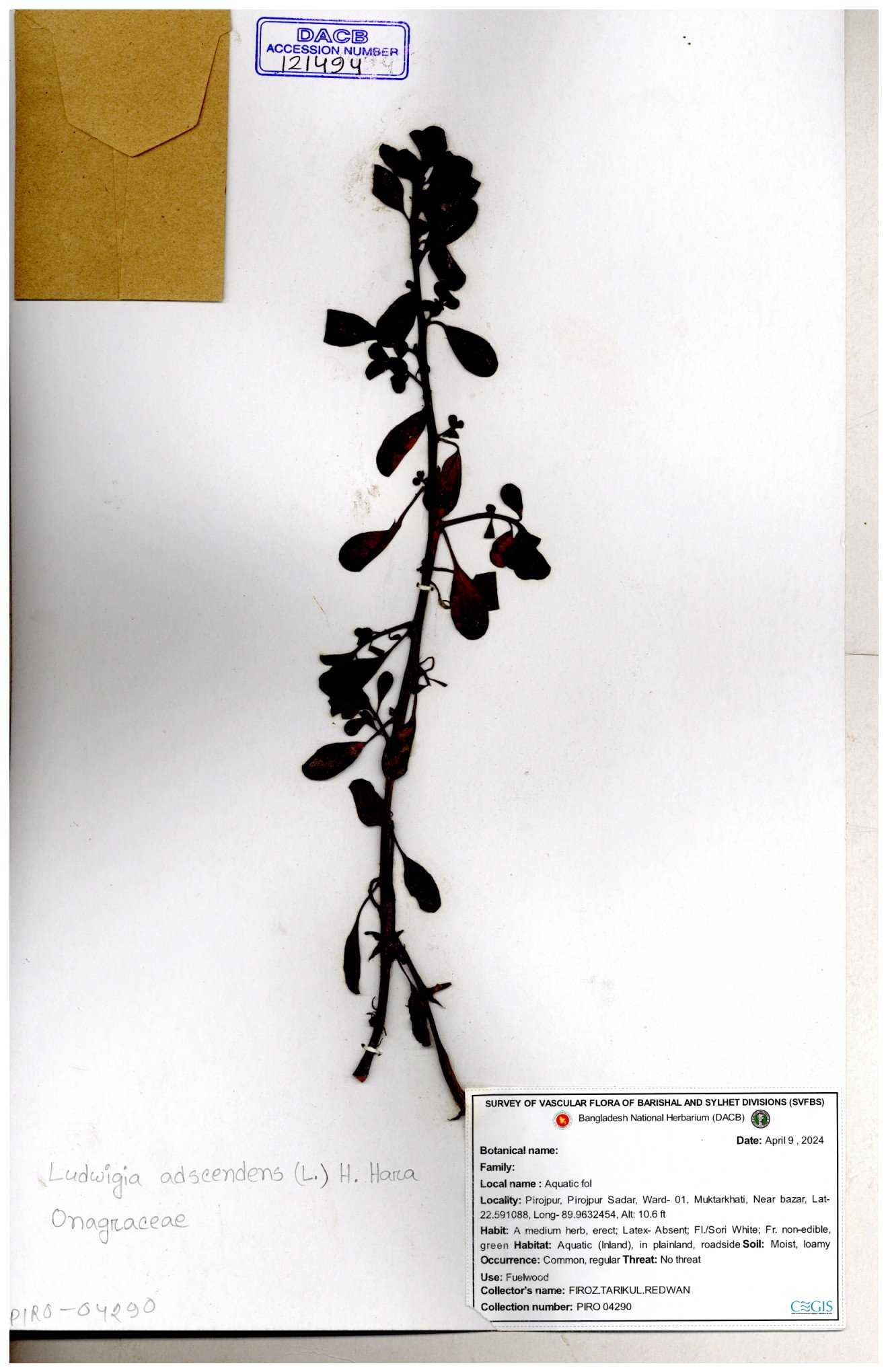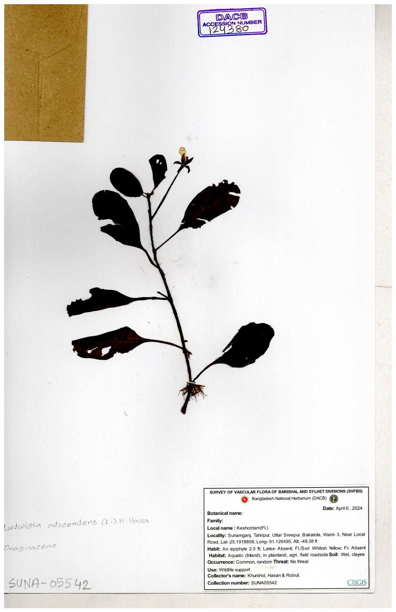 | 87348 | Onagraceae | Ludwigia prostrata | Bon lobonga | Md. Hedayet Ullah | HU- 0012 10-11-2022 |