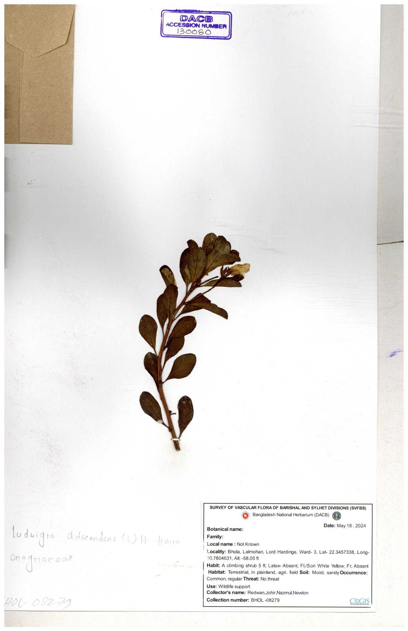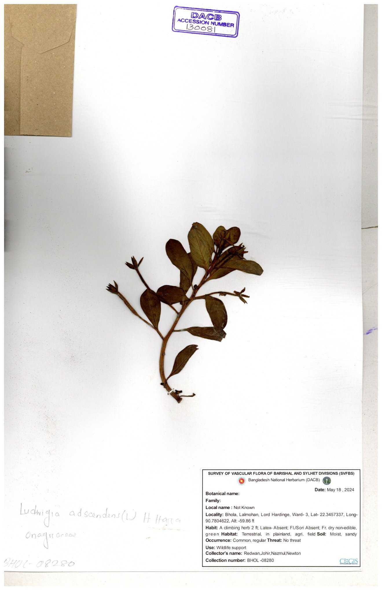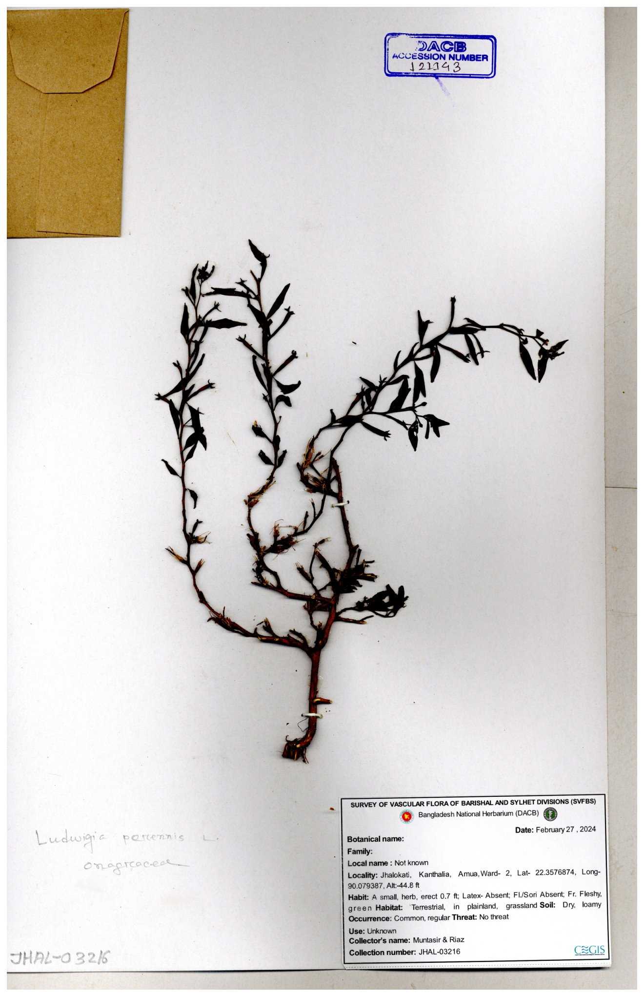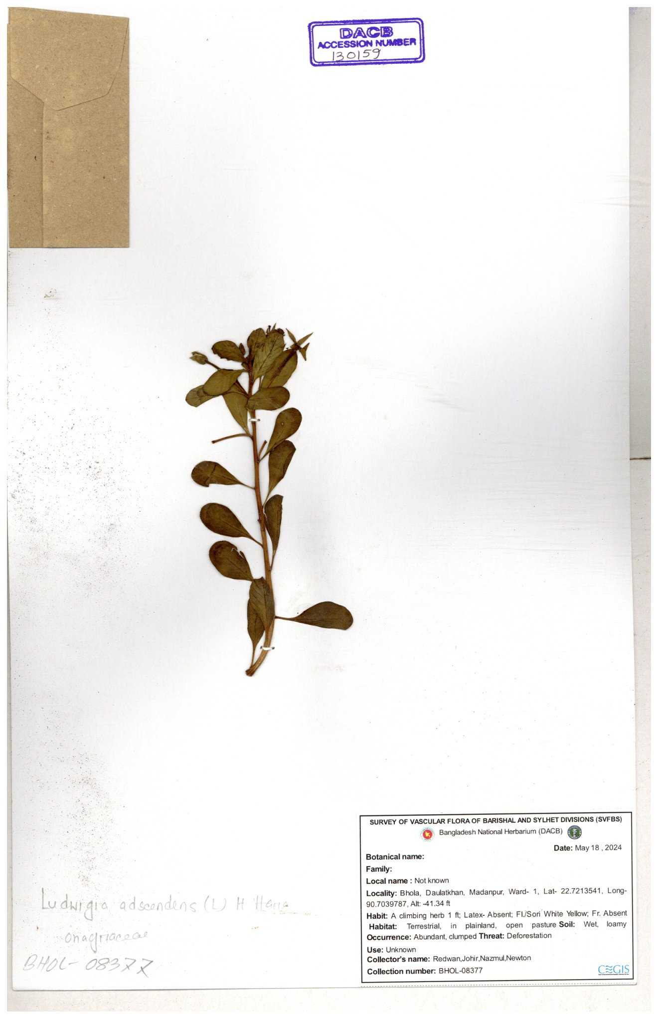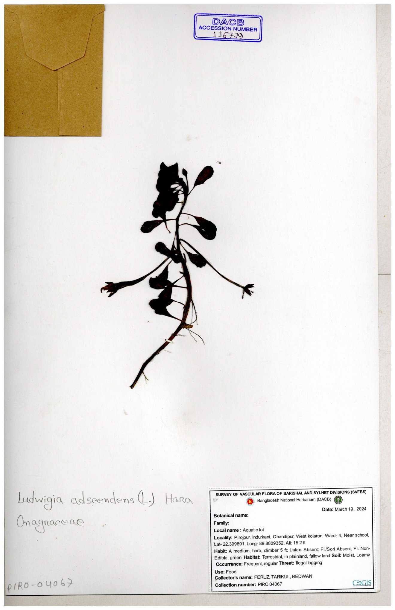 | 87348 | Onagraceae | Ludwigia prostrata | Bon lobonga | Md. Hedayet Ullah | HU- 0012 10-11-2022 |