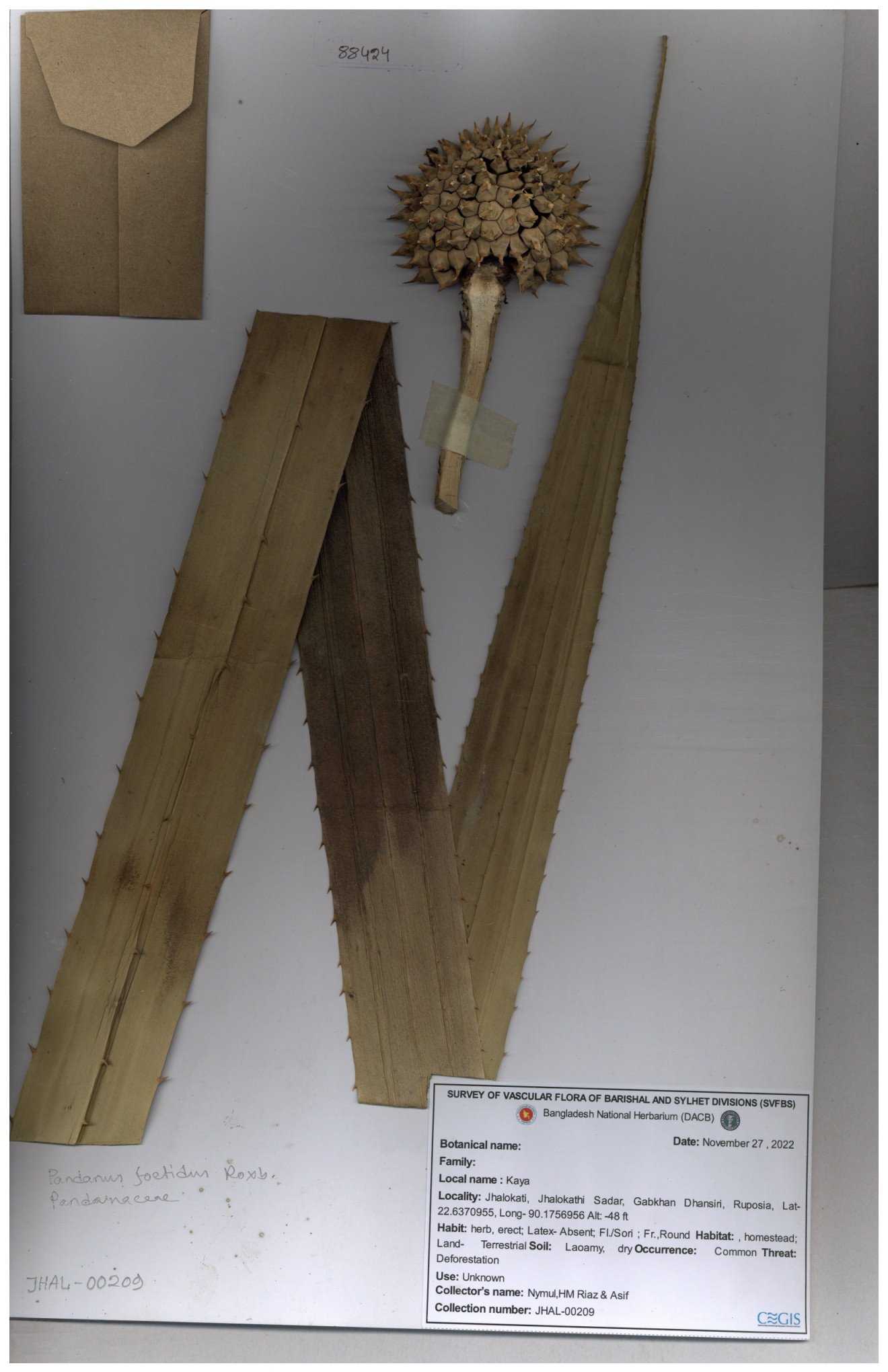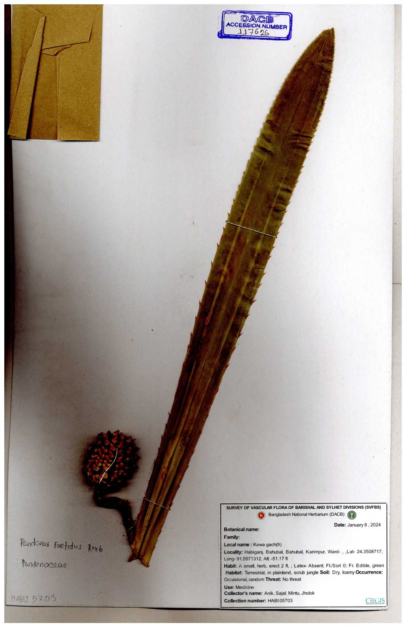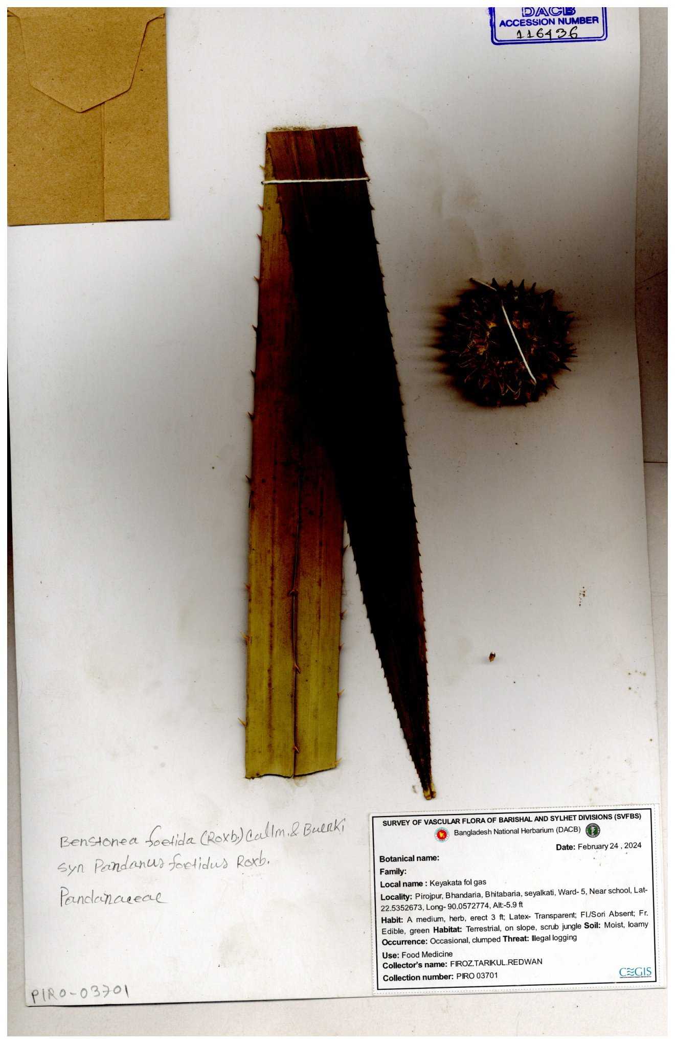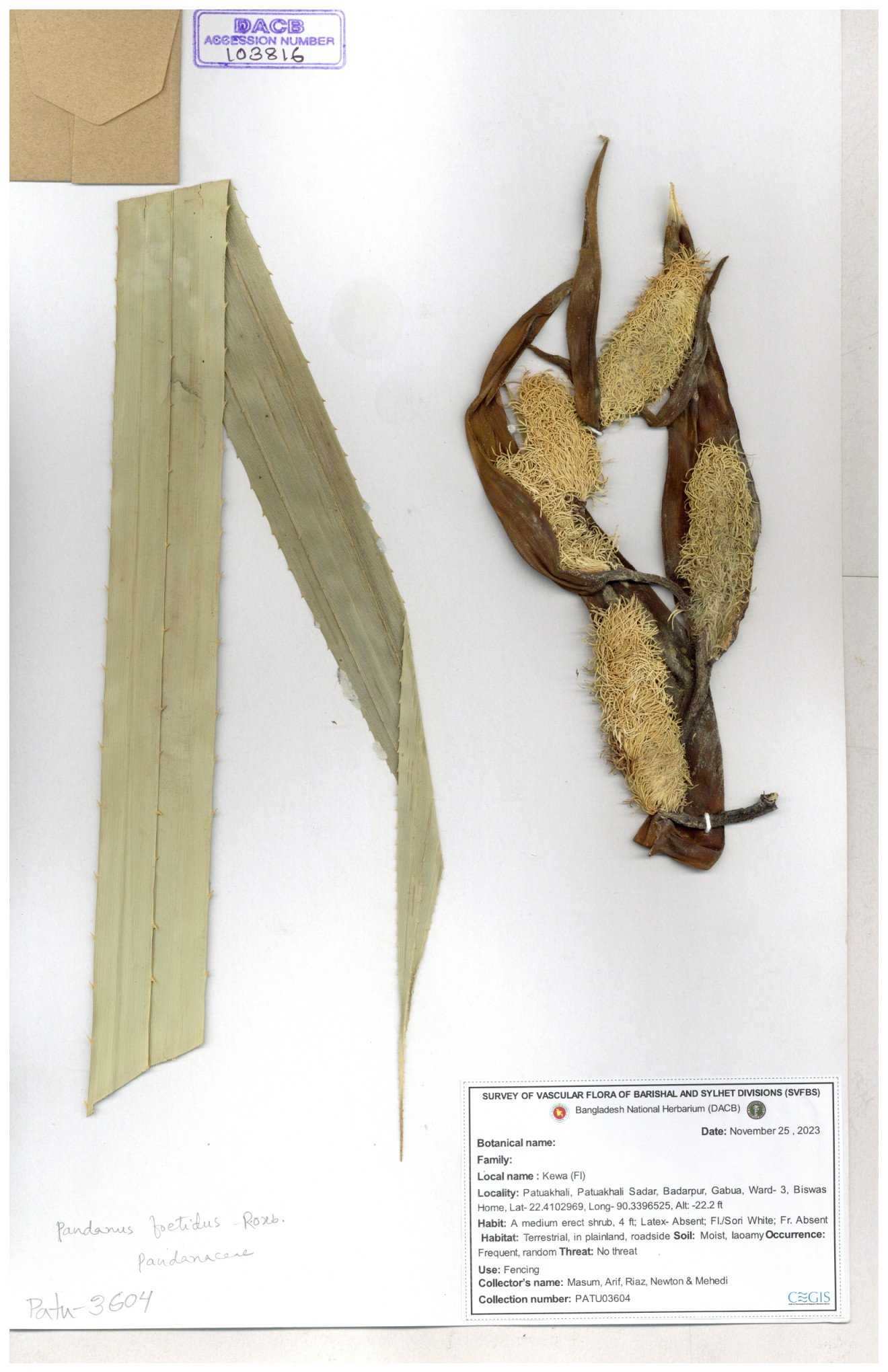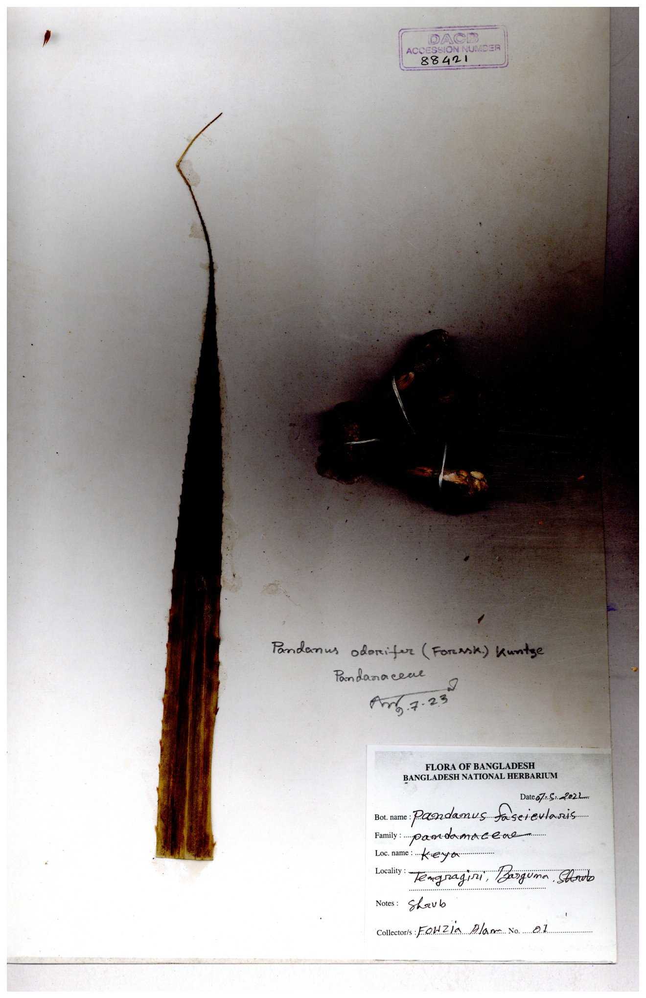 | 88186 | Pandanaceae | Pandanus foetidus Roxb. | Kuakata | Dr. M. Sultana | DMS-3613 23-03-2021 |