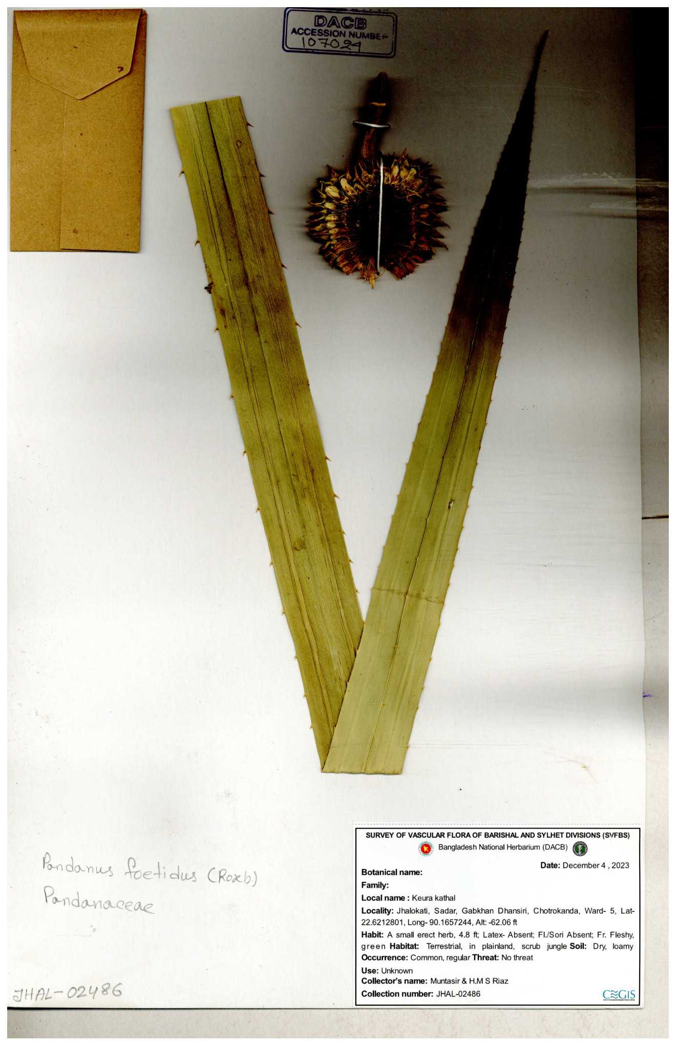 | 60063 | Pandanaceae | Pandanus foetidus Roxb. | Dr. M. Sultana | DMS-2991 14-10-2019 |