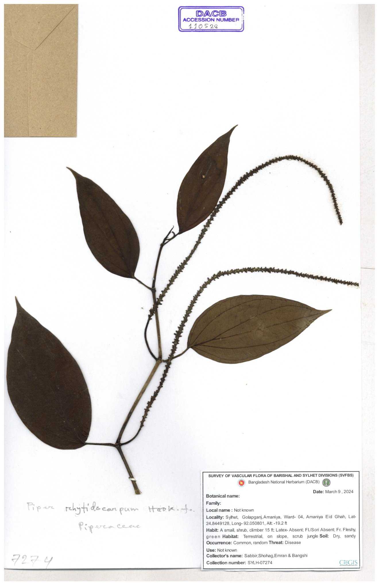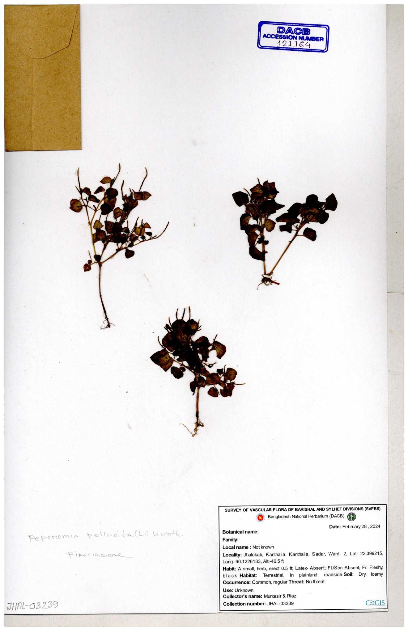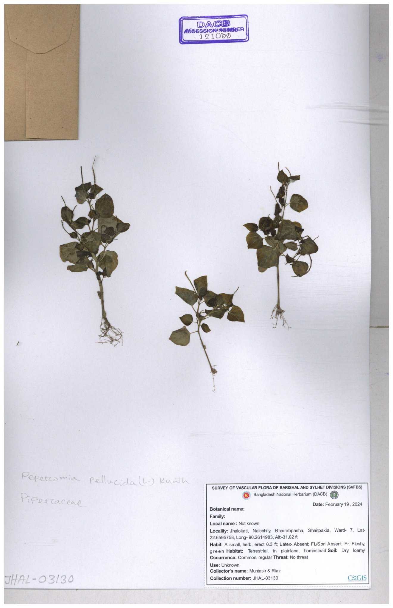 | 65901 | Piperaceae | Piper longum L. | Unknown | Naimur Rahman | NR-1338 02-12-2020 |
