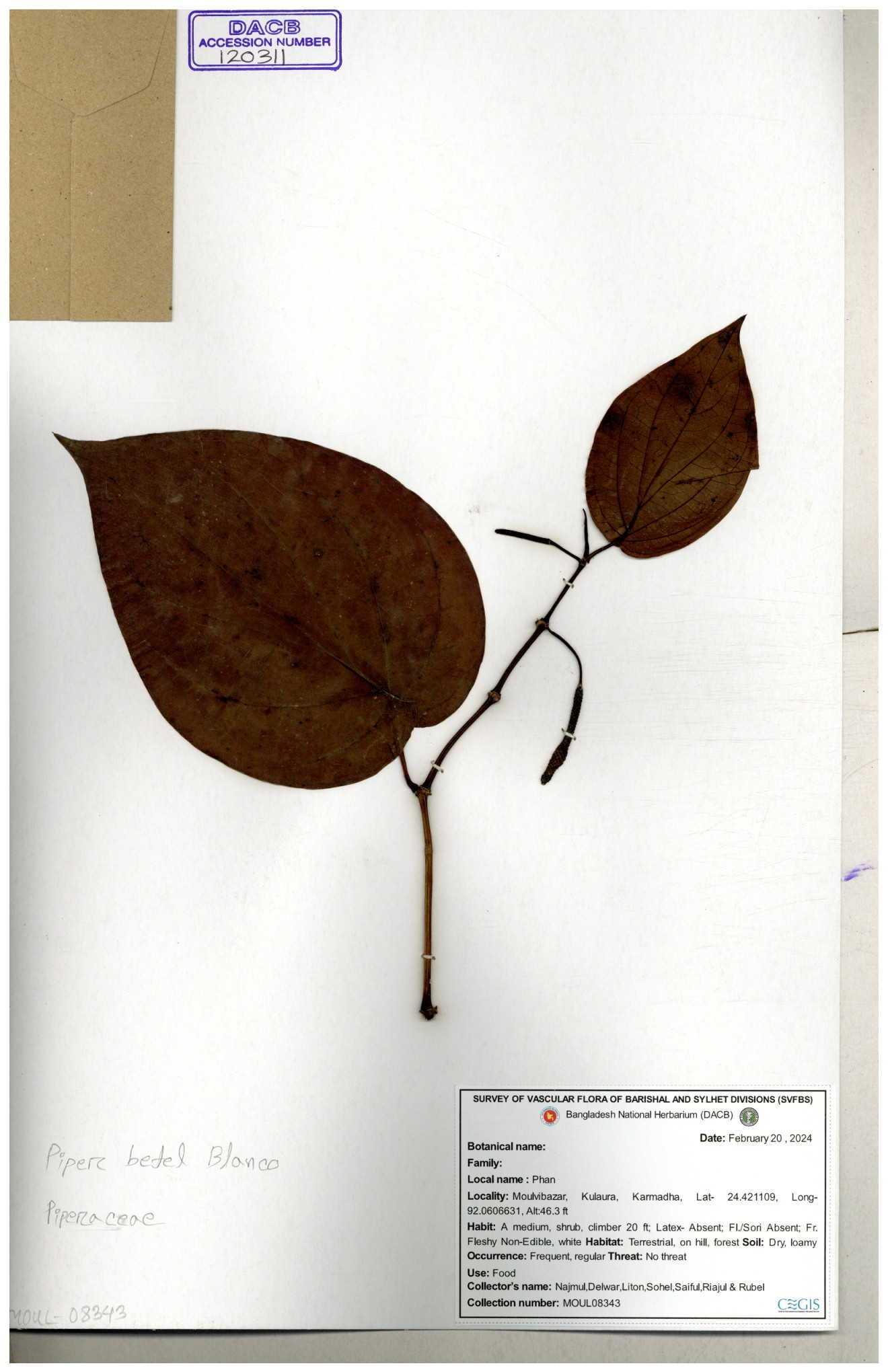 | 120311 | Piperaceae | Piper betel | 30-11--0001 |
