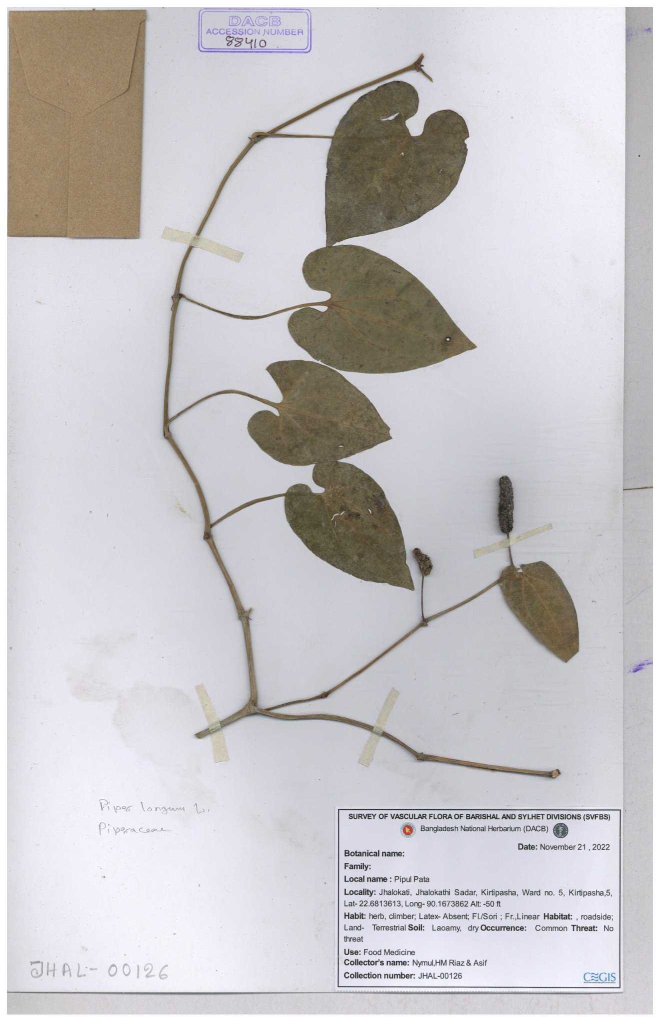 | 84997 | Piperaceae | Piper longum L. | Joyanta, Mominur & Kamrul | JCR-6985 20-11-2017 |