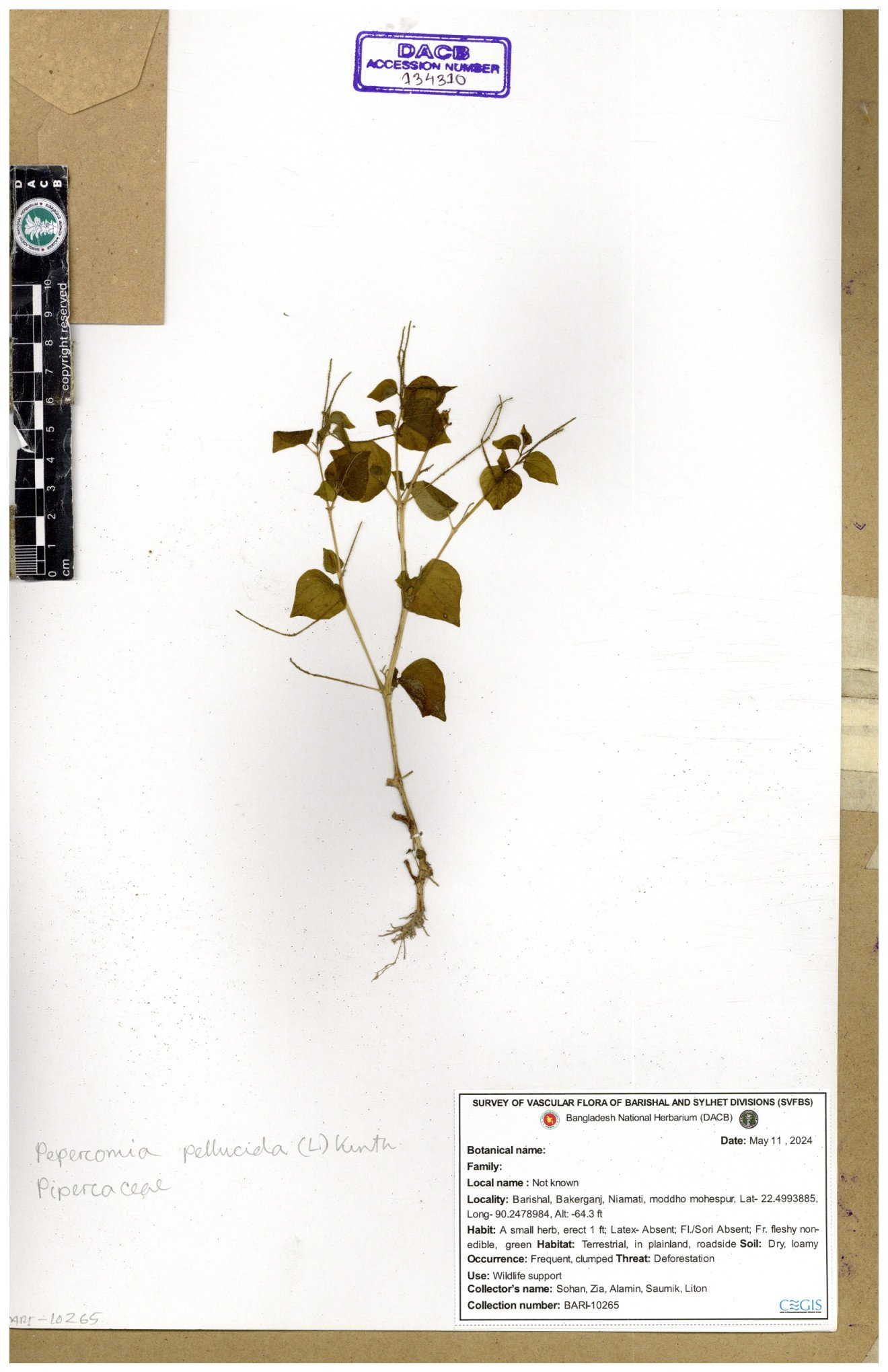 | 65895 | Piperaceae | Peperomia pellucida (L.) Kunth | Unknown | Naimur Rahman | NR-1320 02-12-2020 |