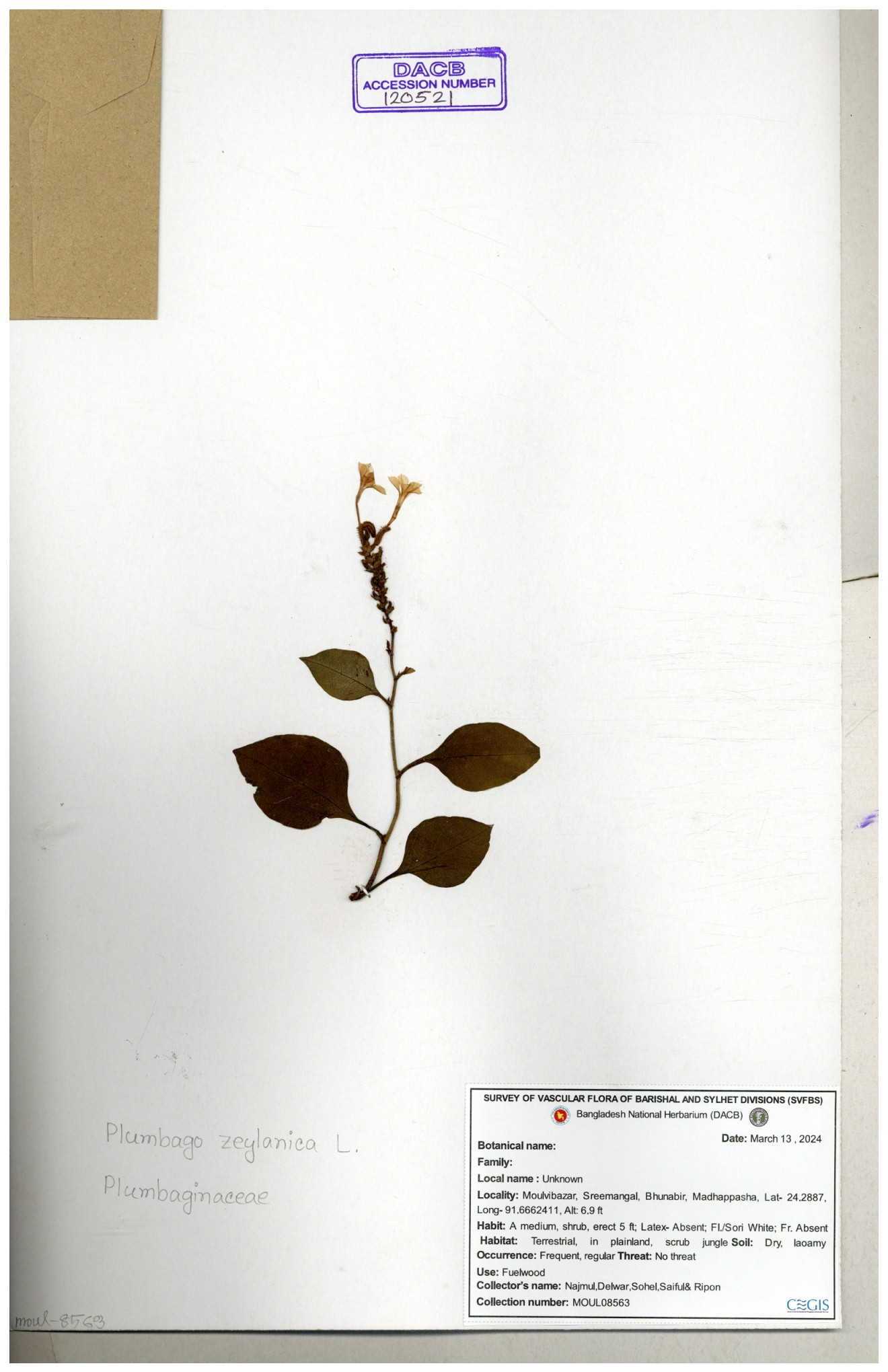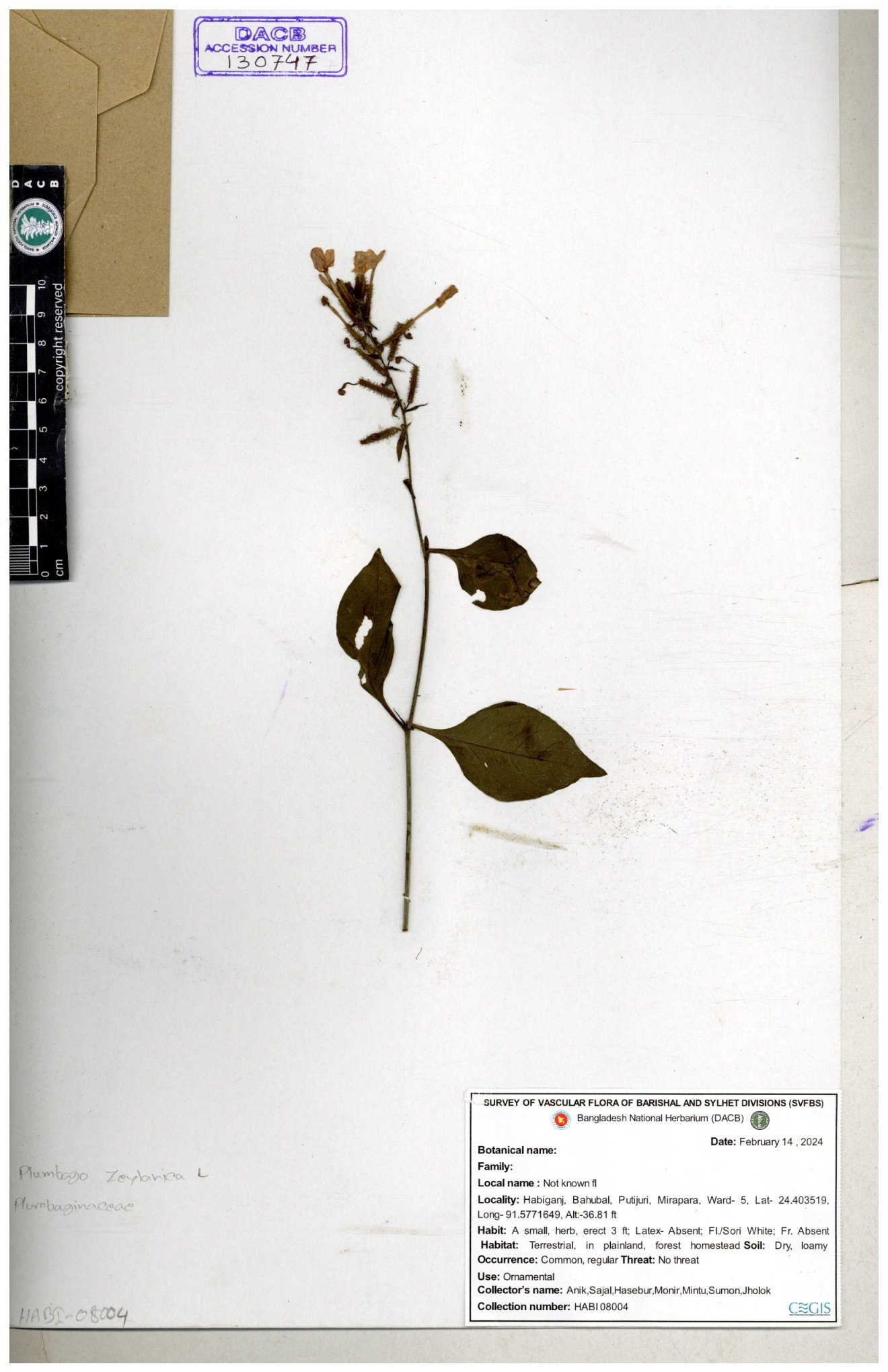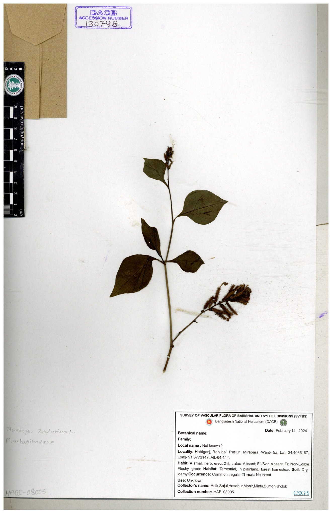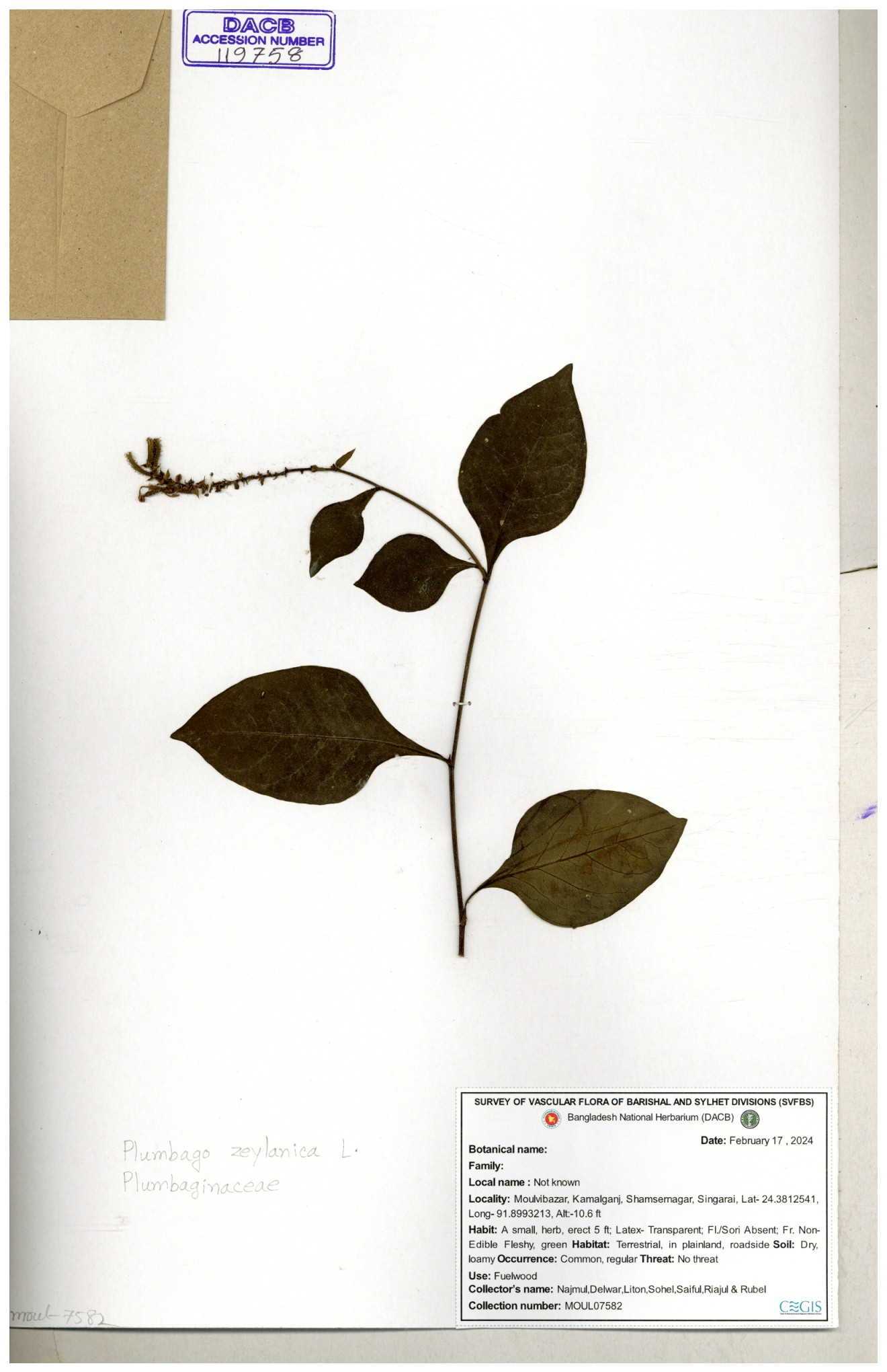 | 66591 | Plumbaginaceae | Plumbago zeylanica L. | Mahbuba Akter | 001 05-11-2019 |