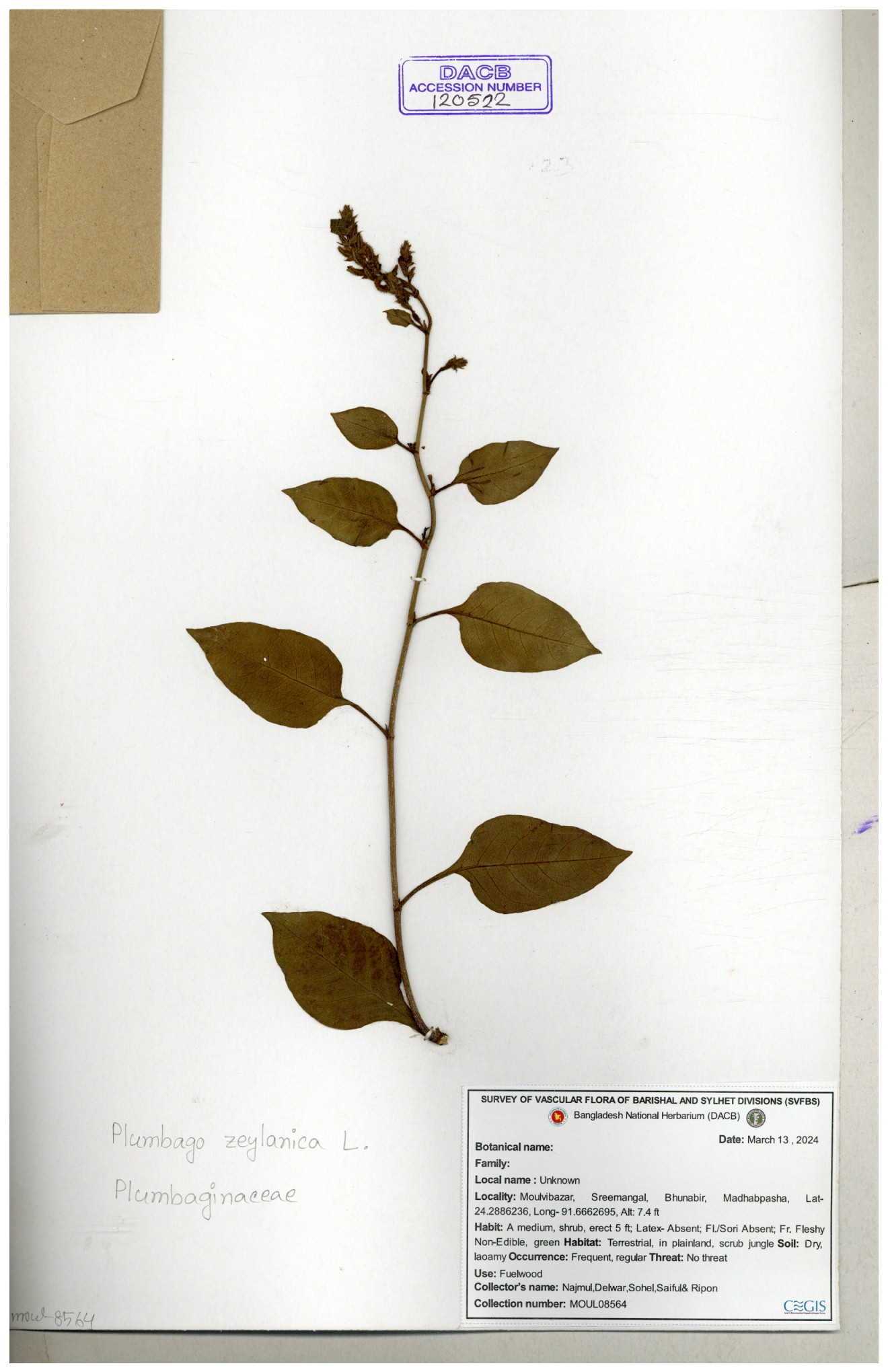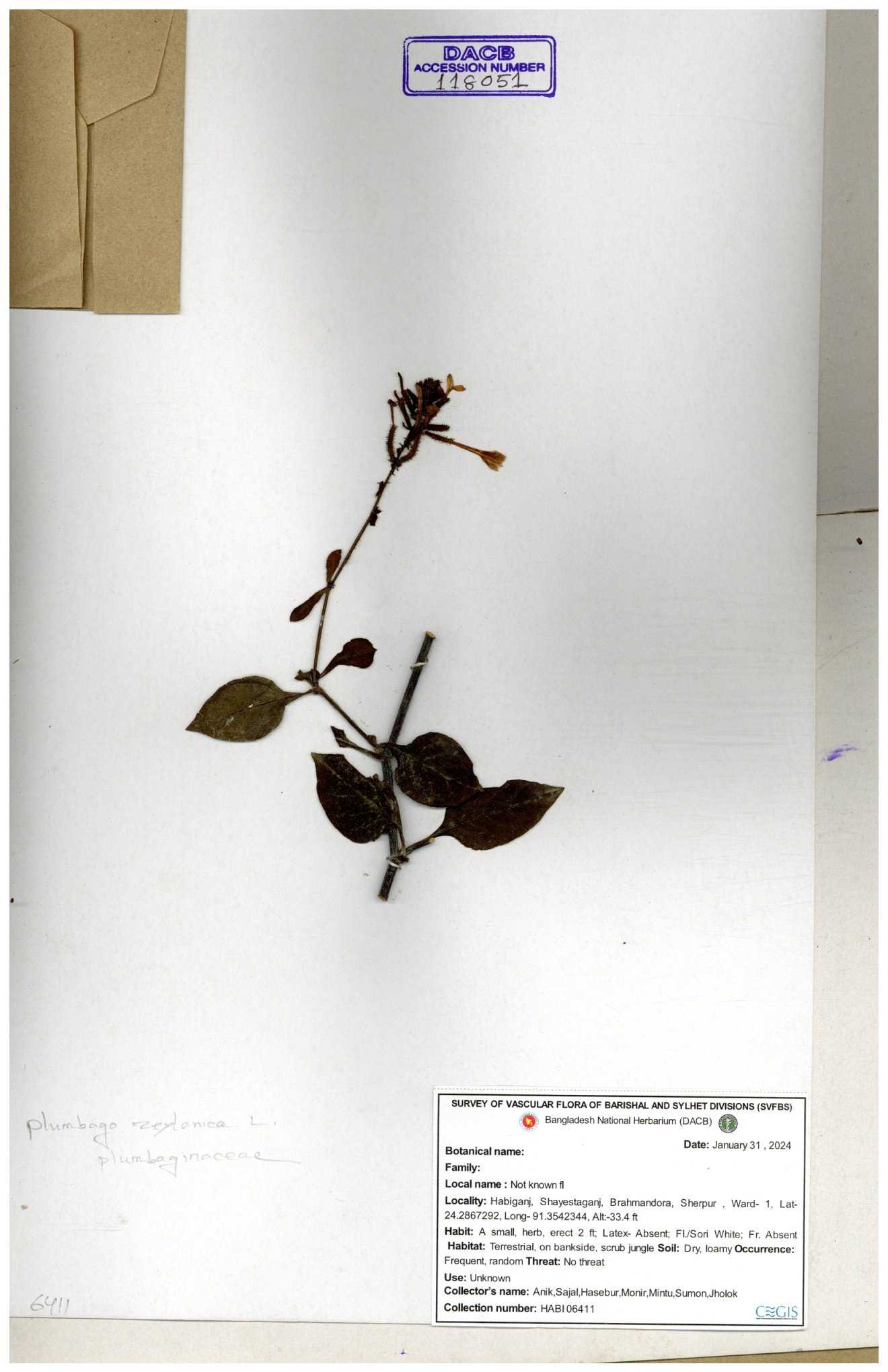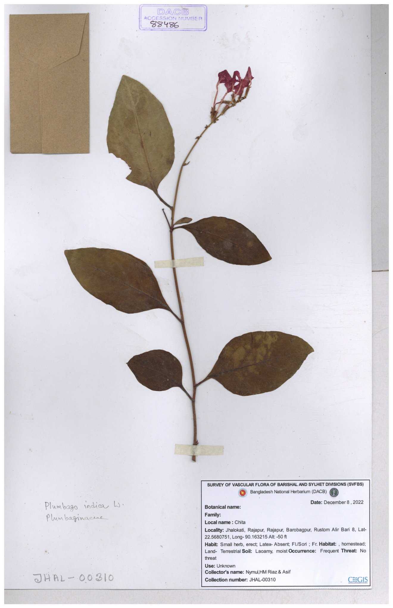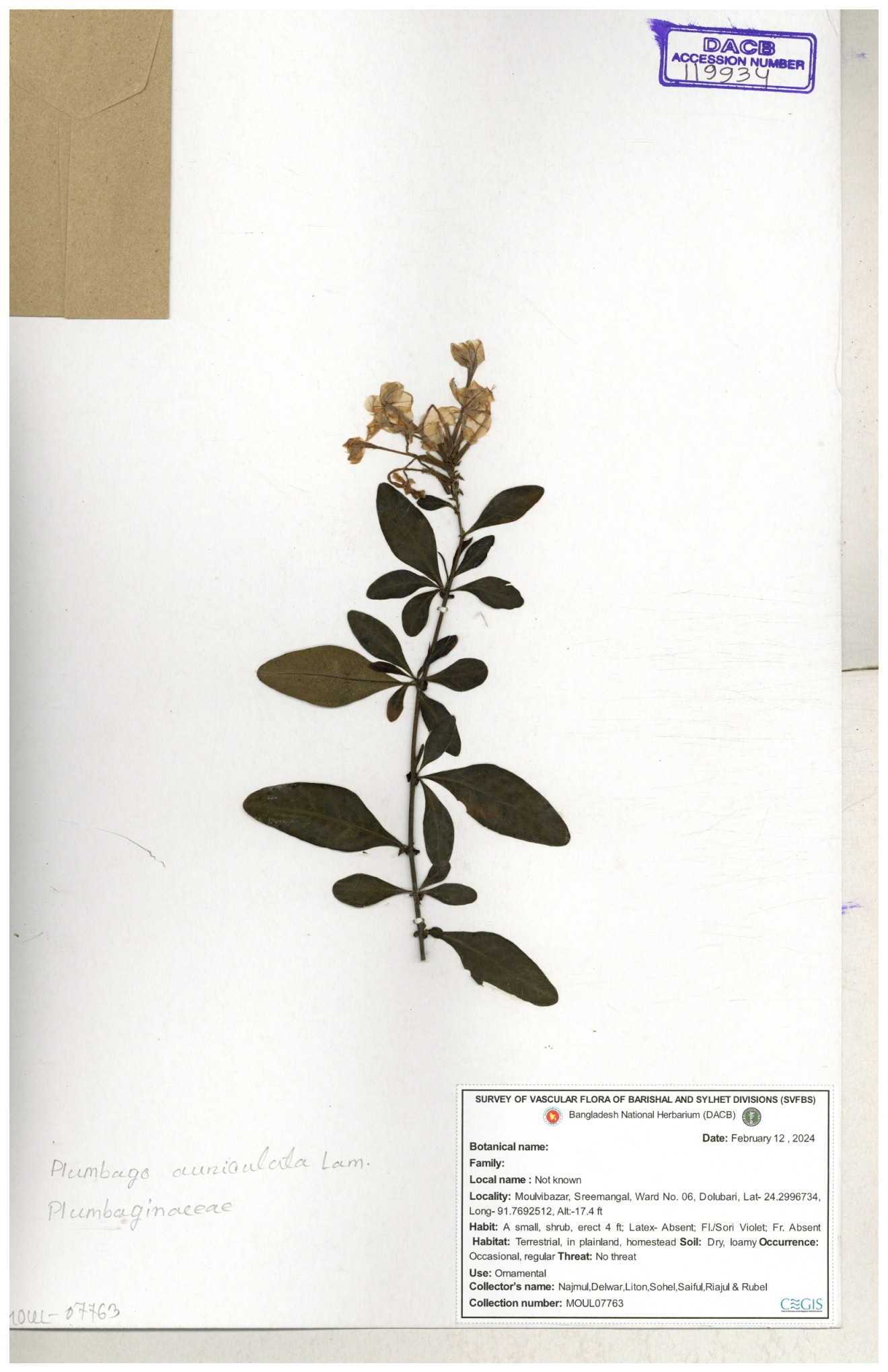 | 66591 | Plumbaginaceae | Plumbago zeylanica L. | Mahbuba Akter | 001 05-11-2019 |