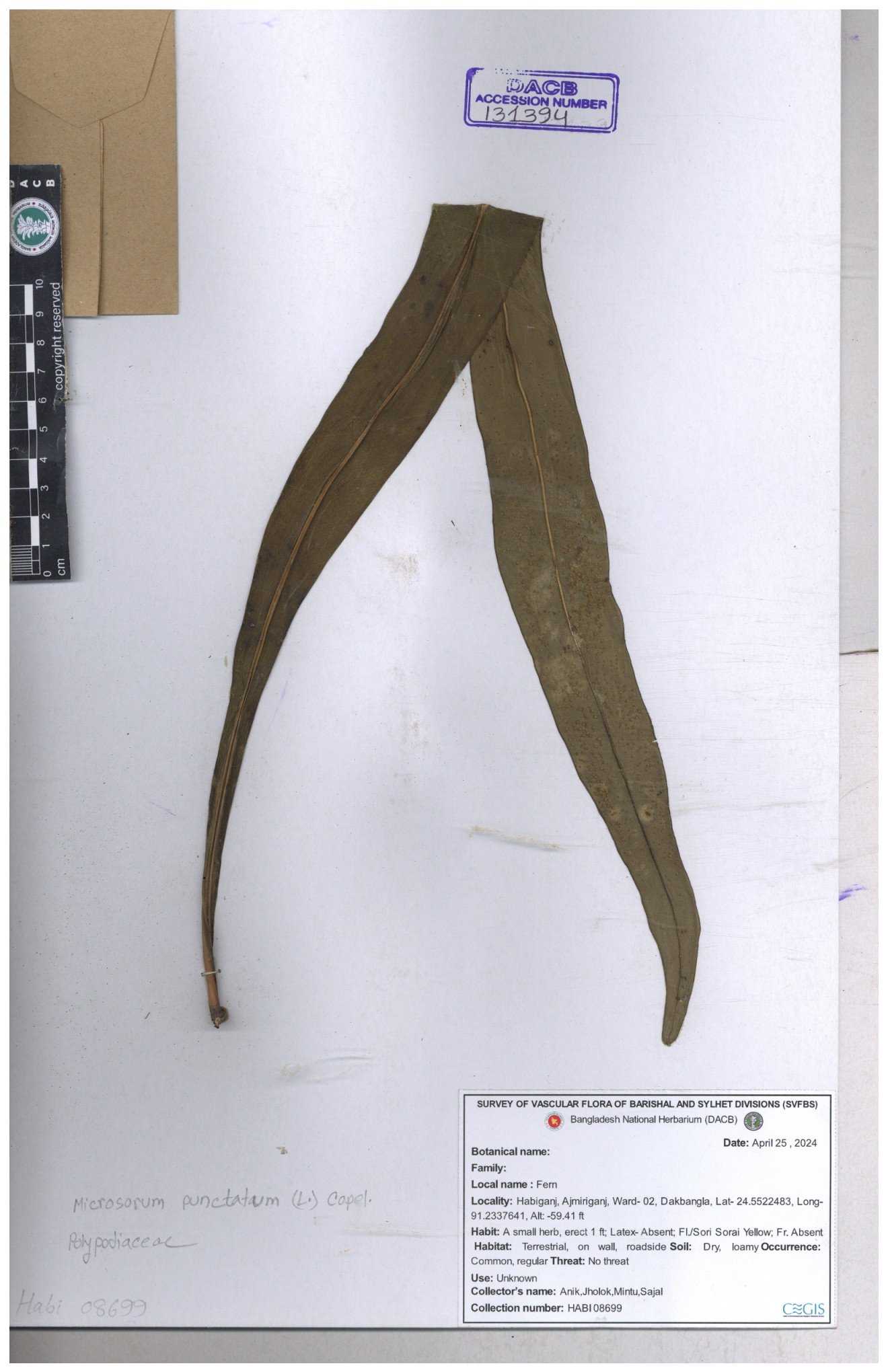 | 57399 | Polypodiaceae | Microsorum punctatum (L.) Copel. | Dr. M Sultana, Dr. S Rahman | DMS-2810 30-11--0001 |