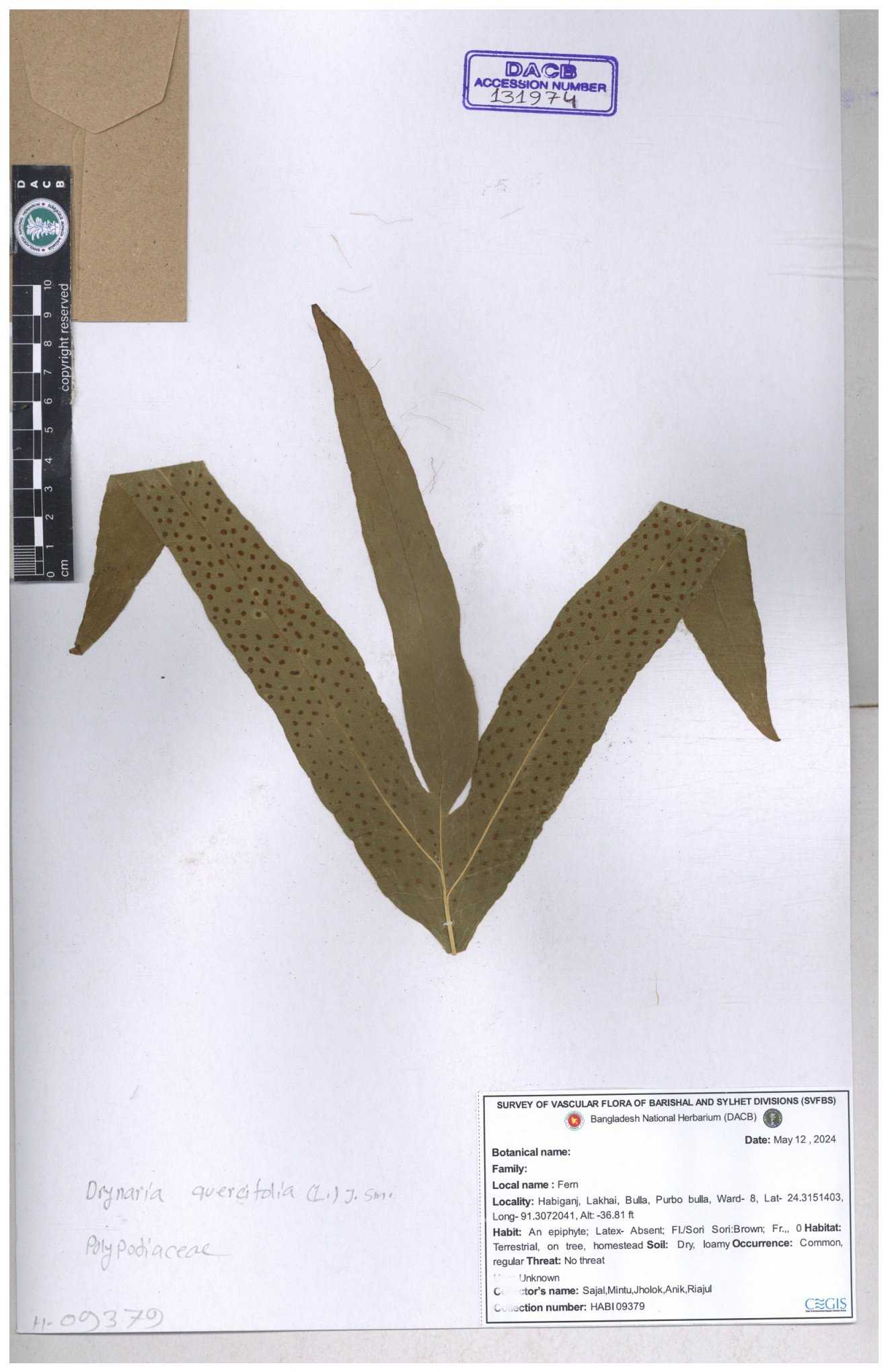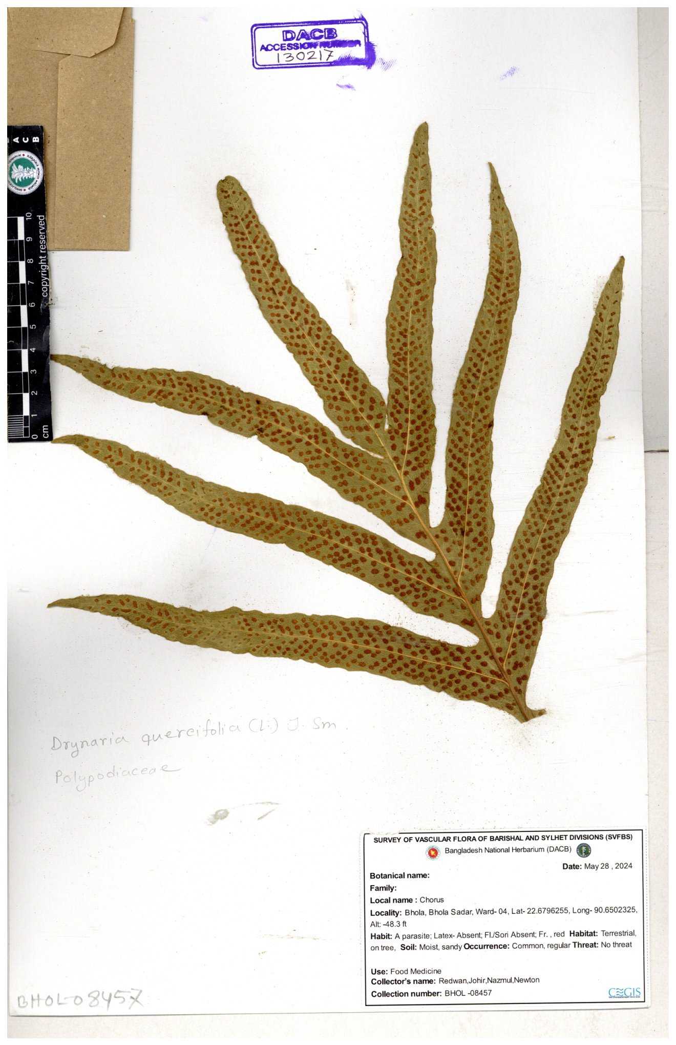 | 134301 | Polypodiaceae | Drynaria quericifolia | Sohan, Zia, Alamin, Saumik, Liton | 30-11--0001 |