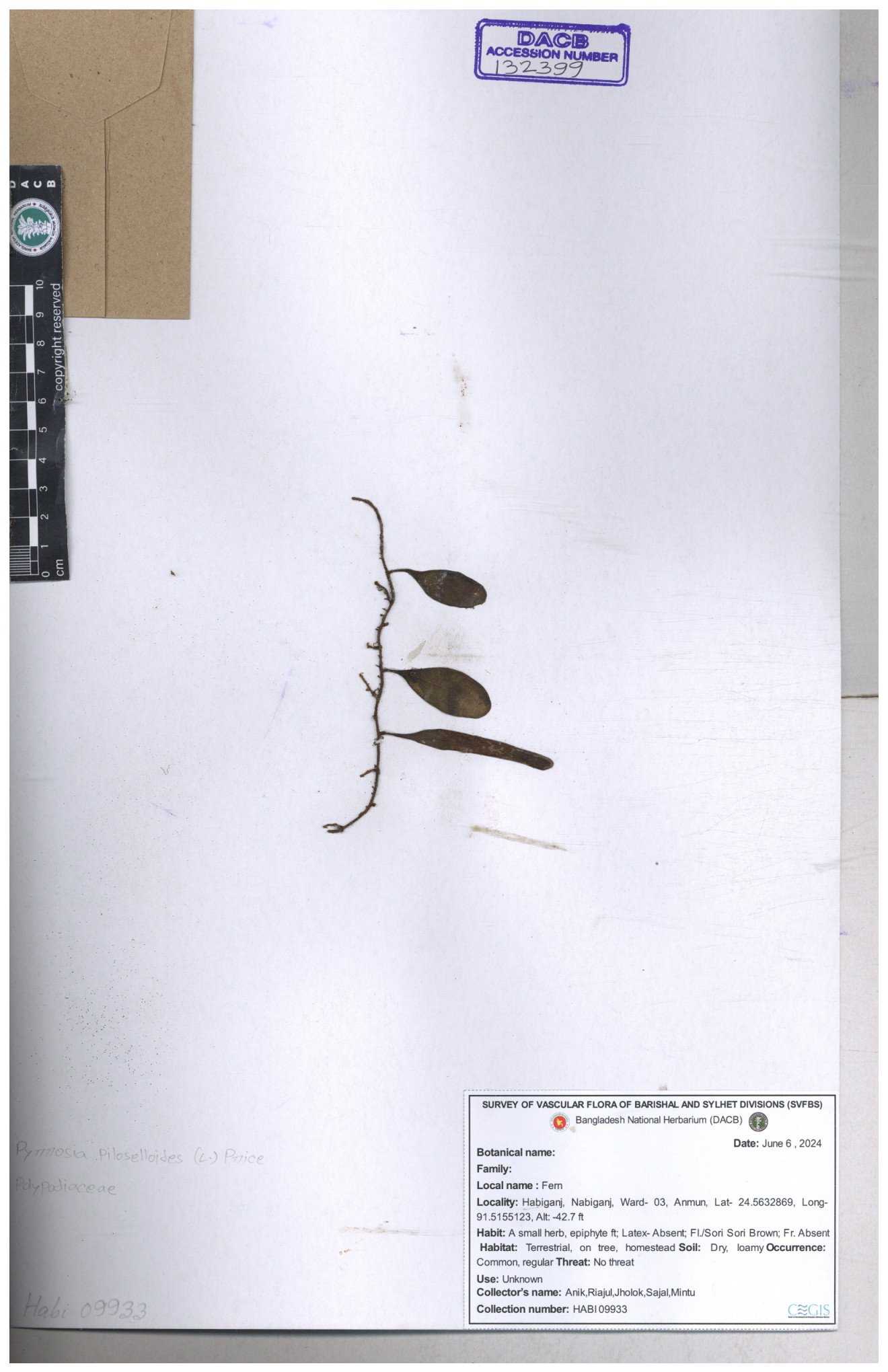 | 57676 | Polypodiaceae | Drymoglossum pilosellinde | Niyamul Kabir, Mehedi Hasan | NK-1014 10-08-2016 |