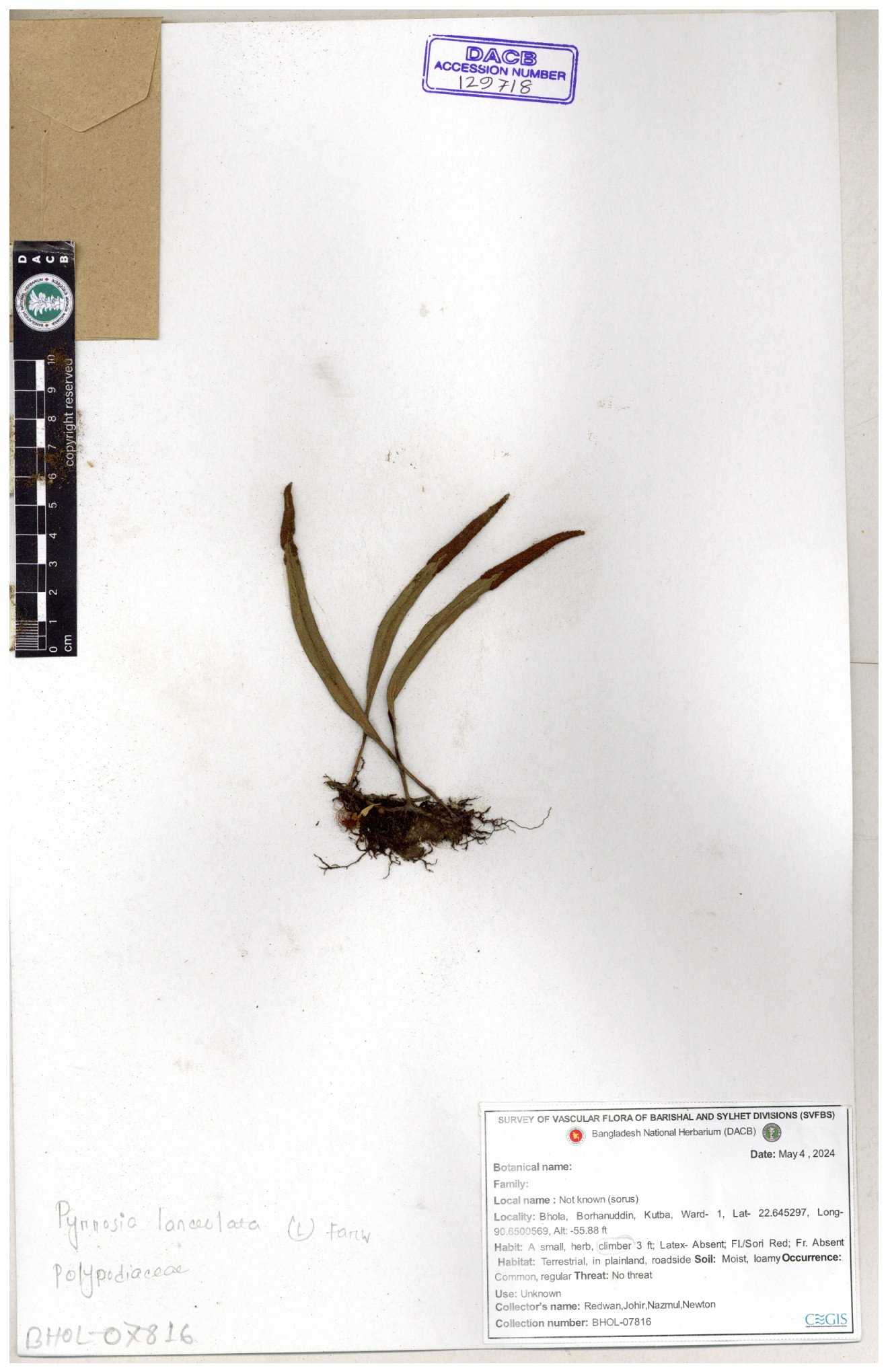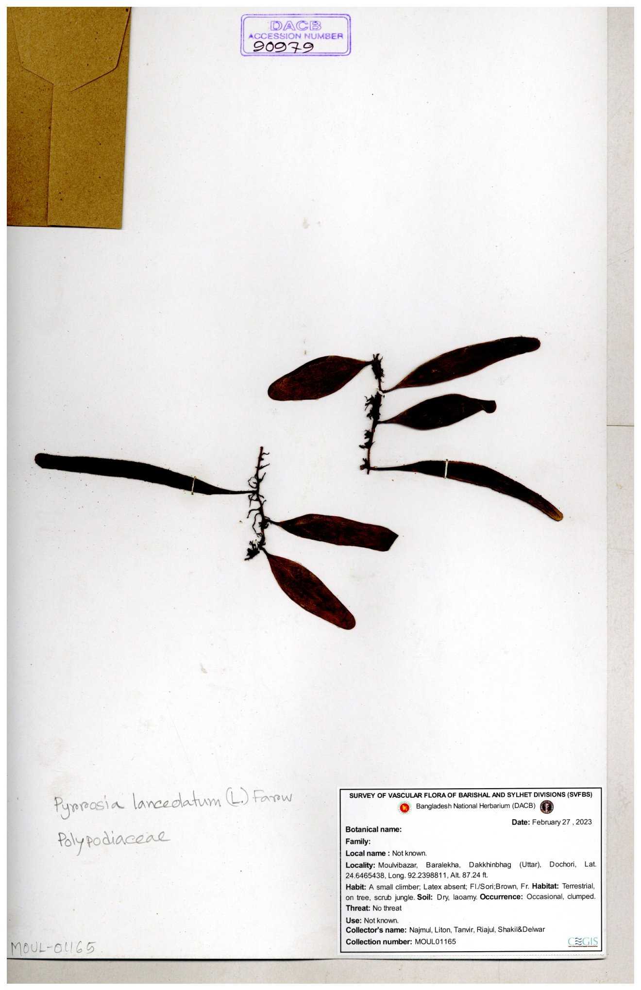 | 66024 | Polypodiaceae | Pyrrosia lanceolatum (L.) Farw. | Khandakar Kamrul Islam | KKI-3962 12-02-2020 |