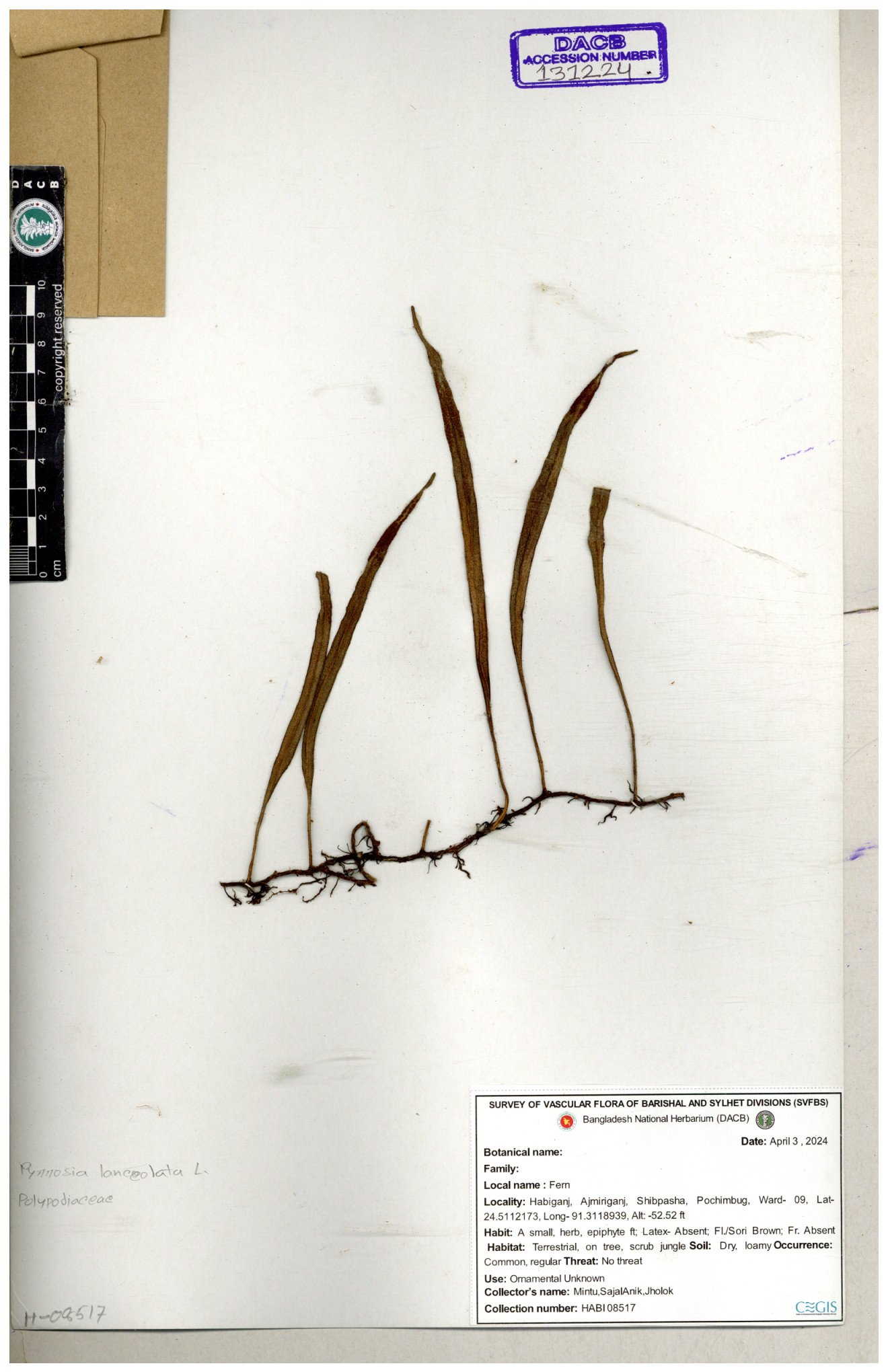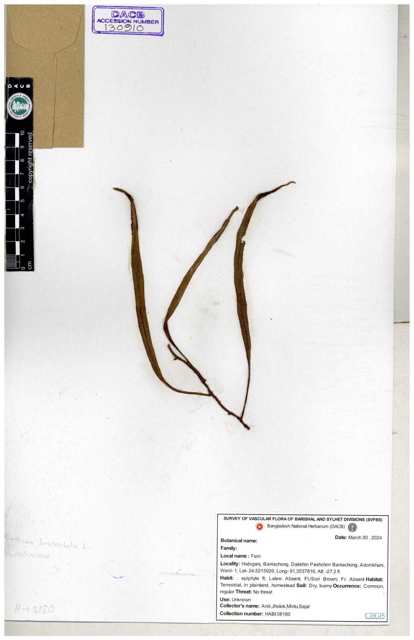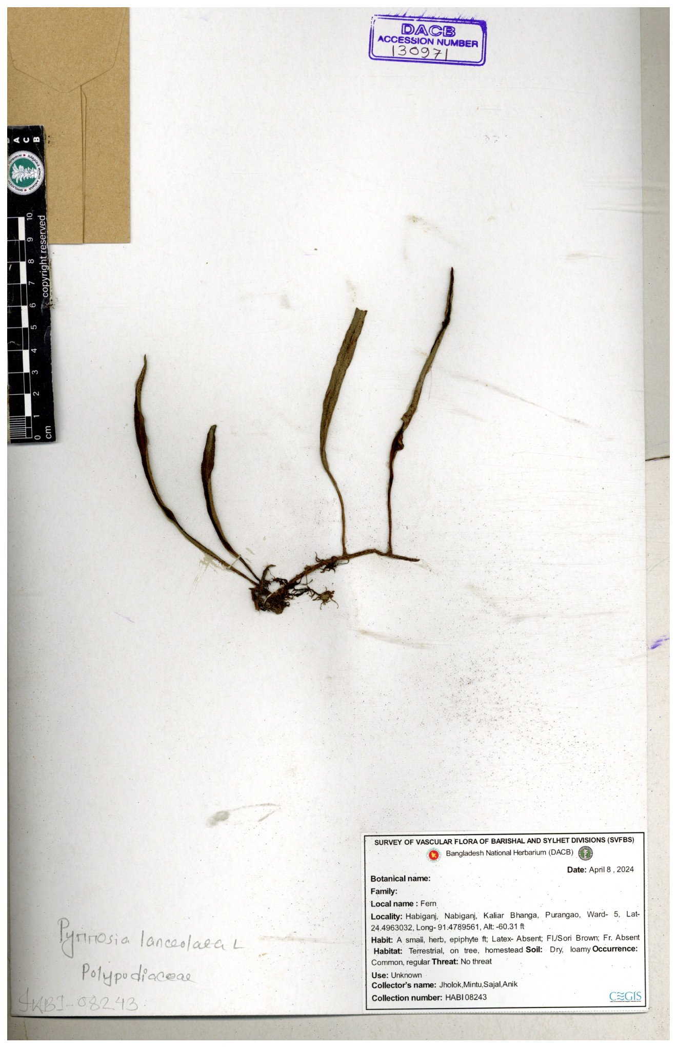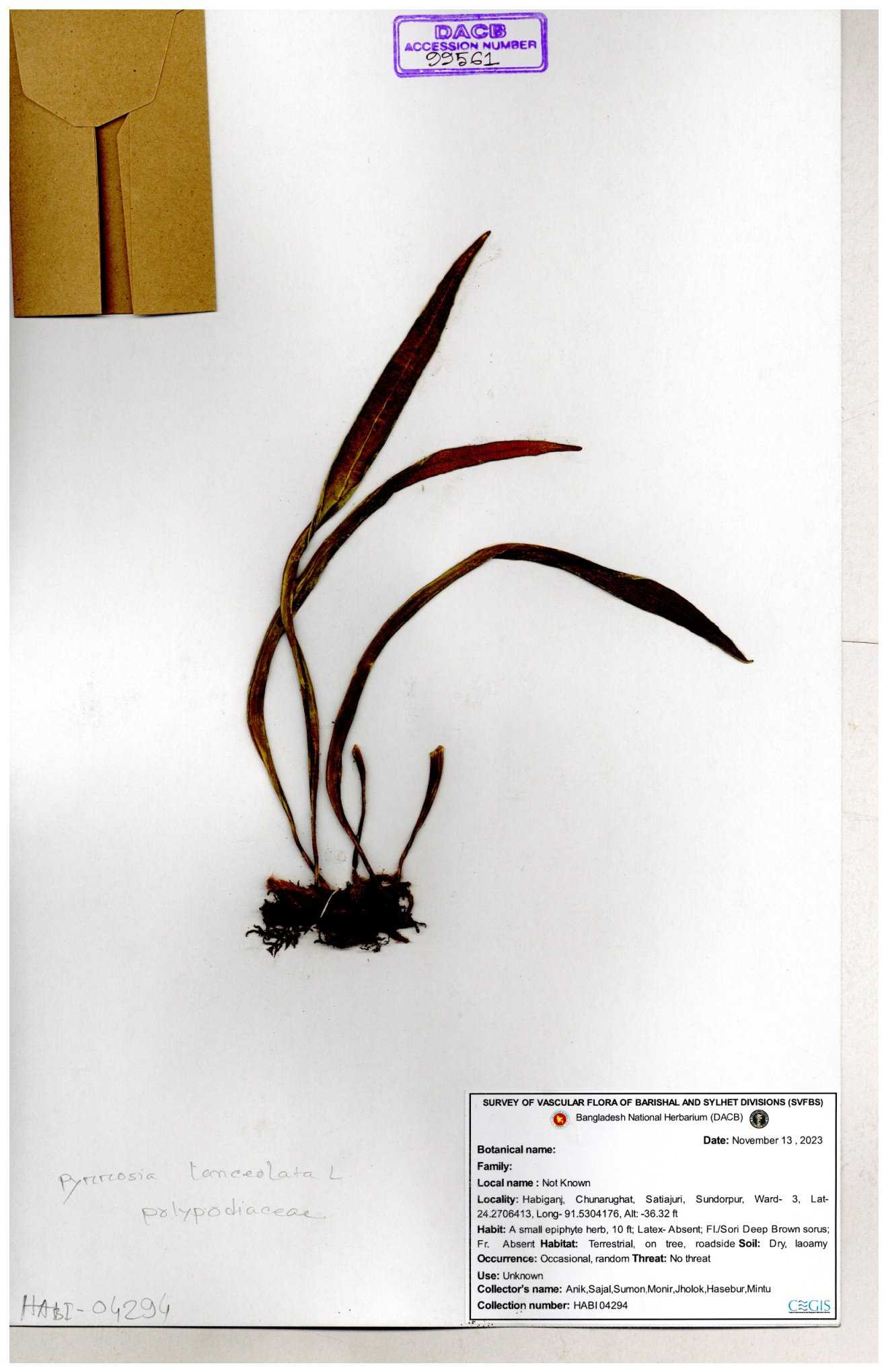 | 130637 | Polypodiaceae | Pyrrosia lanceolata | Anik, Jholok, Mintu, Sajal | 30-11--0001 |