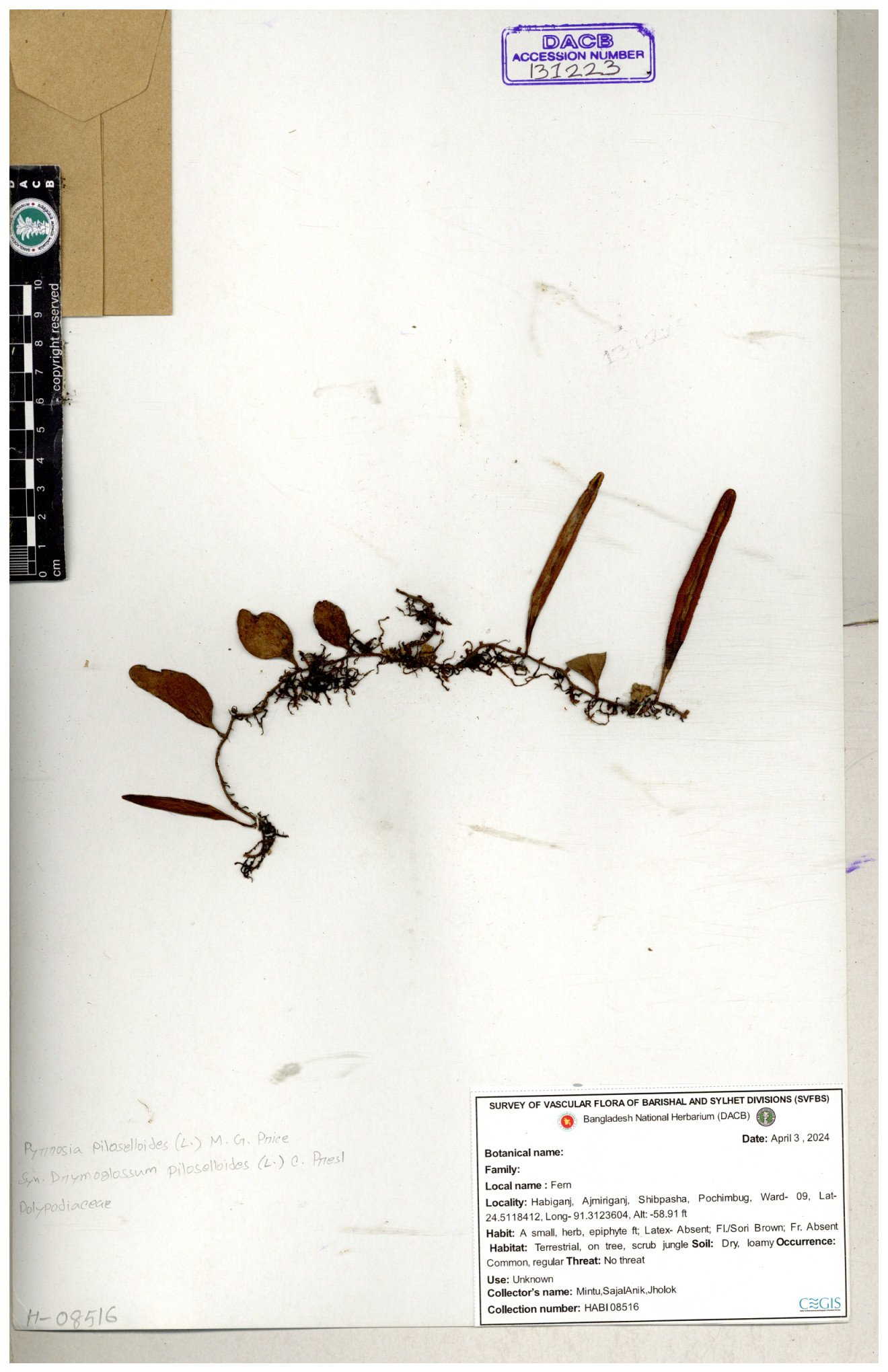 | 51013 | Polypodiaceae | Drymoglossum piloselloides (L.) C. Presl | Tajul, Owahid &Kawsar | TOK-289 30-11--0001 |